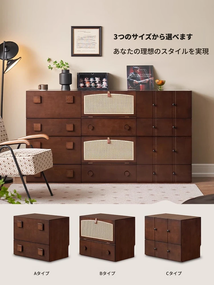 レトロな無垢材の九斗箪笥 - おしゃれな収納キャビネット!リビングの壁際にぴったりのコンパクトなサイドボード。使い勝手抜群で、魅力的なデザインが空間を引き立てます!