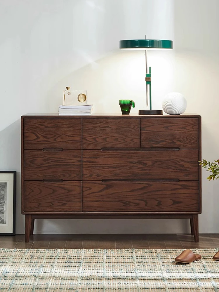 オリジナルエレメント無垢材のシンプルな7段チェスト - ブラックウォールナット色、寝室やリビングに最適なオーク製収納キャビネット!洗練されたデザインで、生活空間をスタイリッシュに演出します。