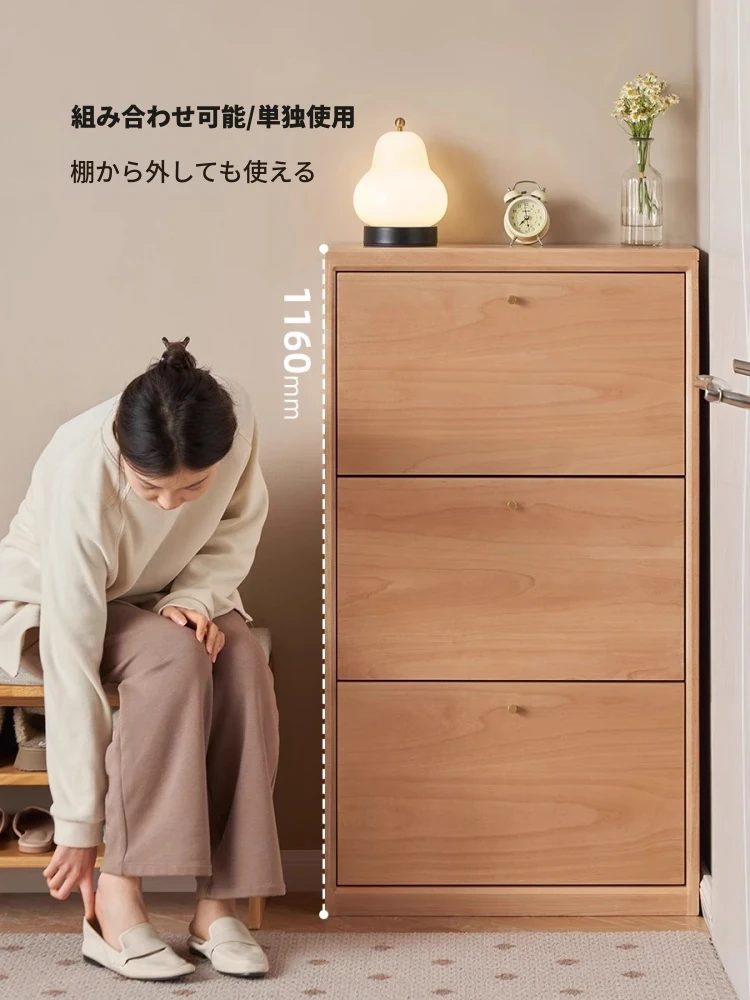 オリジナルエレメンツ無垢材スリムシューズキャビネット、翻転ドアで多層収納!玄関や入居時に最適なコートハンガーも兼ね備えたおしゃれなシューズラック。狭いスペースにもぴったりフィット!