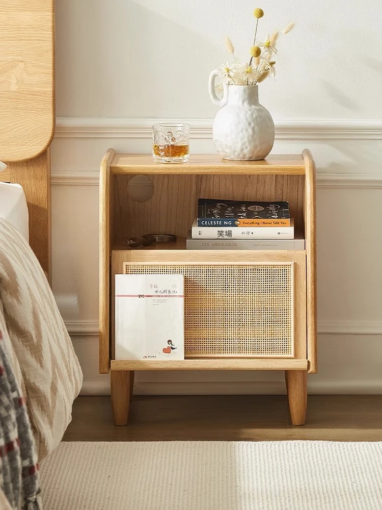オーガニックホワイトオークナイトテーブル - 北欧スタイルのエコ木製収納キャビネット、ラタン編みの収納サイドキャビネットで、お部屋をスッキリ整理!