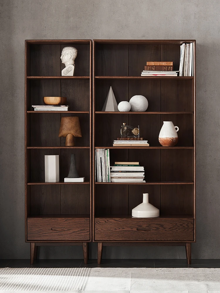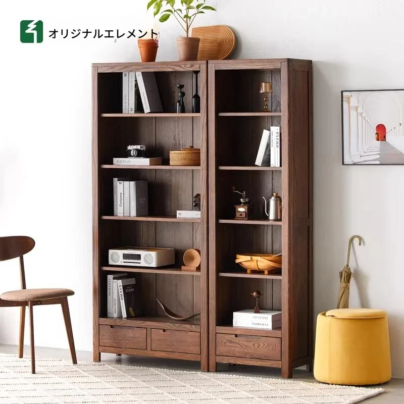 原木の風合いを楽しむ!全実木のオーク&ウォールナット製書棚 - 北欧スタイルの書斎にぴったりな収納力抜群のディスプレイキャビネット。美しいデザインでお部屋を彩ります!