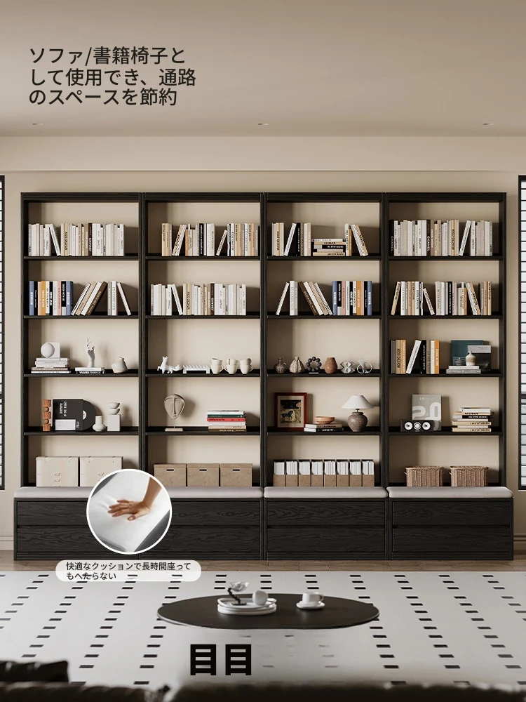 全実木製の書棚兼用ベンチ!天井までの一体型オーク製フロア展示キャビネット。リビングにぴったりのフルウォール書架で、デザイン性と収納力を両立!おしゃれで機能的な空間を演出します。