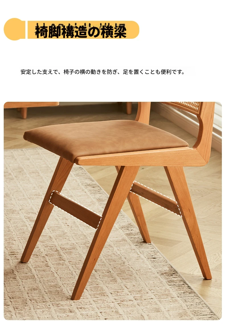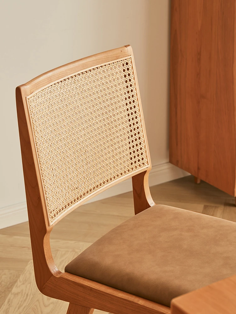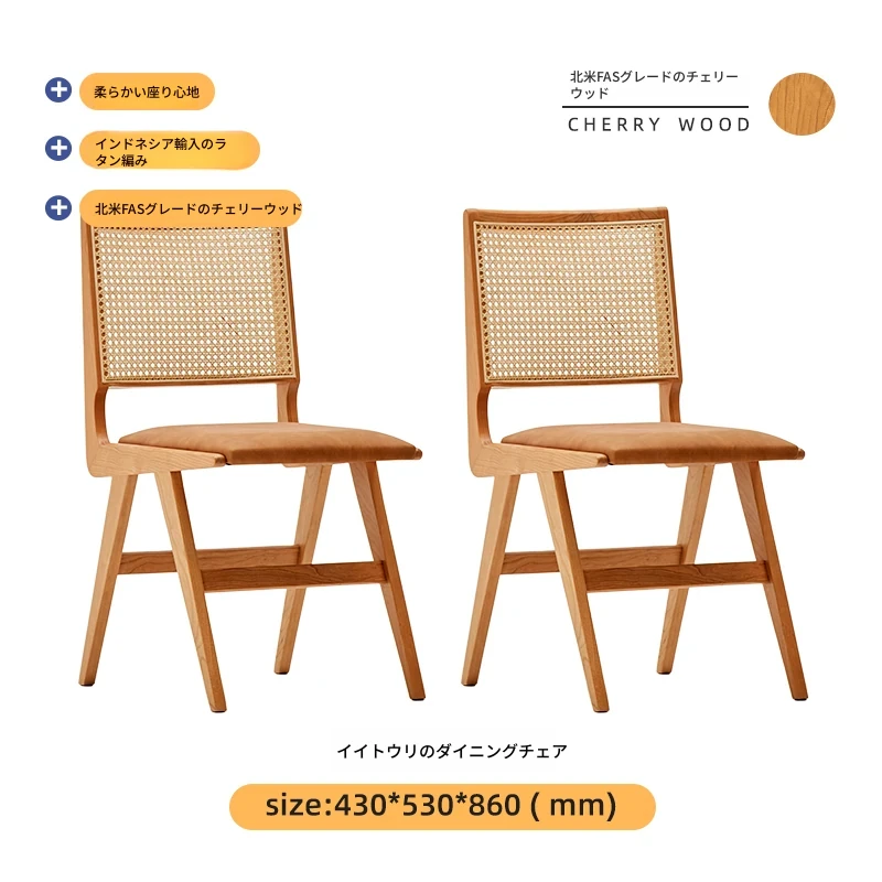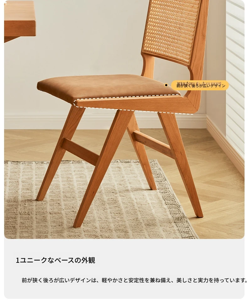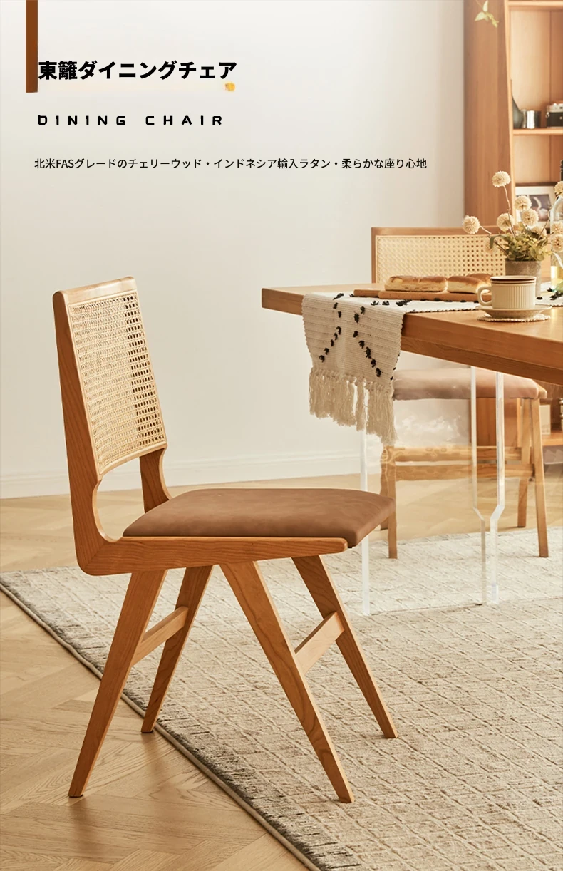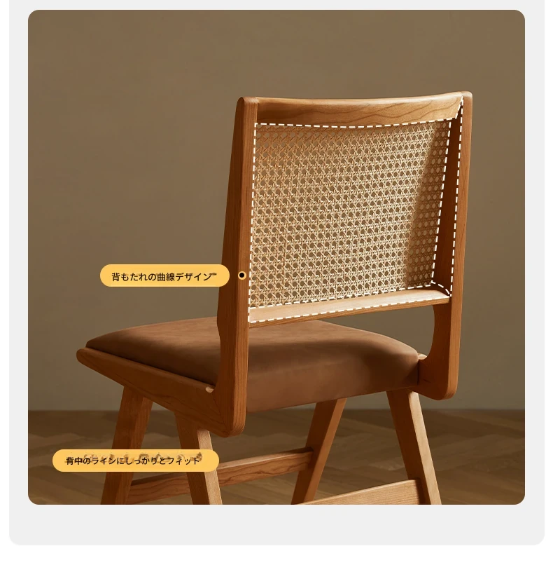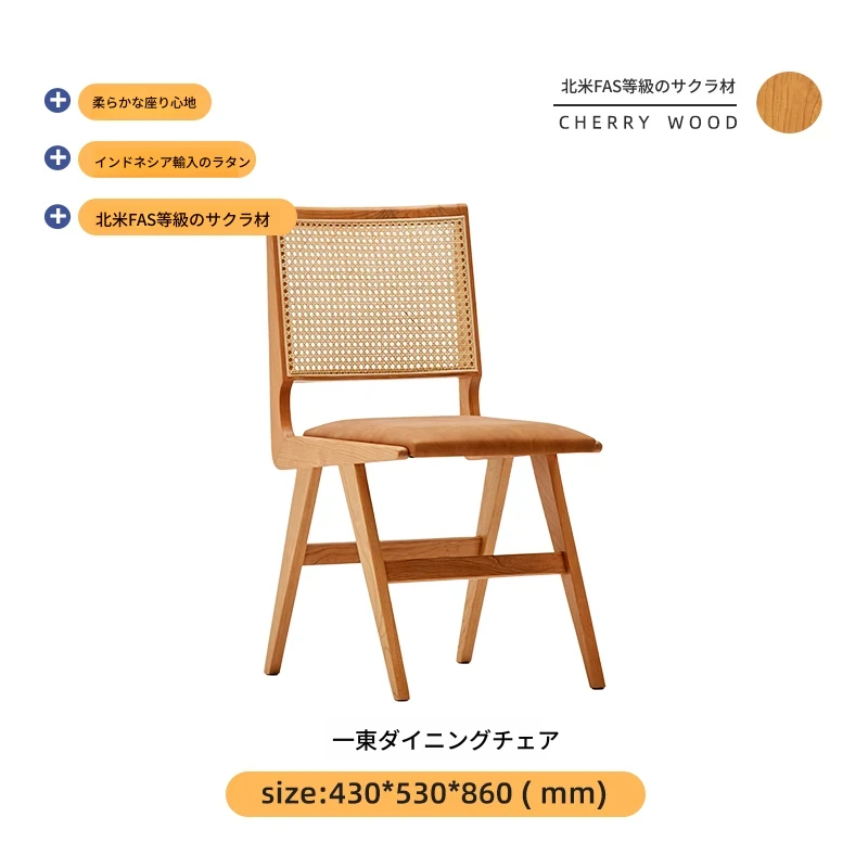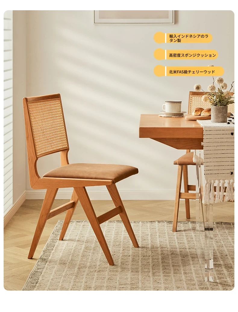 原木の北欧侘寂スタイル、チェリーウッドの背もたれ付きダイニングチェア - 小規模住宅に最適な通気性の高いラタン製リラックスチェア!おしゃれで心地よい空間を演出します。