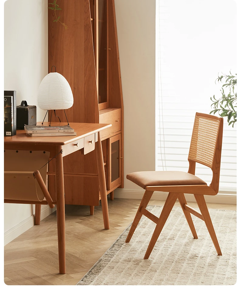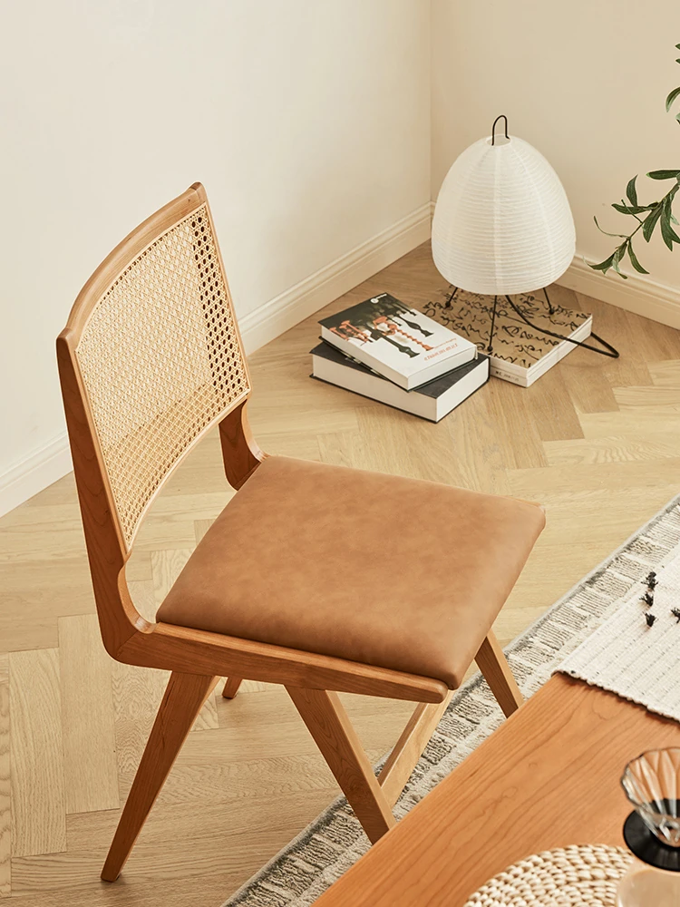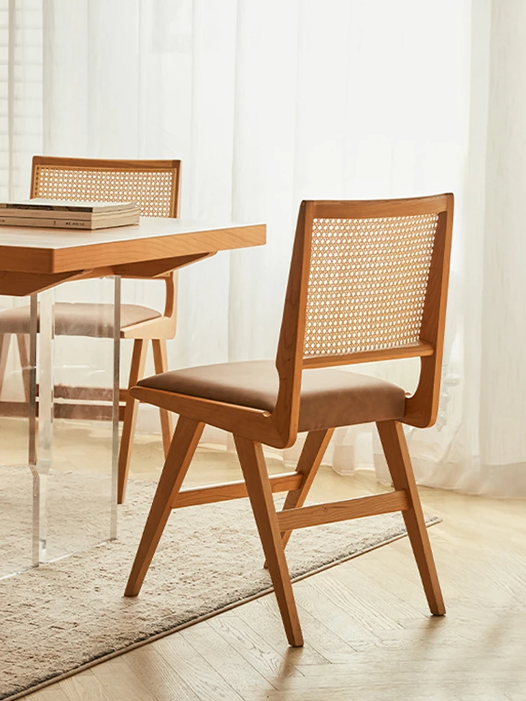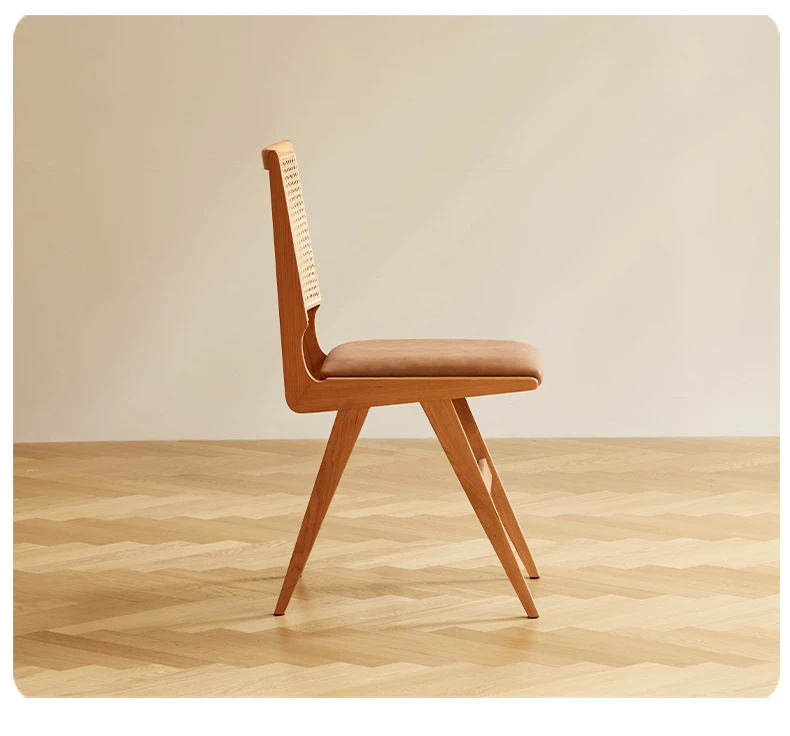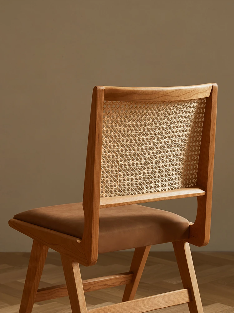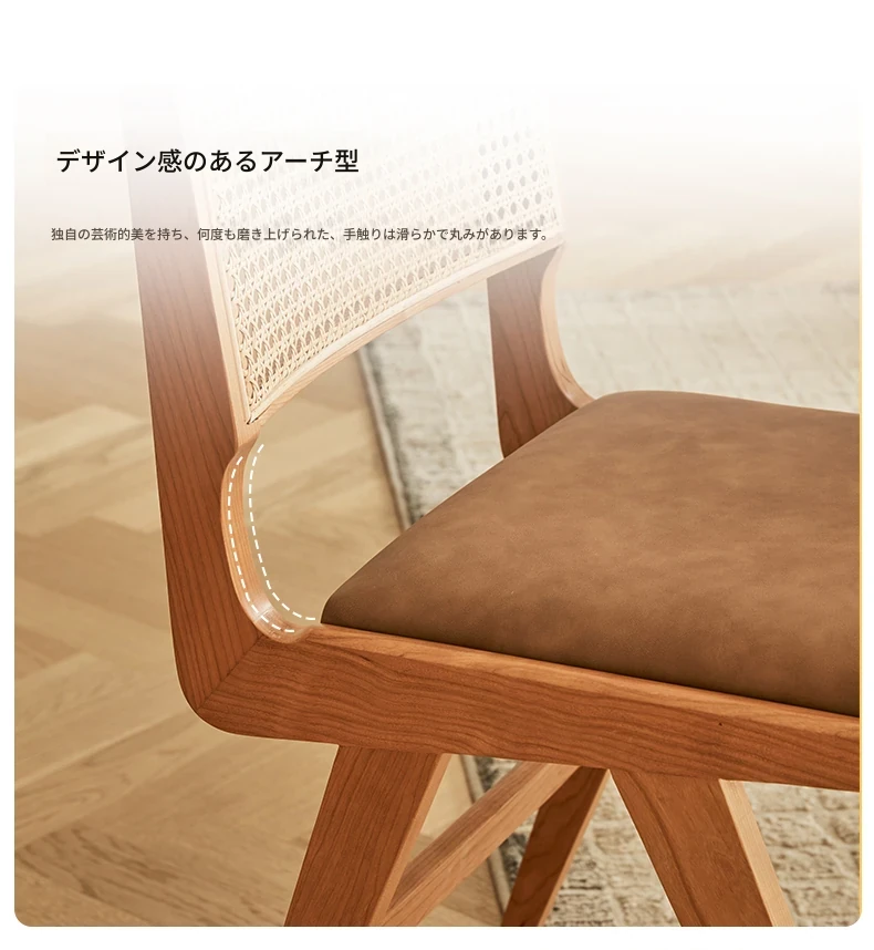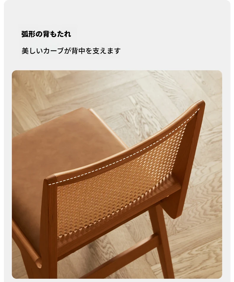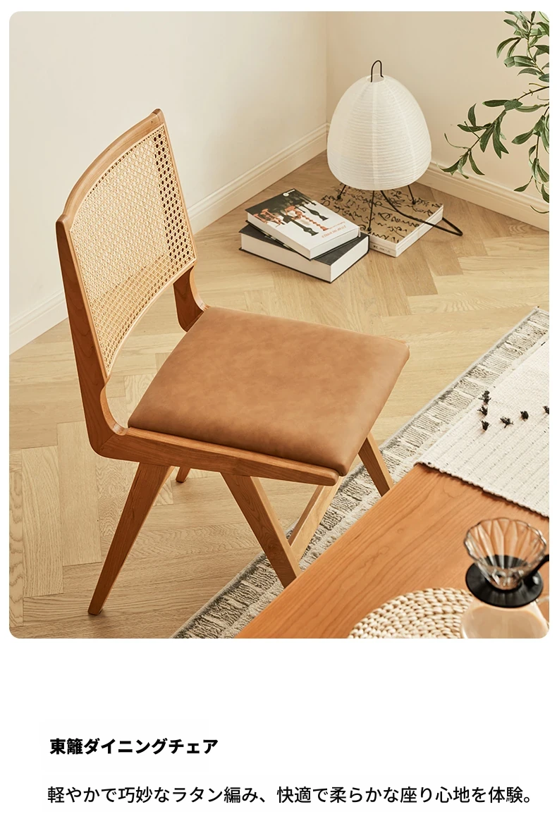 原木の北欧侘寂スタイル、チェリーウッドの背もたれ付きダイニングチェア - 小規模住宅に最適な通気性の高いラタン製リラックスチェア!おしゃれで心地よい空間を演出します。