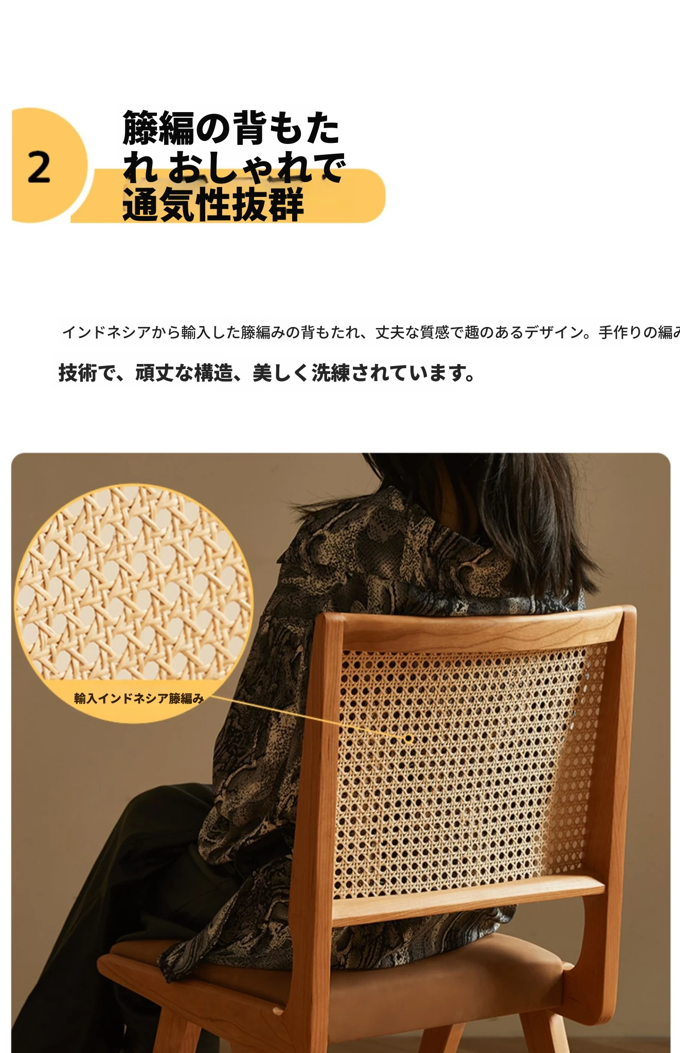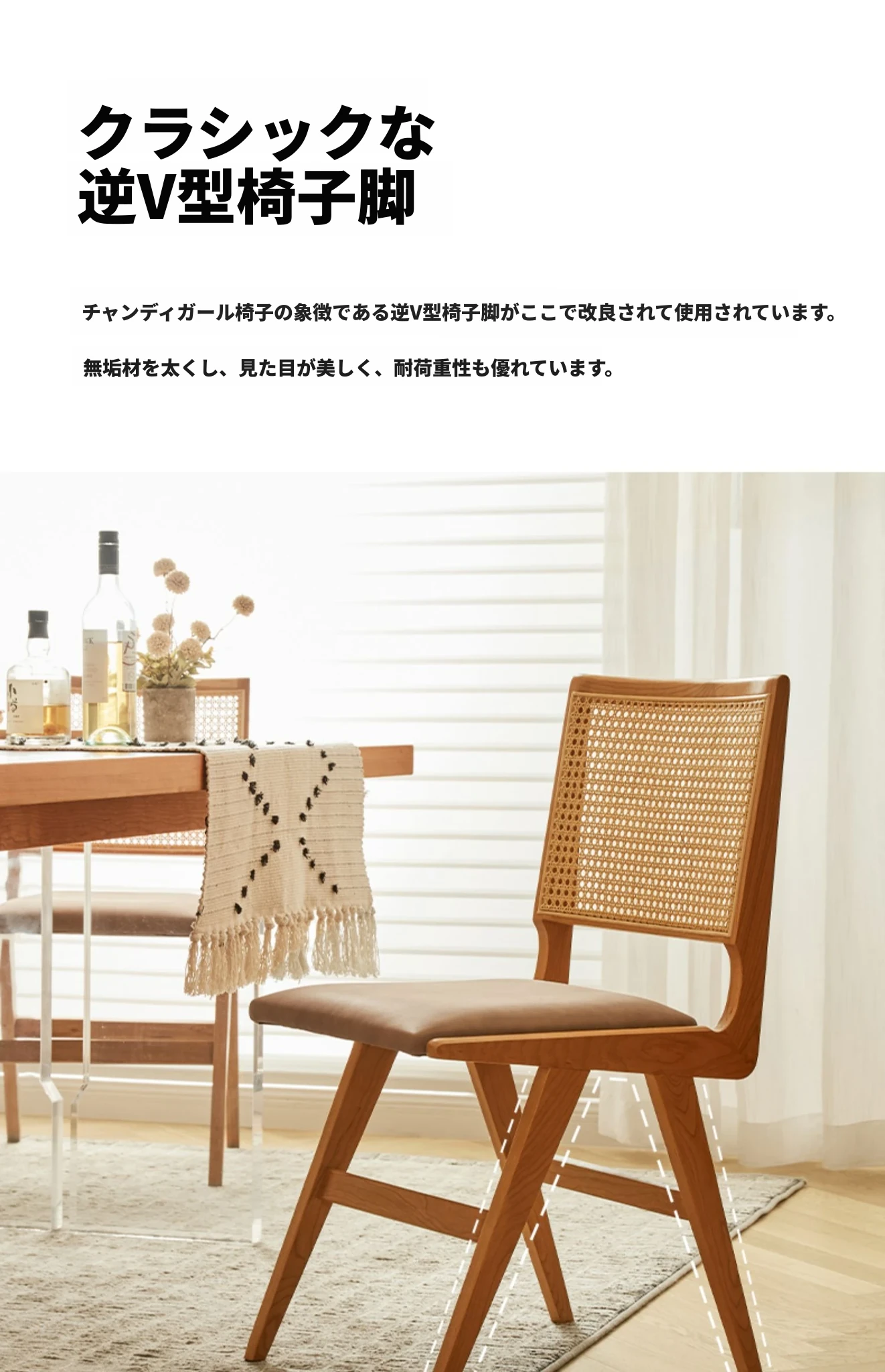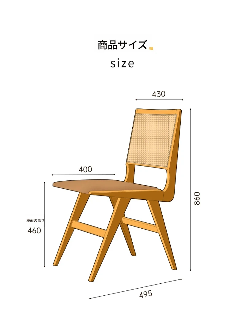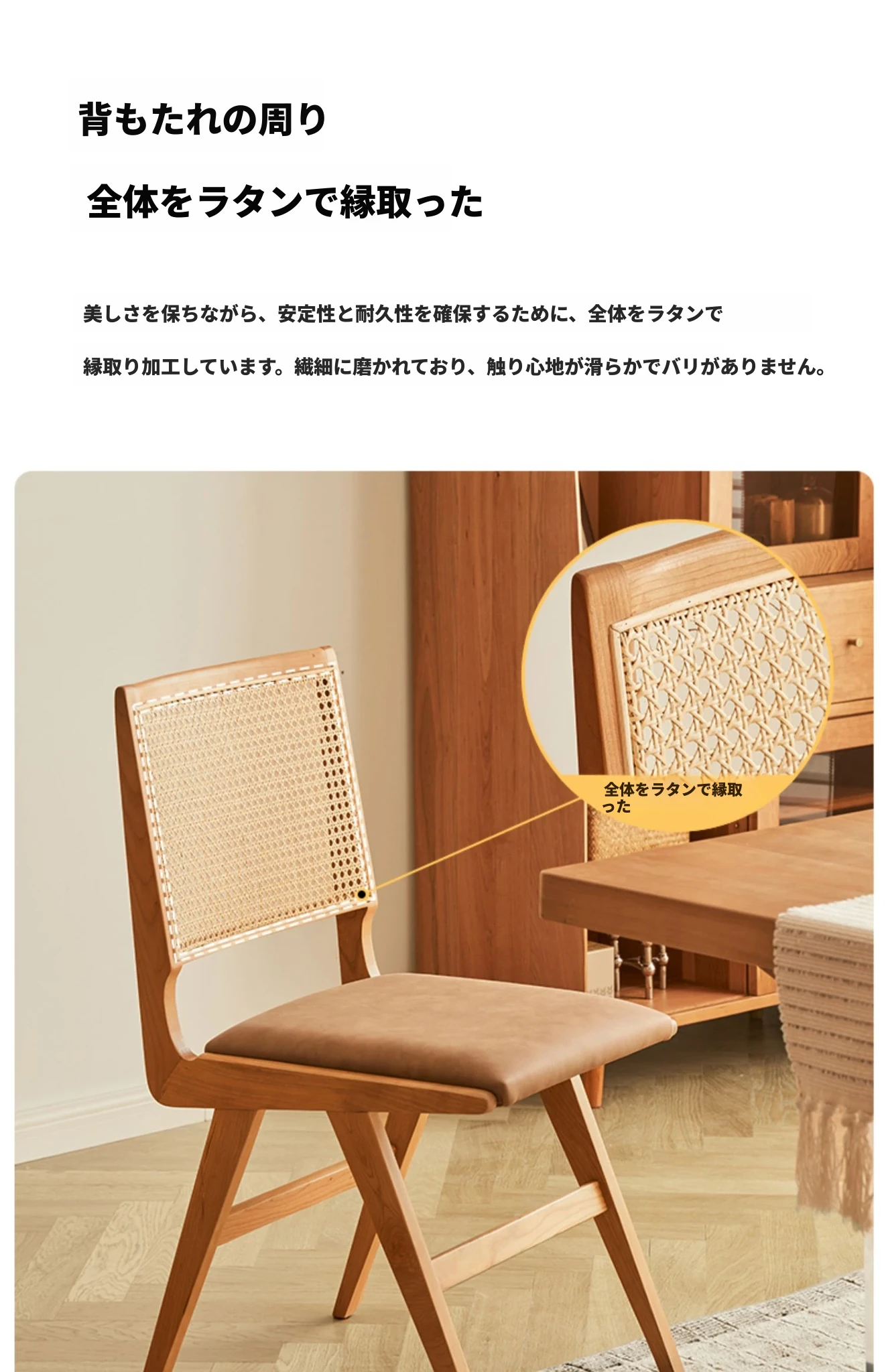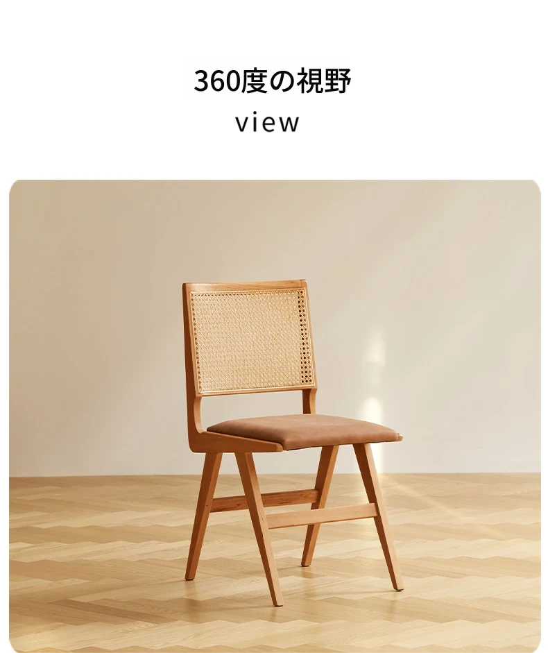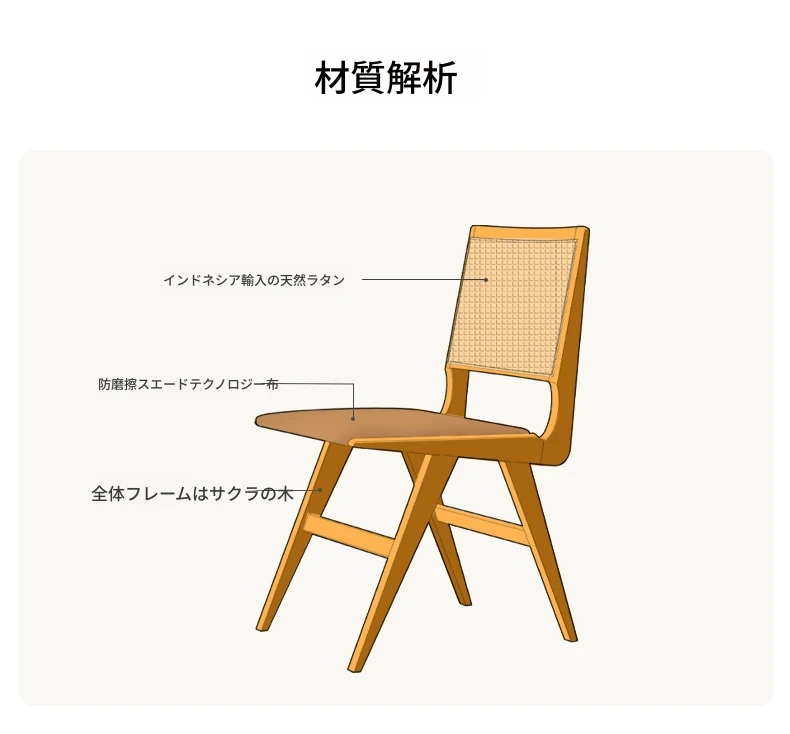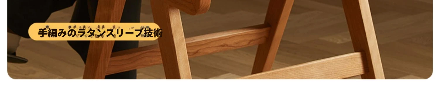 原木の北欧侘寂スタイル、チェリーウッドの背もたれ付きダイニングチェア - 小規模住宅に最適な通気性の高いラタン製リラックスチェア!おしゃれで心地よい空間を演出します。