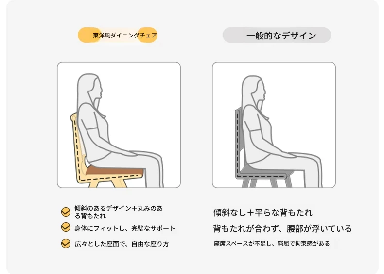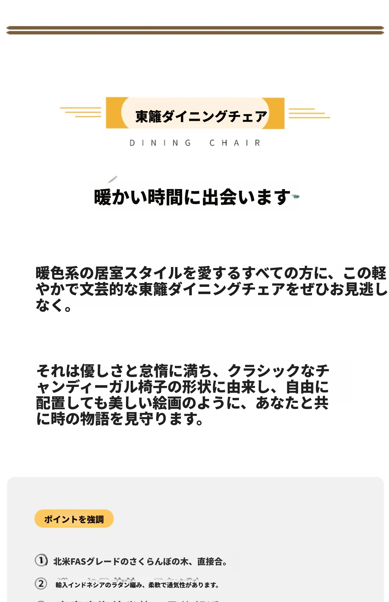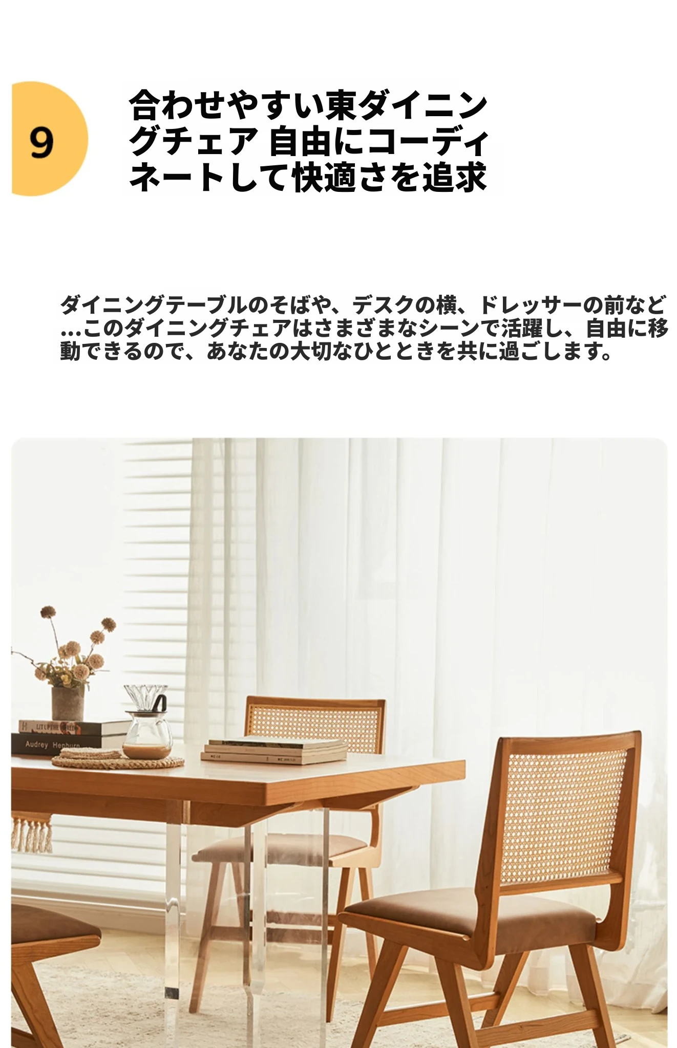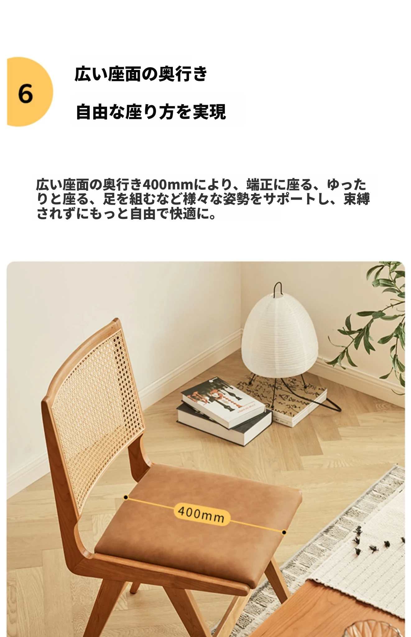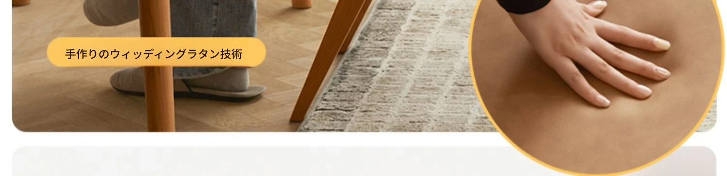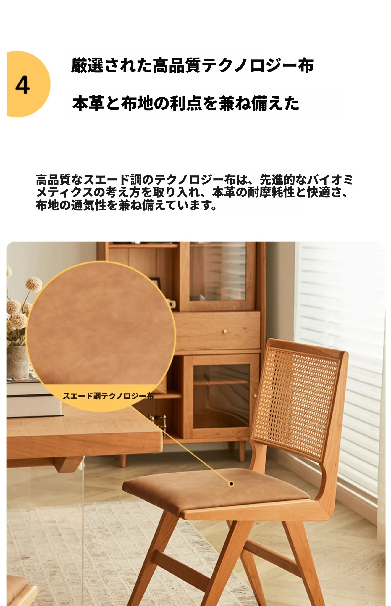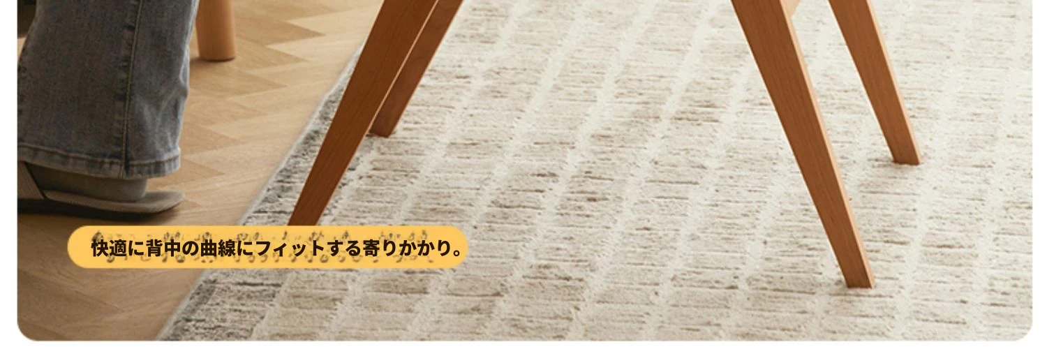 原木の北欧侘寂スタイル、チェリーウッドの背もたれ付きダイニングチェア - 小規模住宅に最適な通気性の高いラタン製リラックスチェア!おしゃれで心地よい空間を演出します。