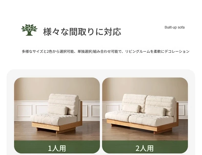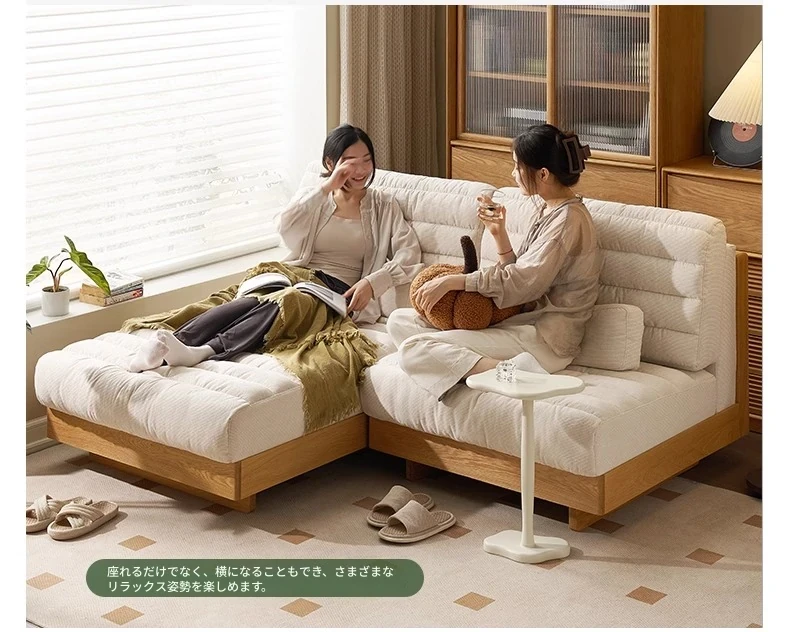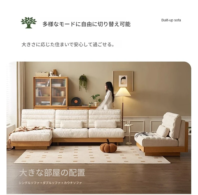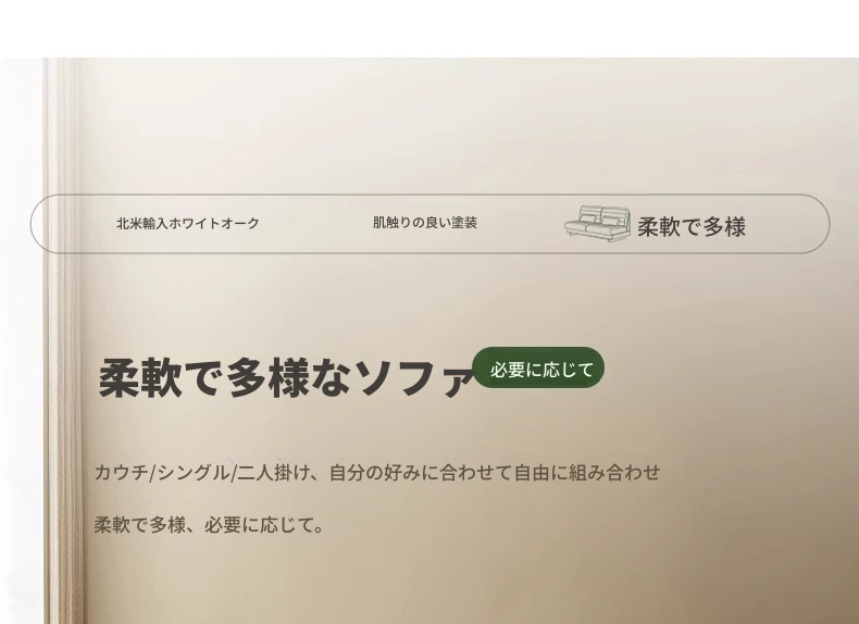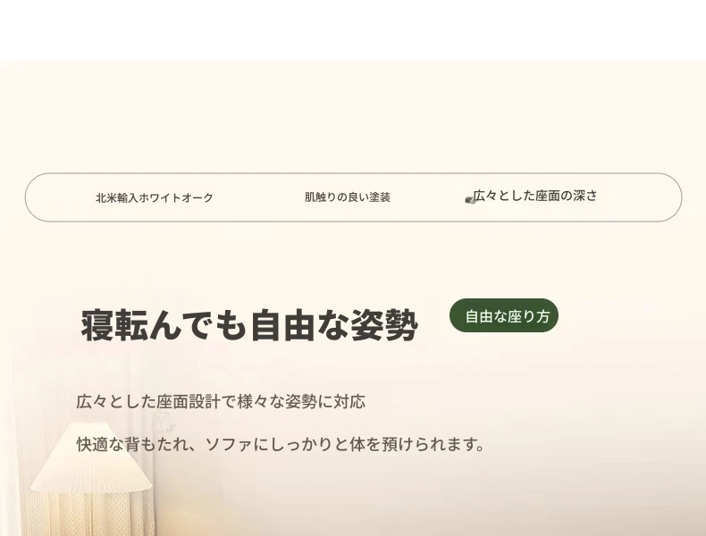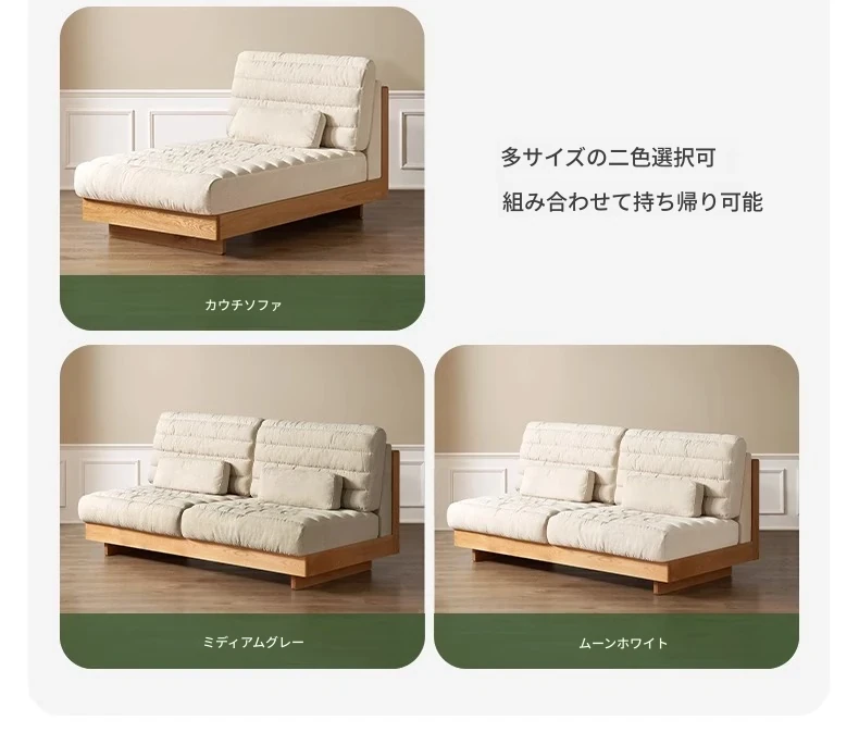 ナチュラルエレガンス!小スペースに最適な無垢材ソファ。クリームカラーの布張り、ホワイトオークの三人掛け。モダンでシンプルなデザインで、あなたのリビングに洗練された雰囲気を!
