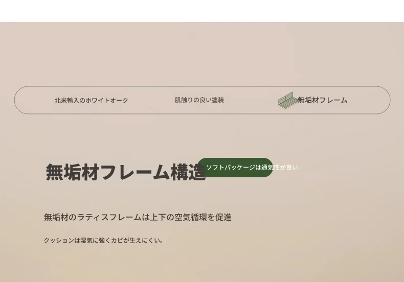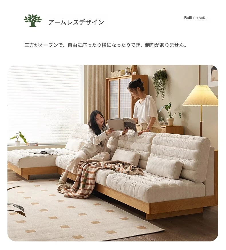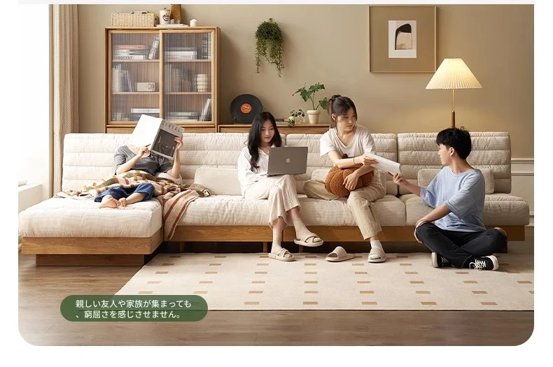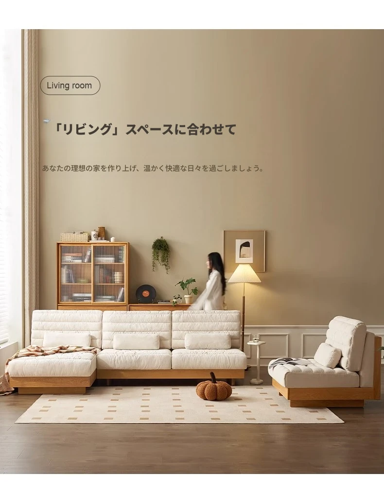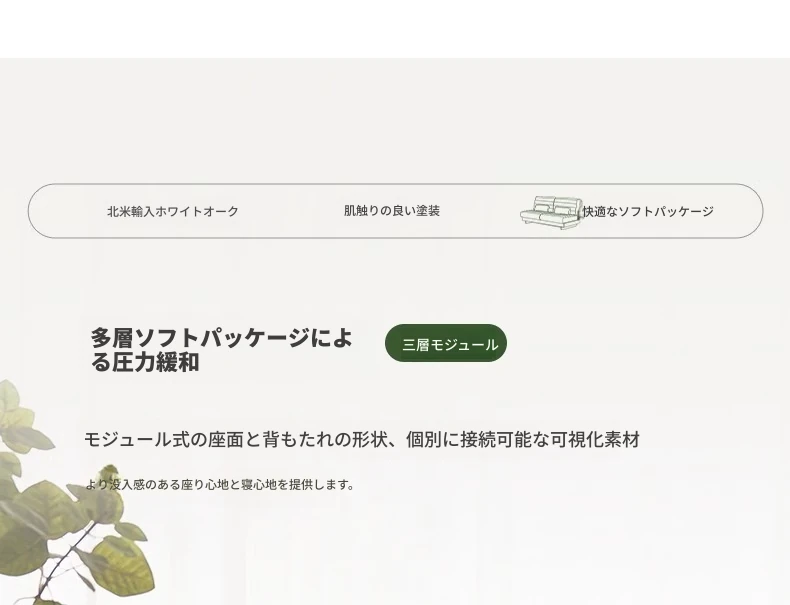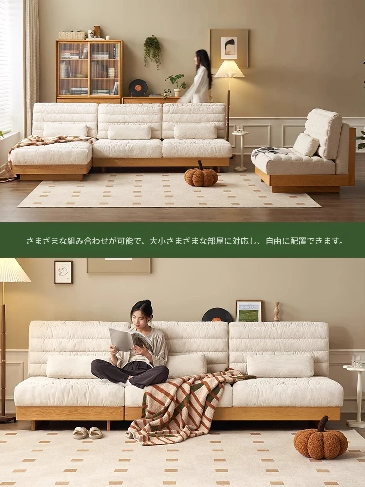ナチュラルエレガンス!小スペースに最適な無垢材ソファ。クリームカラーの布張り、ホワイトオークの三人掛け。モダンでシンプルなデザインで、あなたのリビングに洗練された雰囲気を!