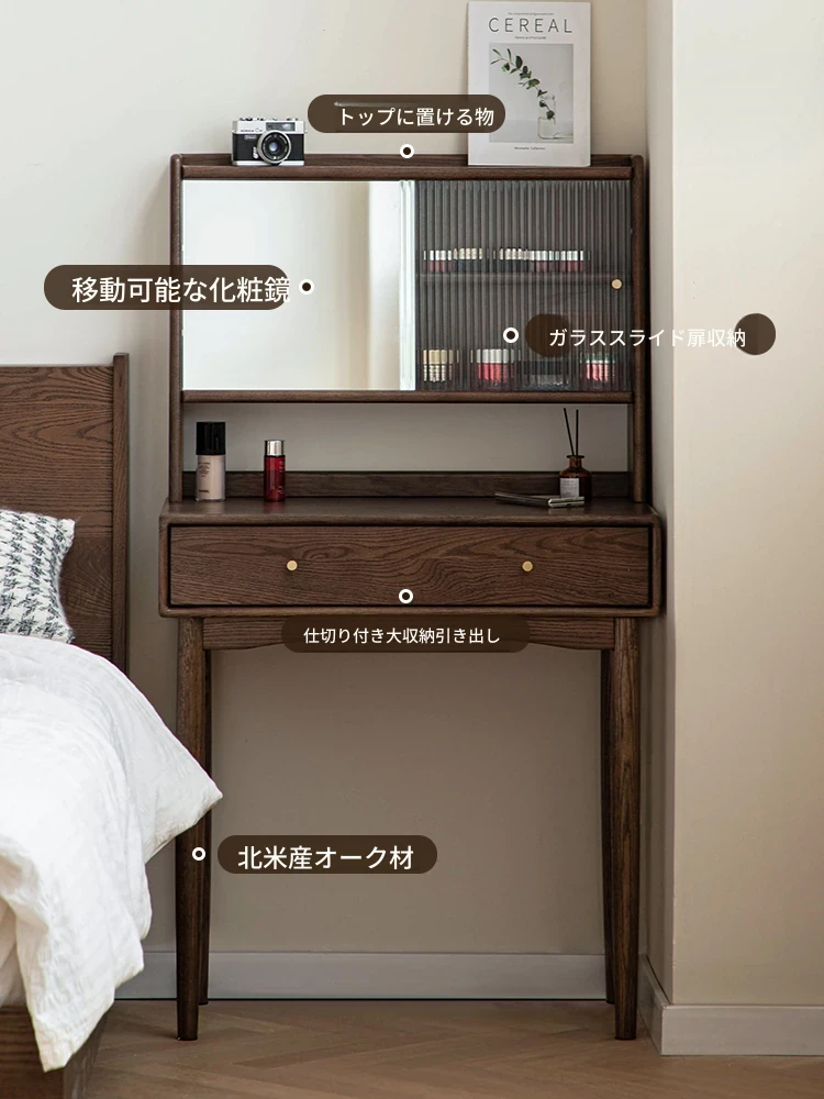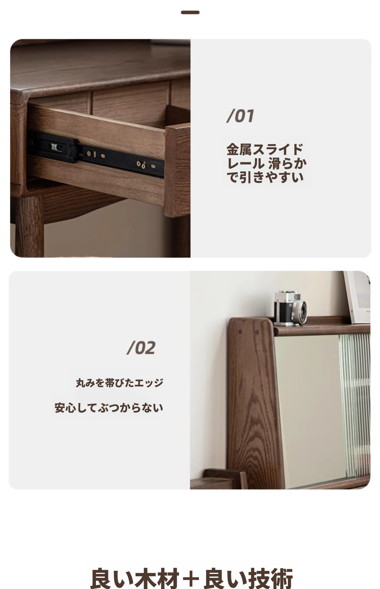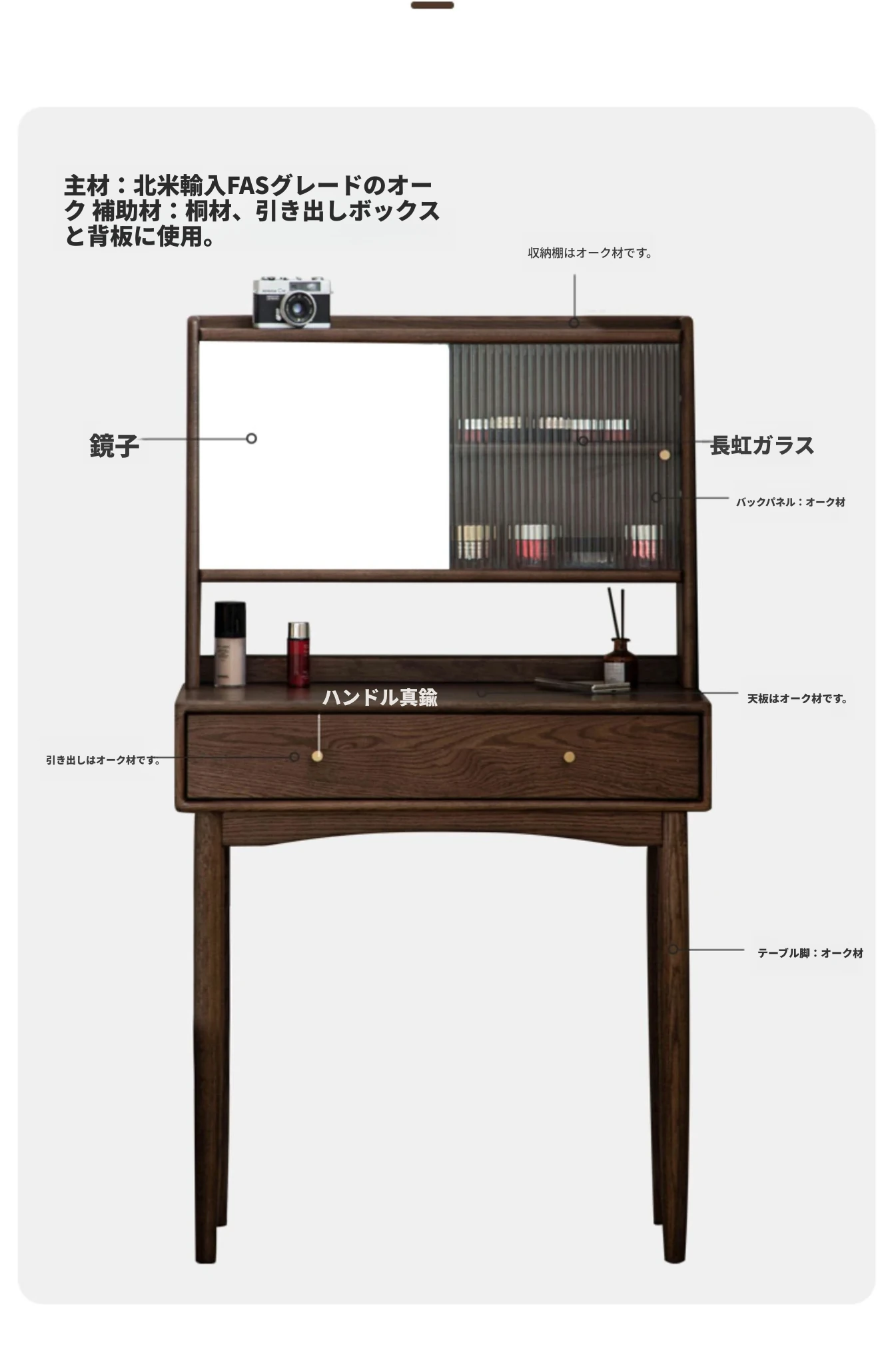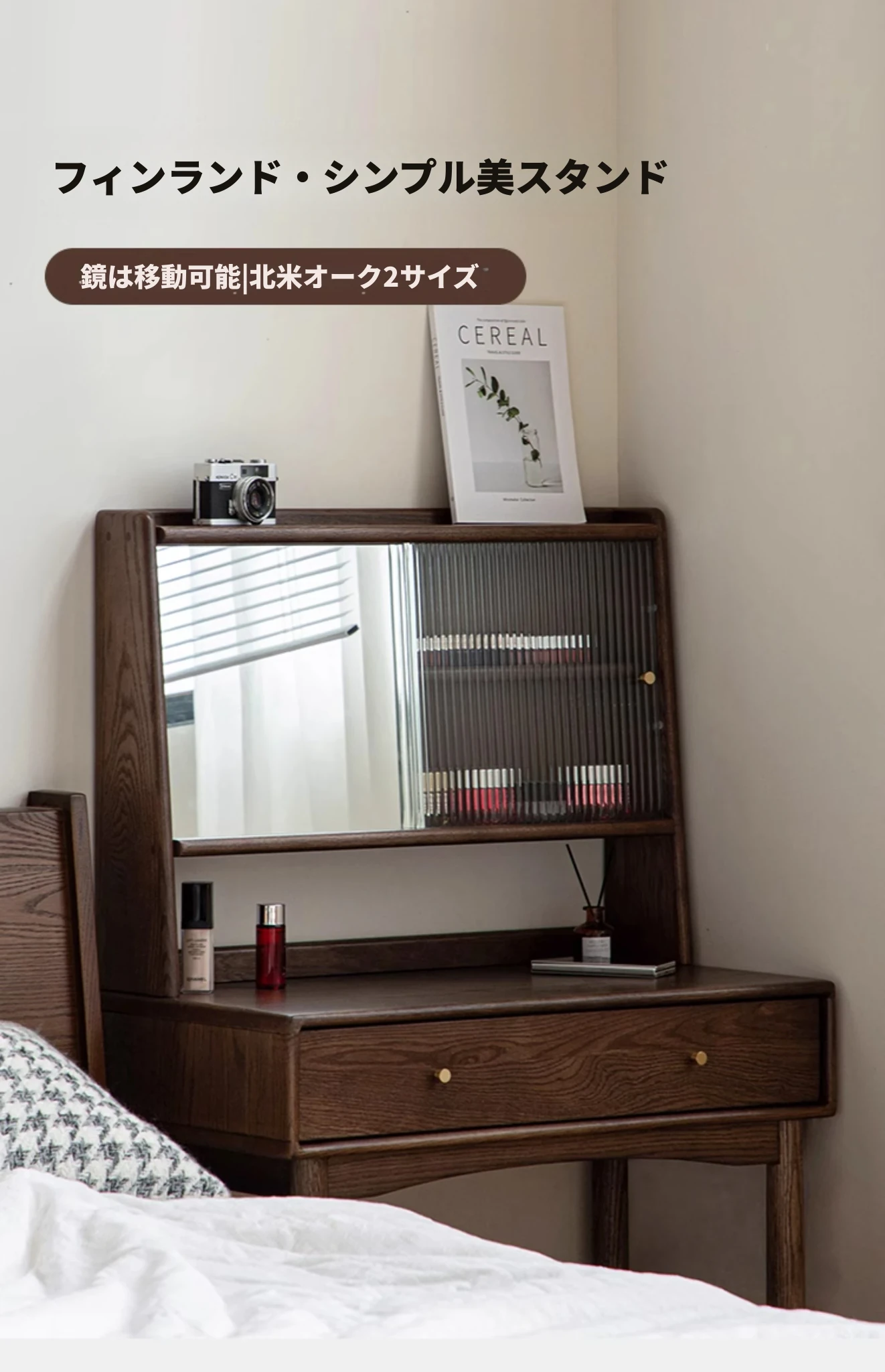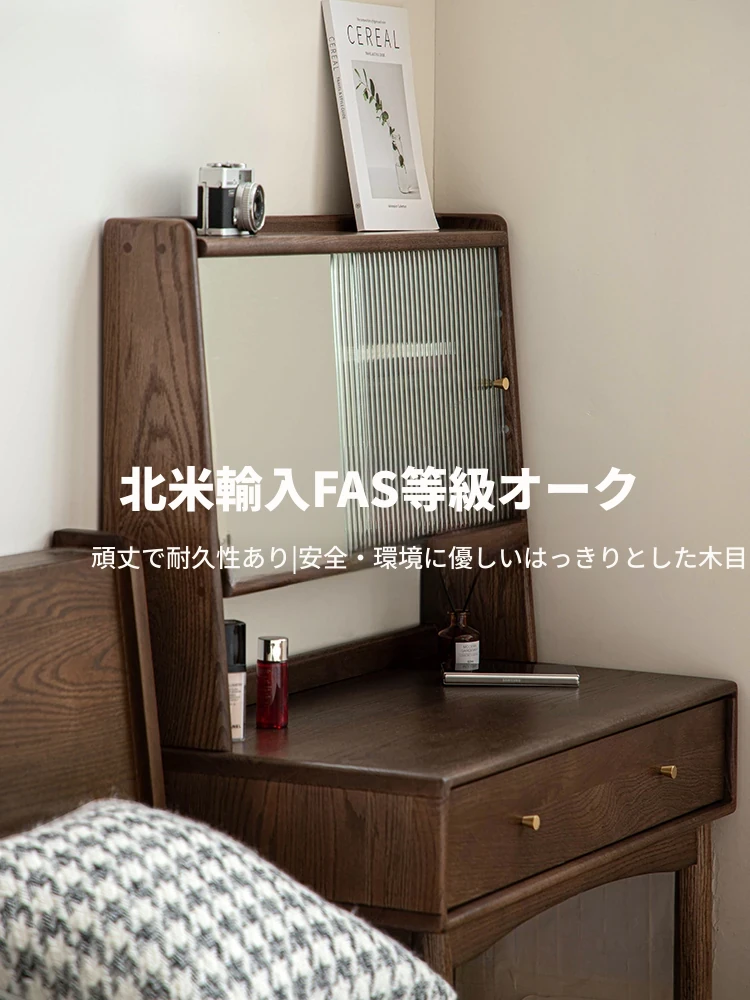 モダンな無垢材化粧台 - シンプルでスタイリッシュなデザインの北欧スタイル、収納力抜群!鏡付きでメイクも快適、書斎としても使える多機能家具。あなたの寝室にぴったりのオーク材で仕上げた化粧テーブルです。
