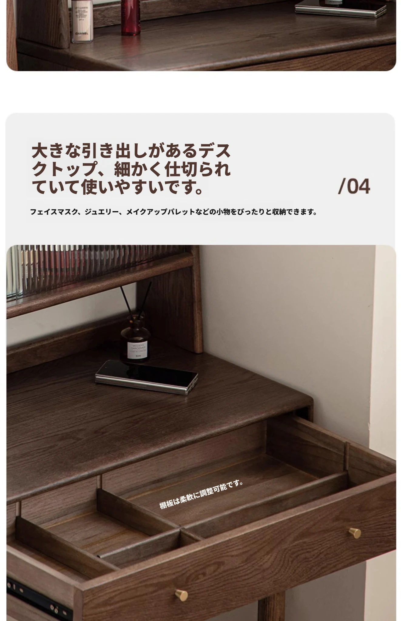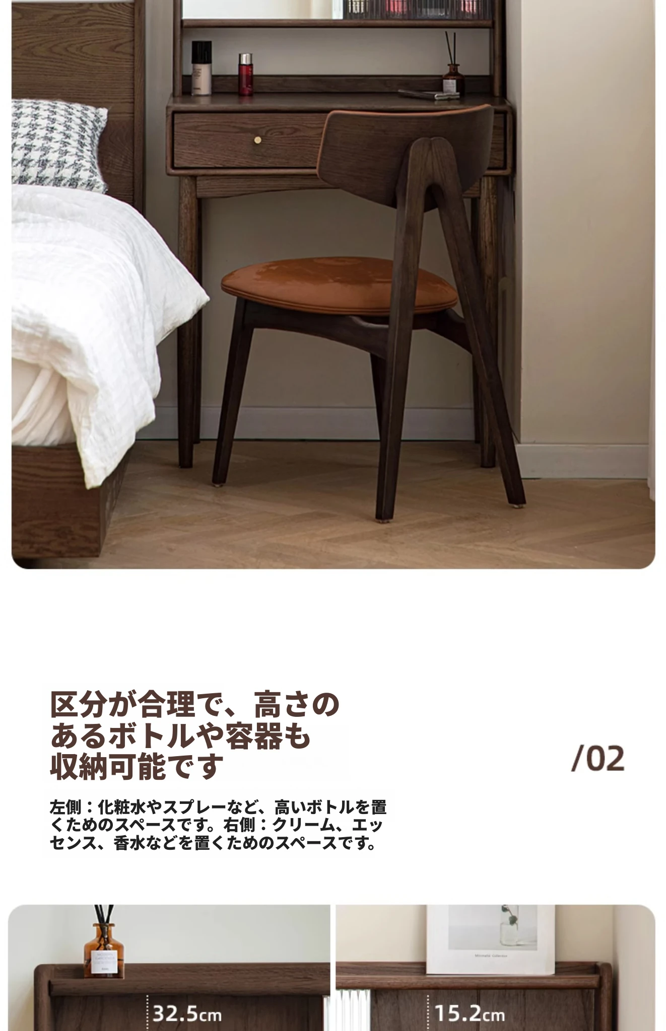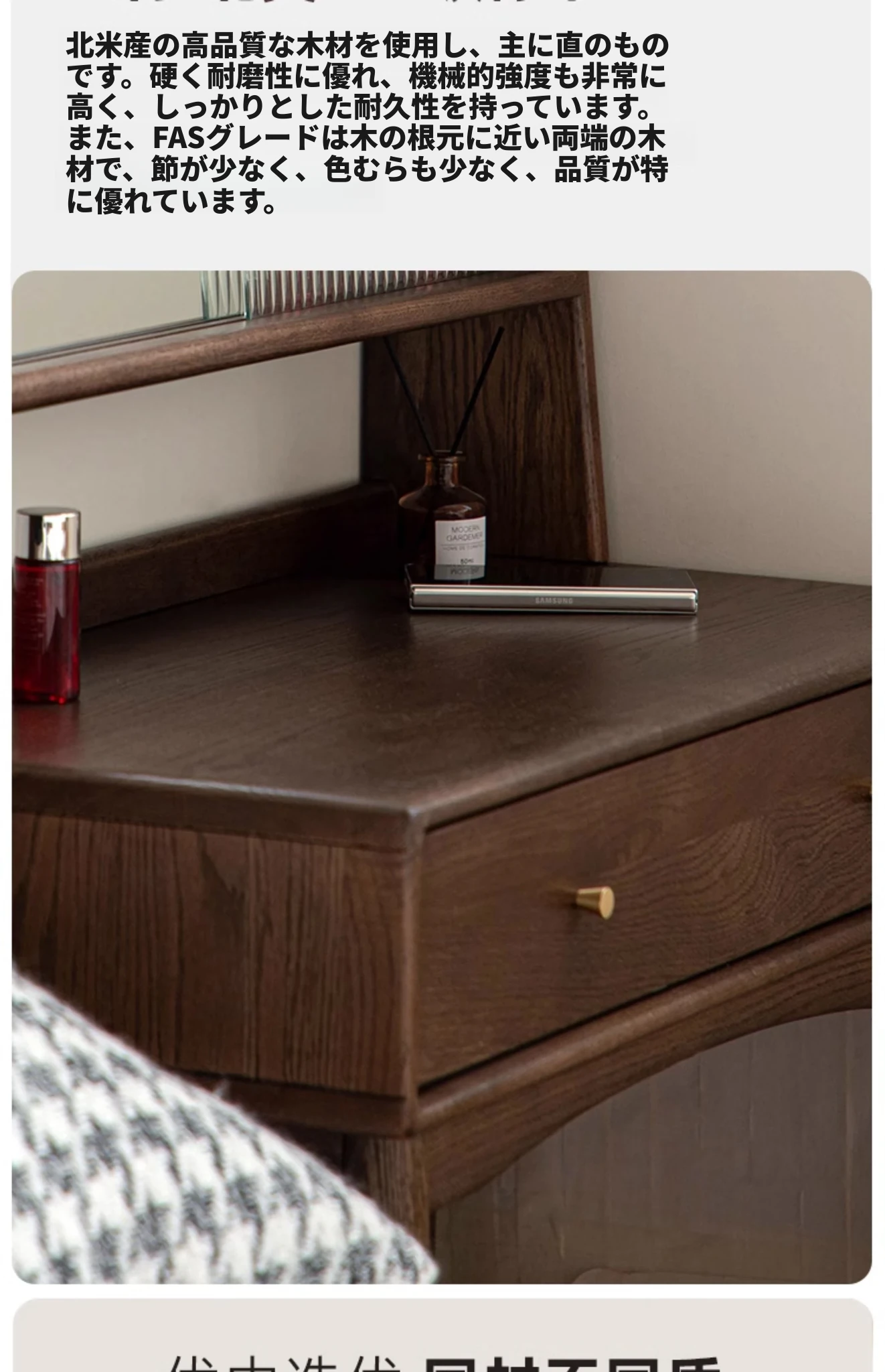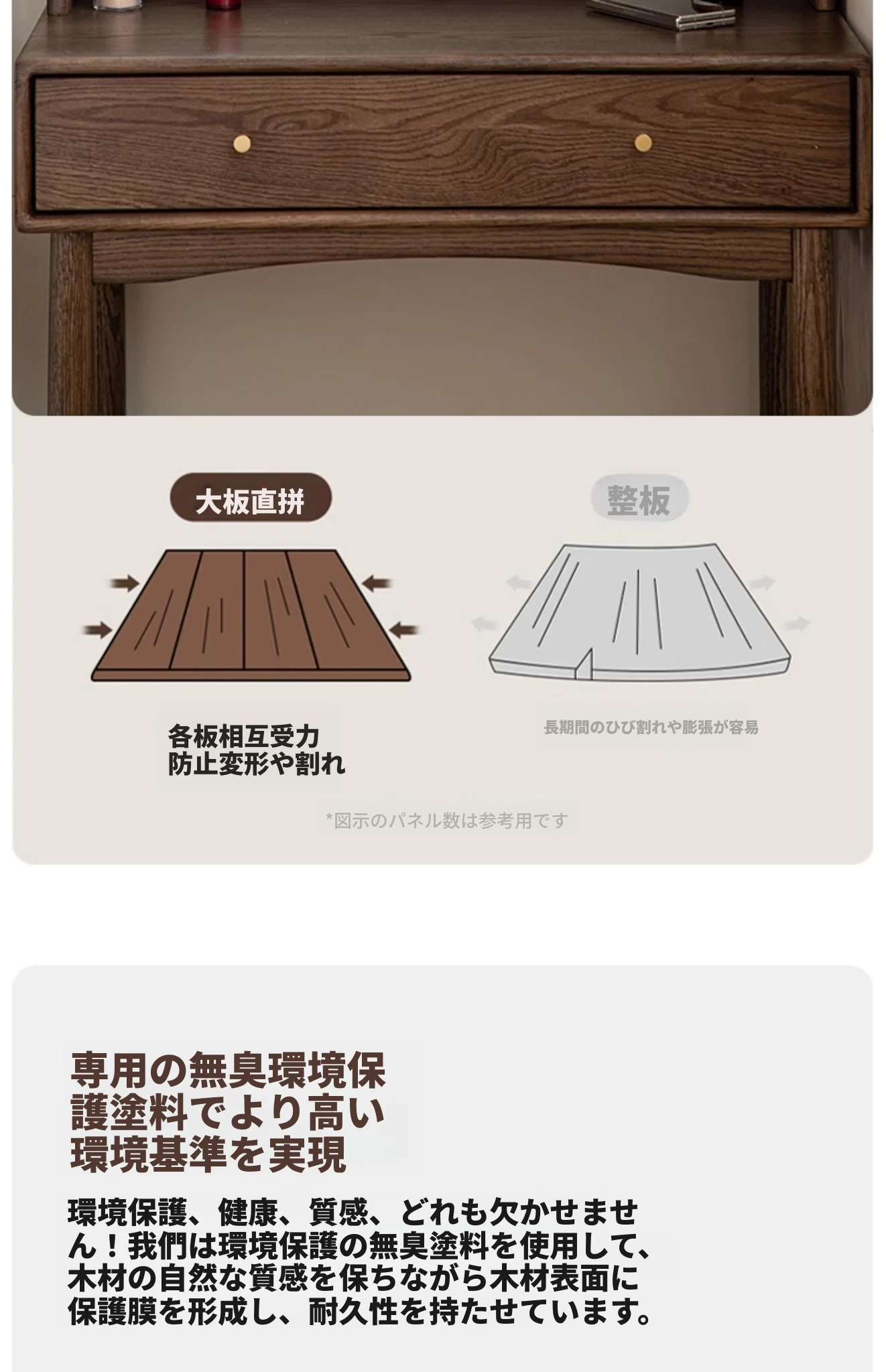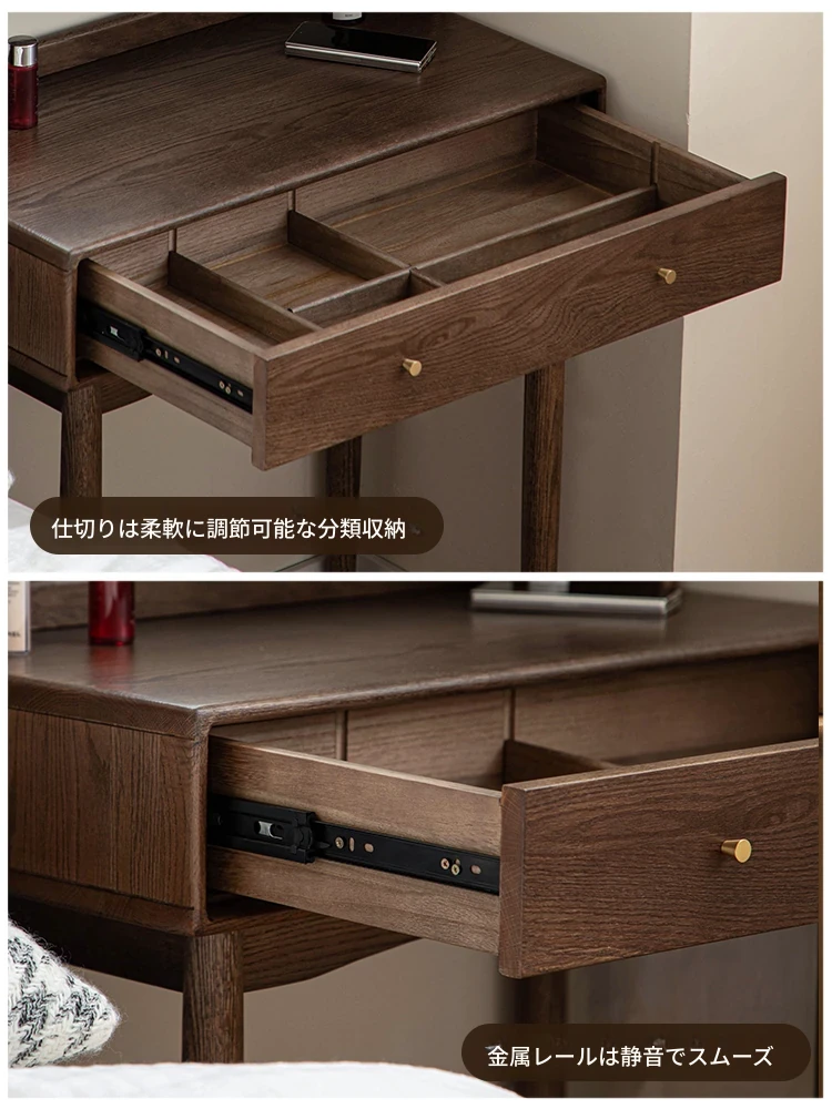 モダンな無垢材化粧台 - シンプルでスタイリッシュなデザインの北欧スタイル、収納力抜群!鏡付きでメイクも快適、書斎としても使える多機能家具。あなたの寝室にぴったりのオーク材で仕上げた化粧テーブルです。