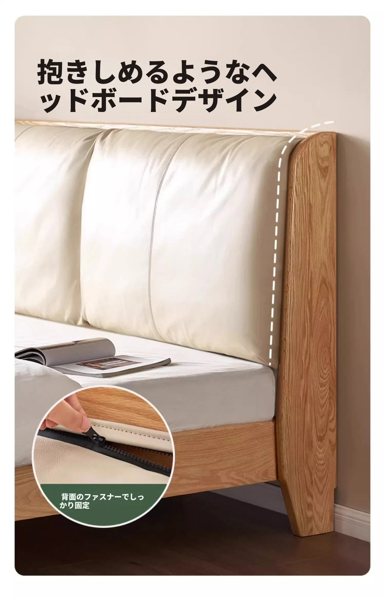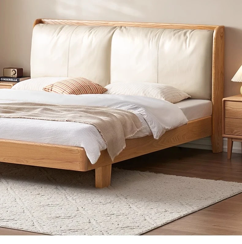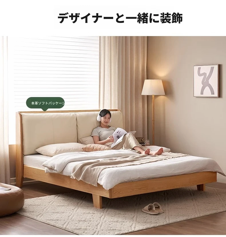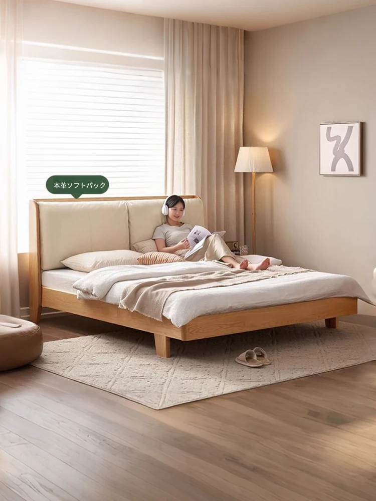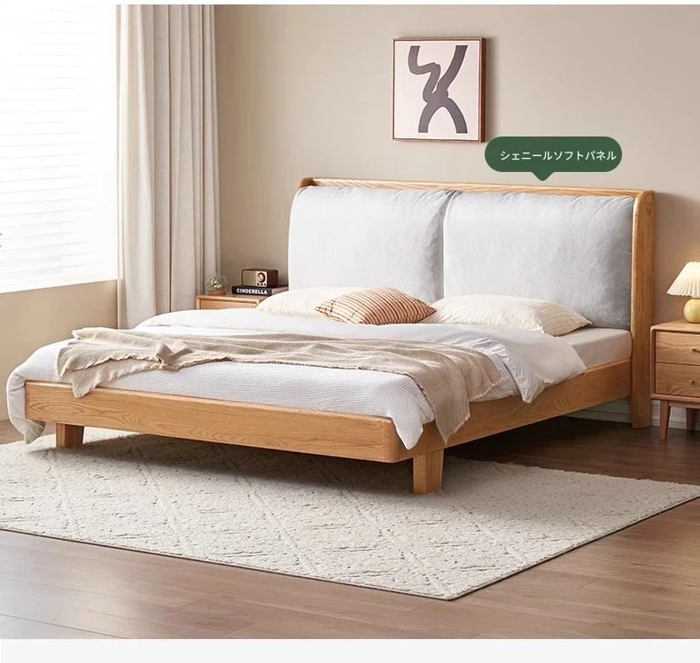 北欧スタイルの無垢材ソフトパッケージベッド - モダンでシンプルなオーク材使用、1.8mダブルベッド、主寝室にぴったりな原木家具。快適な睡眠をサポートします!