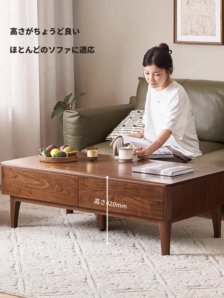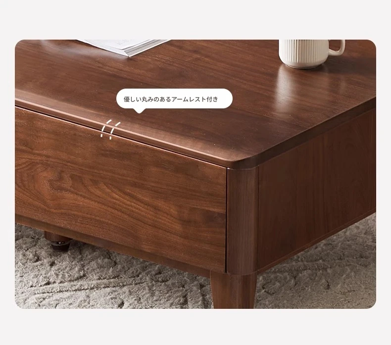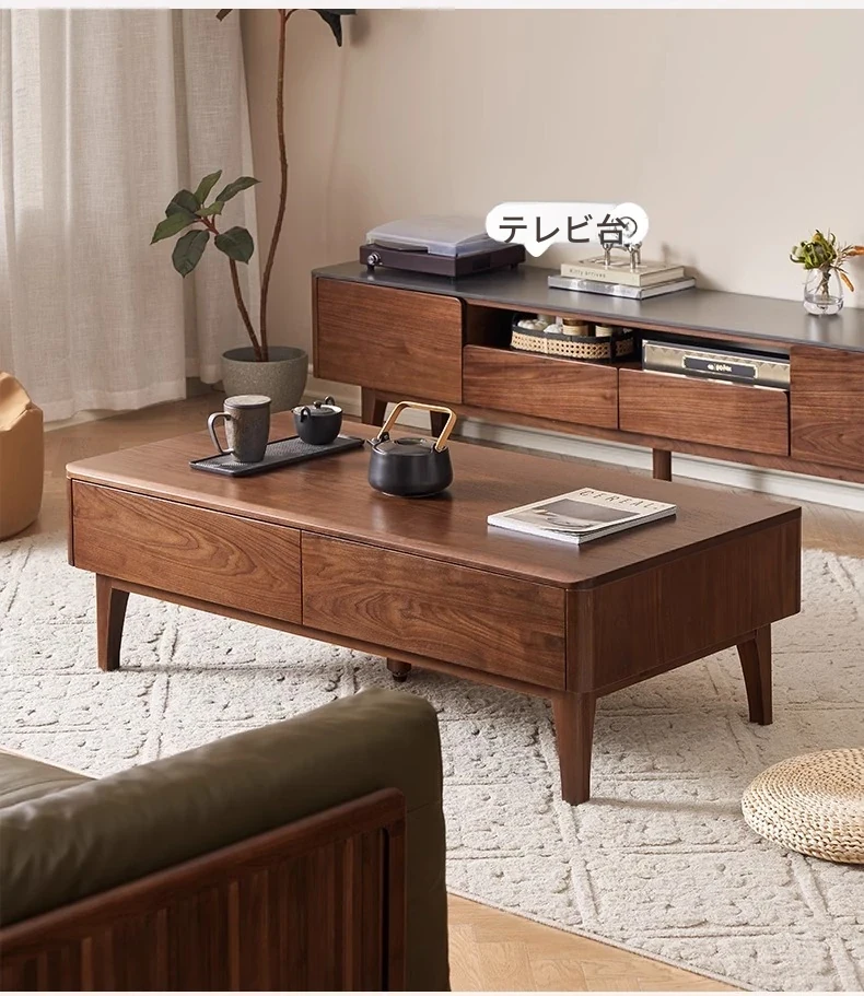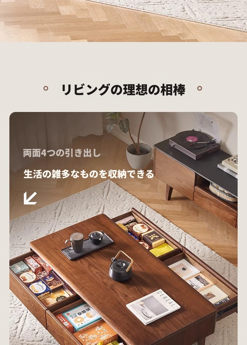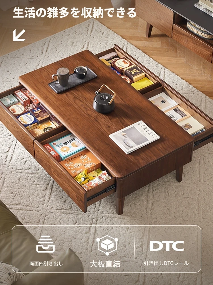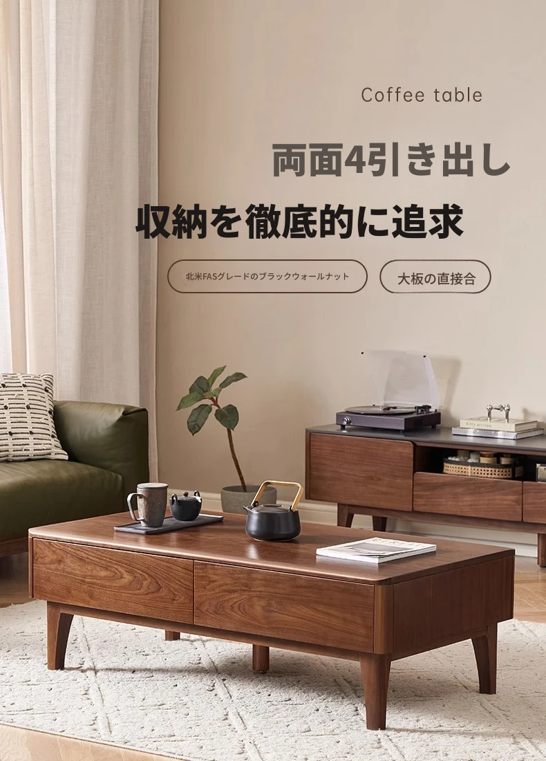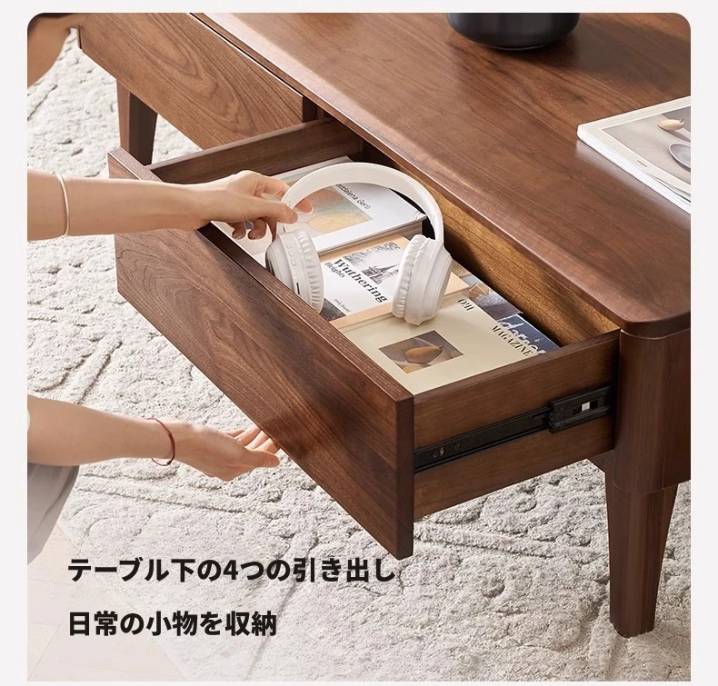 原始原素北米産ブラックウォールナットのラグジュアリー感あふれる4段引き出し付き、シンプルでスタイリッシュなリビング用実木コーヒーテーブル。小さな空間にもぴったり!