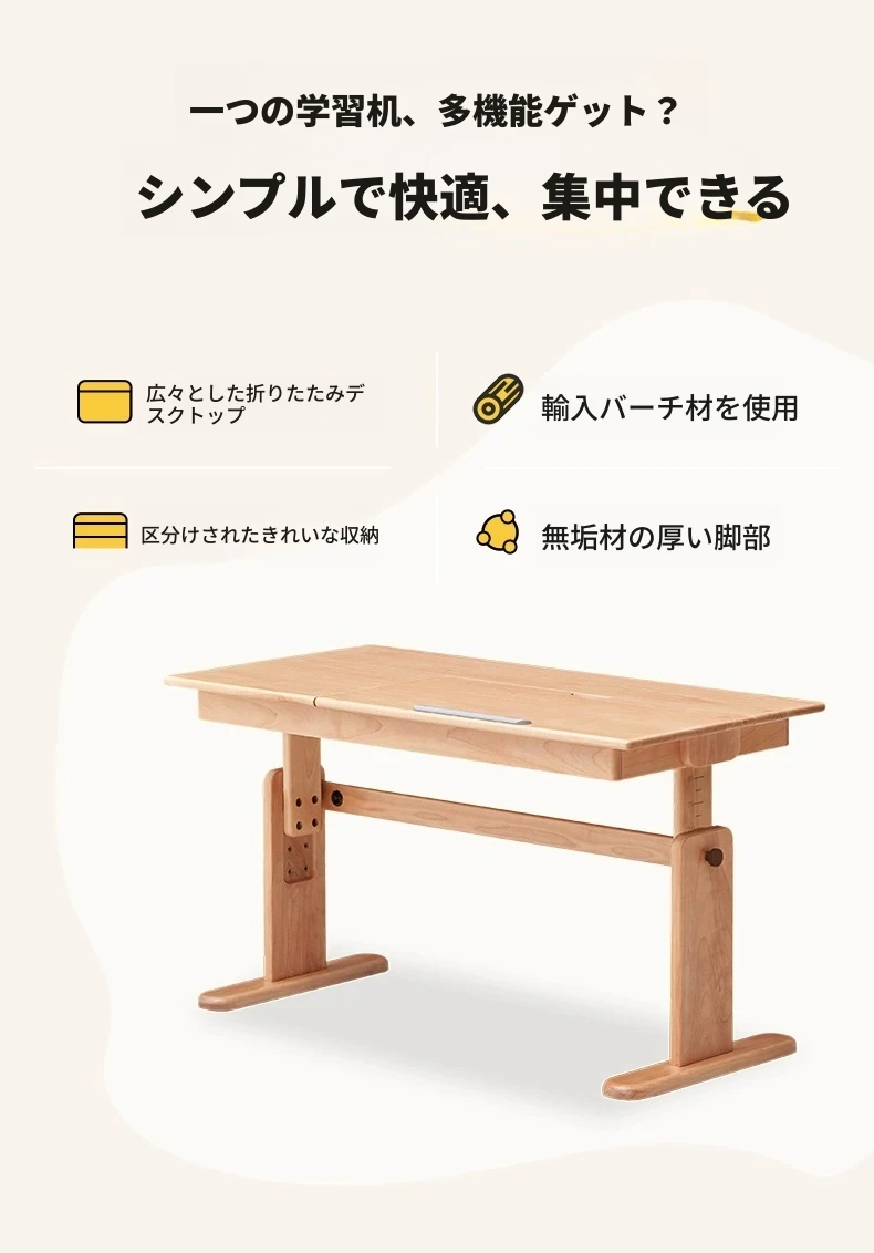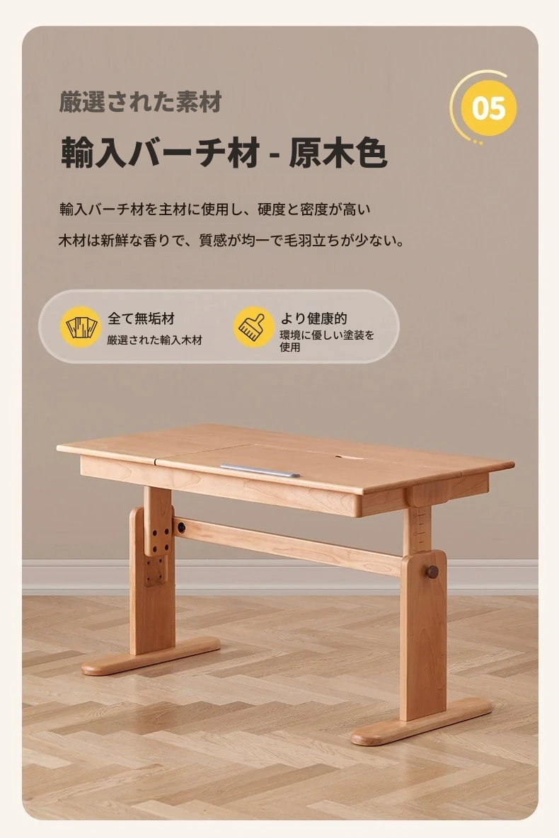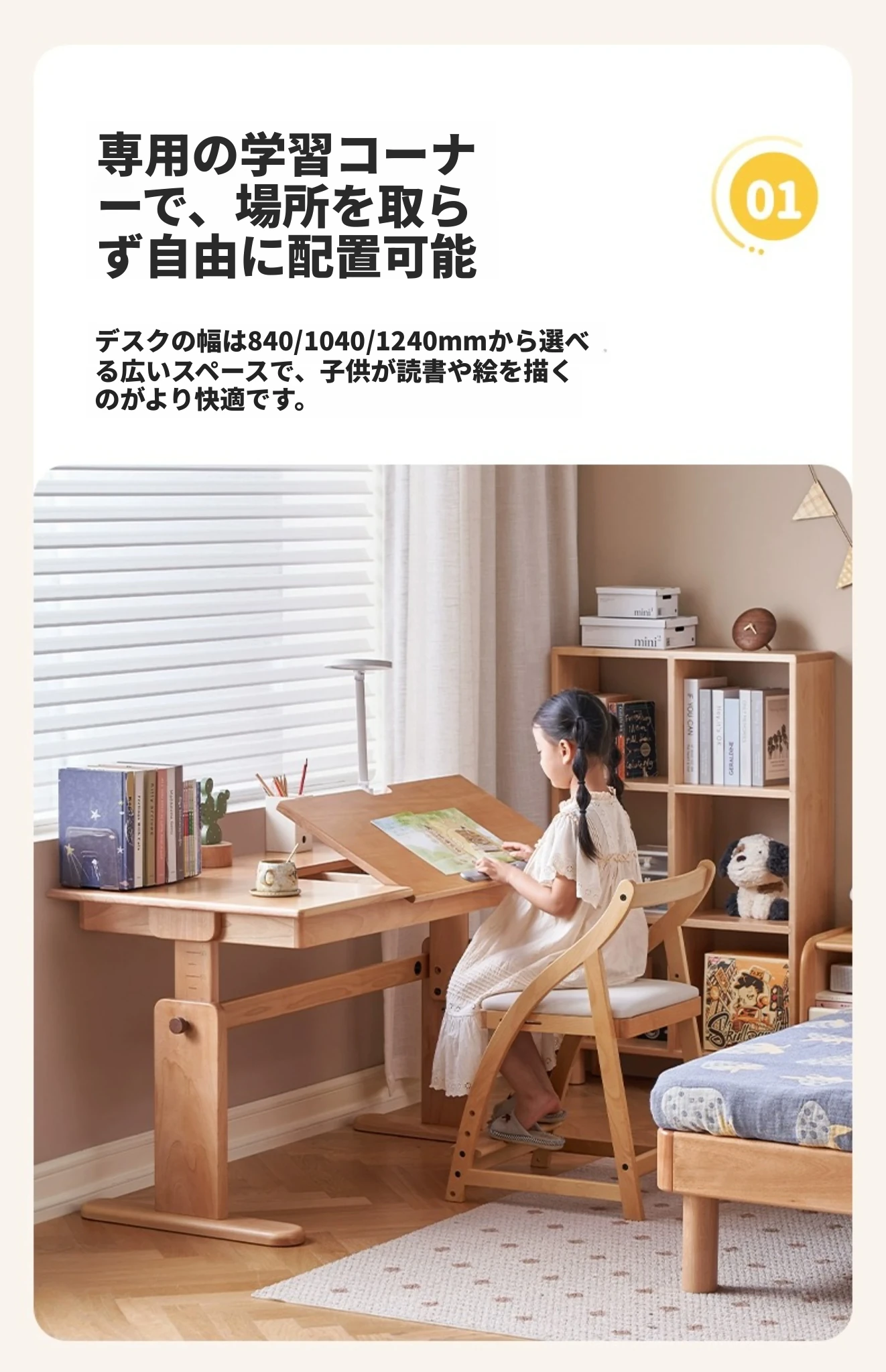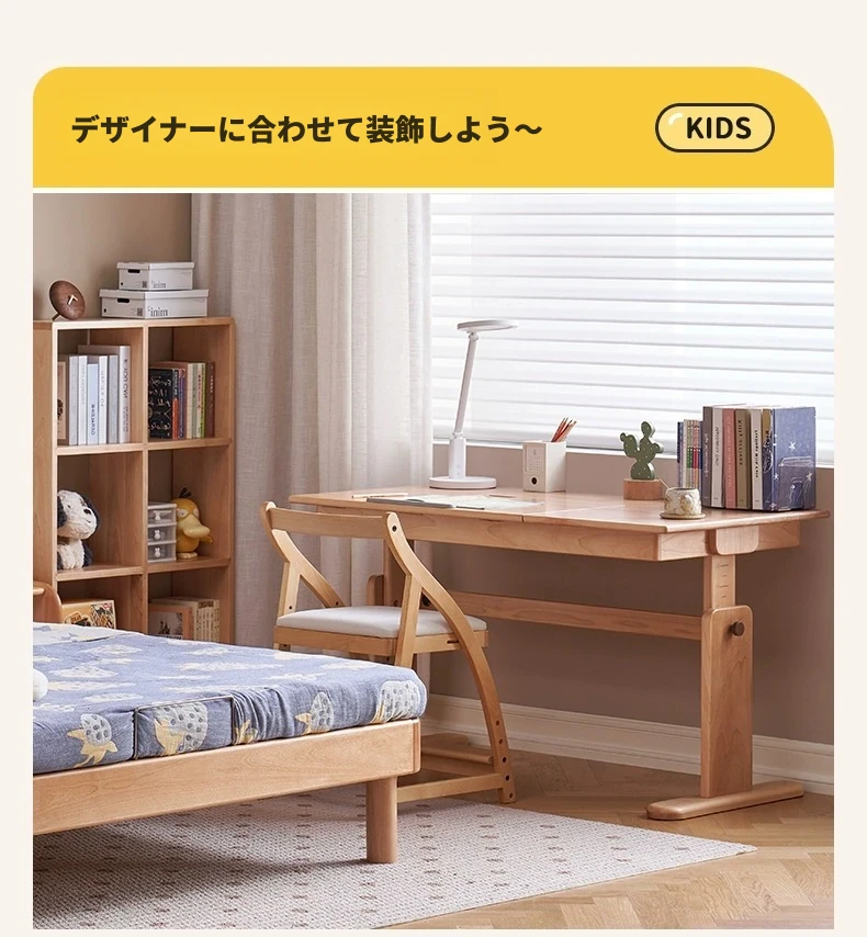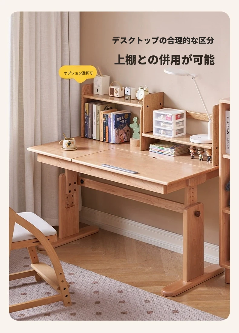 原木素材のシンプルな子供用学習デスク - 調整可能な昇降式、成長に合わせて使える!勉強も楽しくなるスタイリッシュなデザイン。
