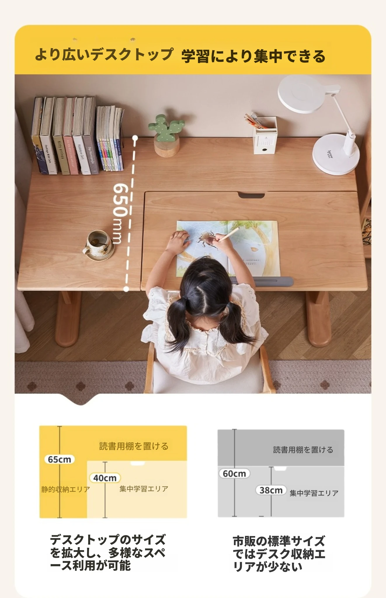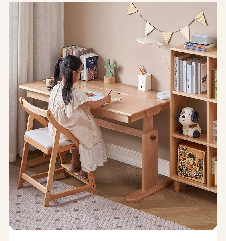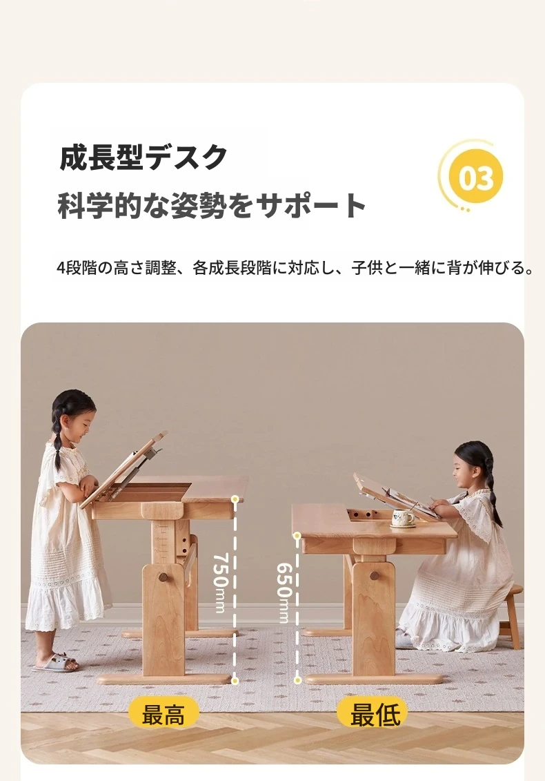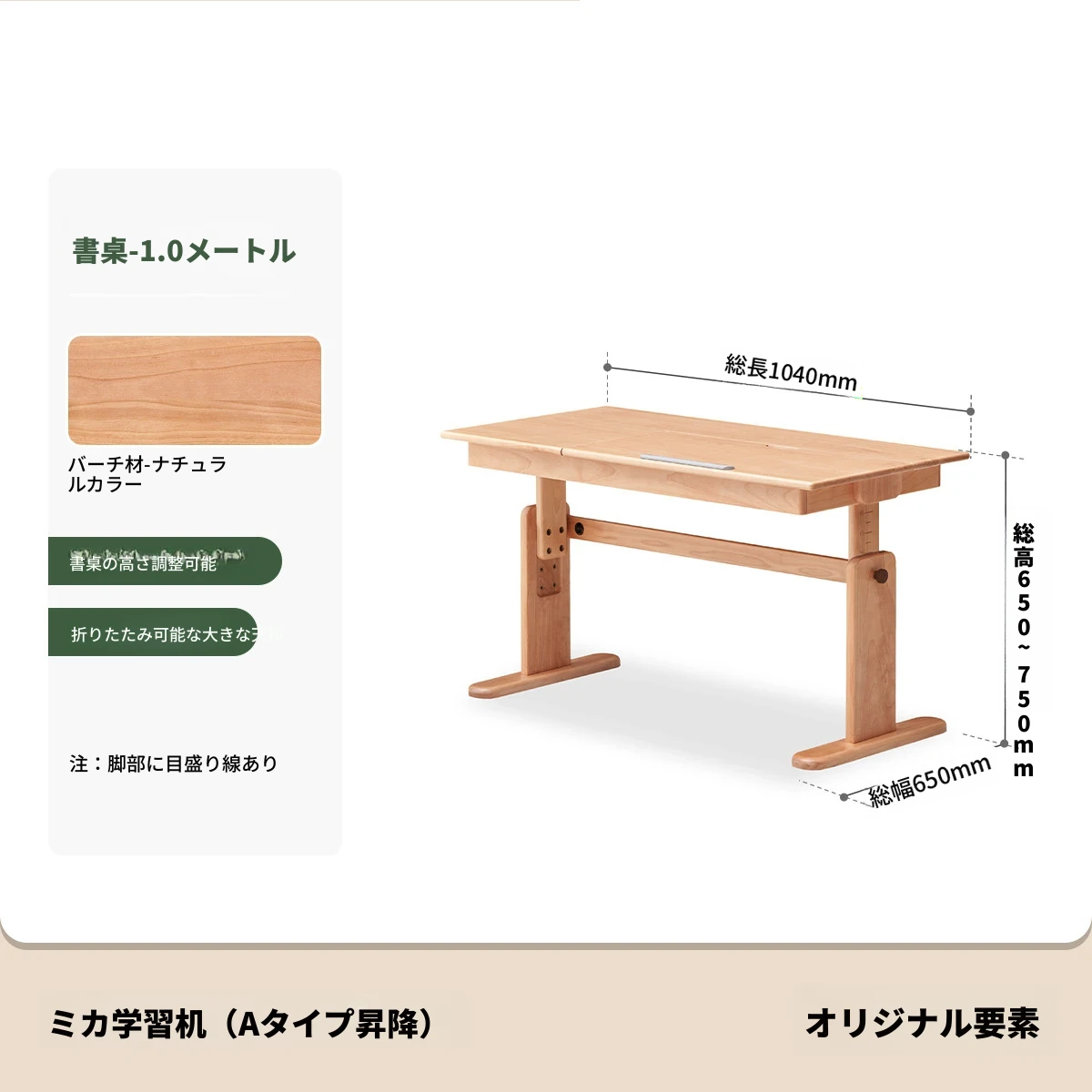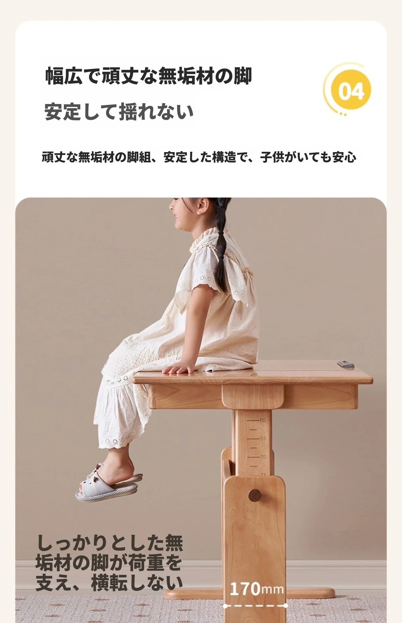原木素材のシンプルな子供用学習デスク - 調整可能な昇降式、成長に合わせて使える!勉強も楽しくなるスタイリッシュなデザイン。