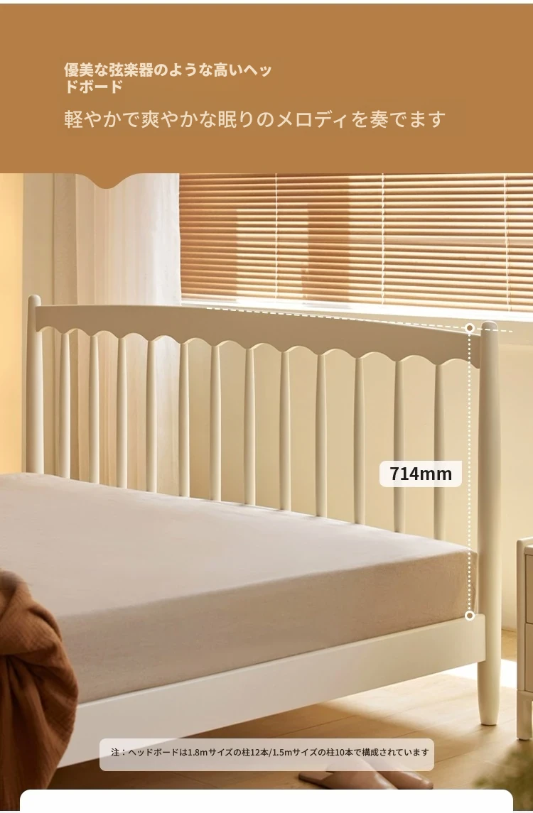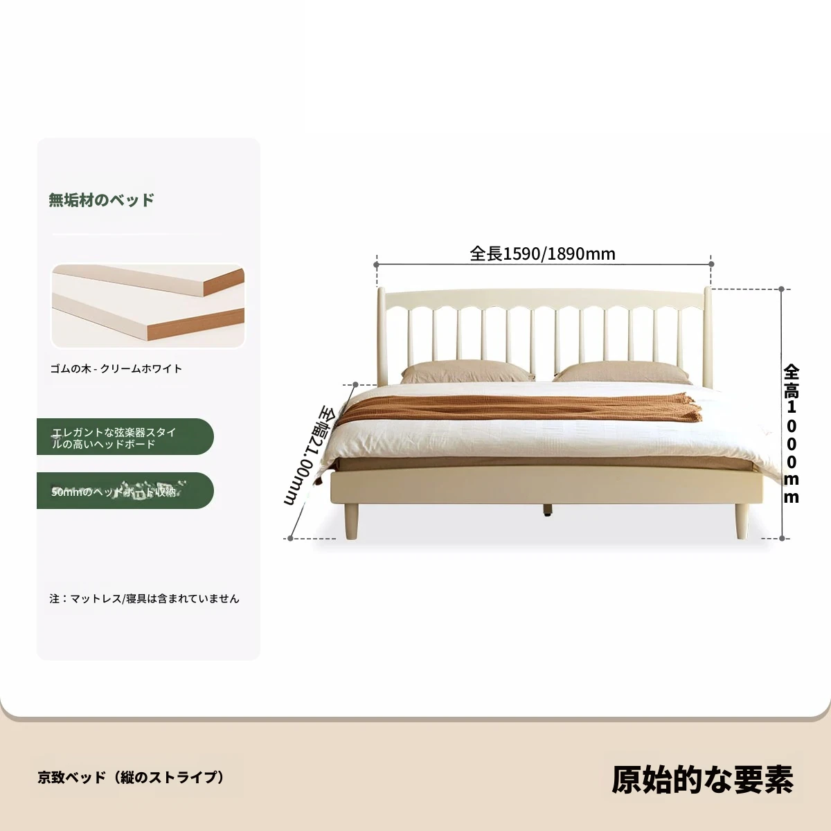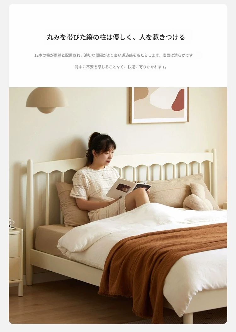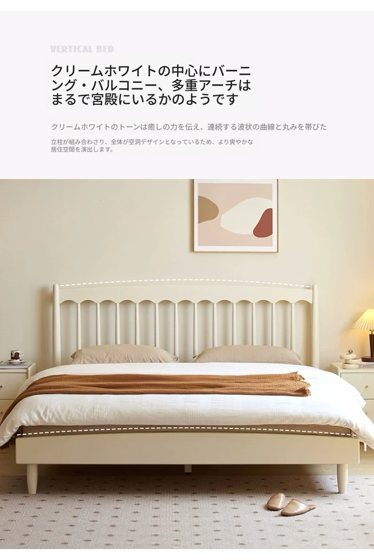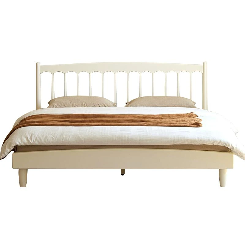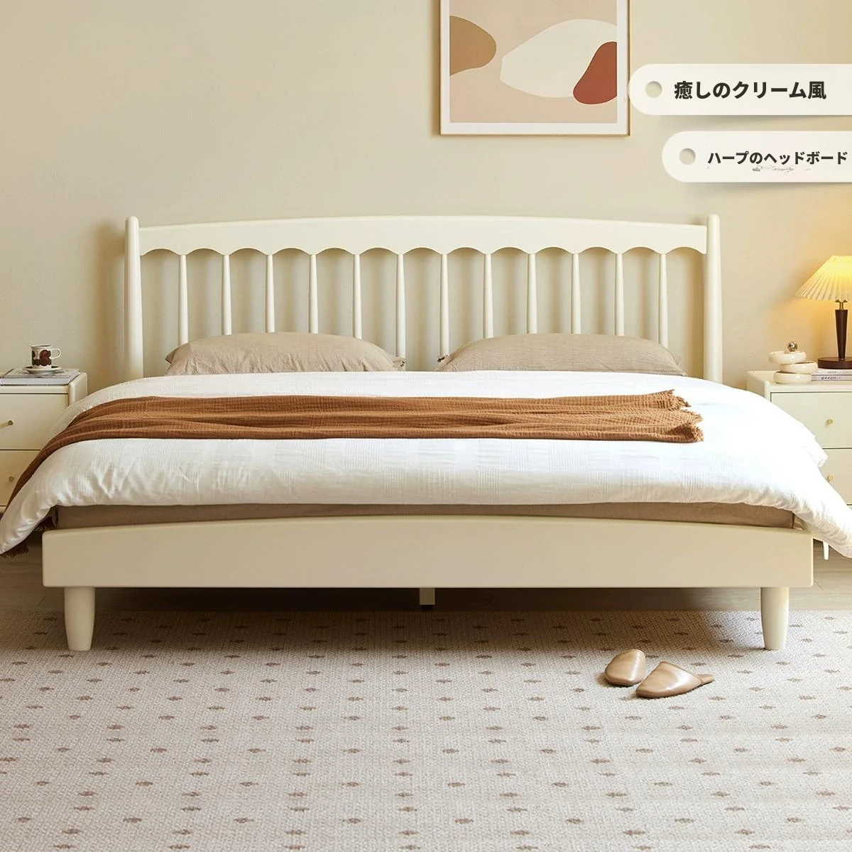 オーセンティックな無垢材のベッド - モダンでシンプルなクリーム風デザイン、ホワイトのハープ・ウィンザースタイル。小型住宅にもぴったりのダブルベッドで、快適な眠りを提供します。