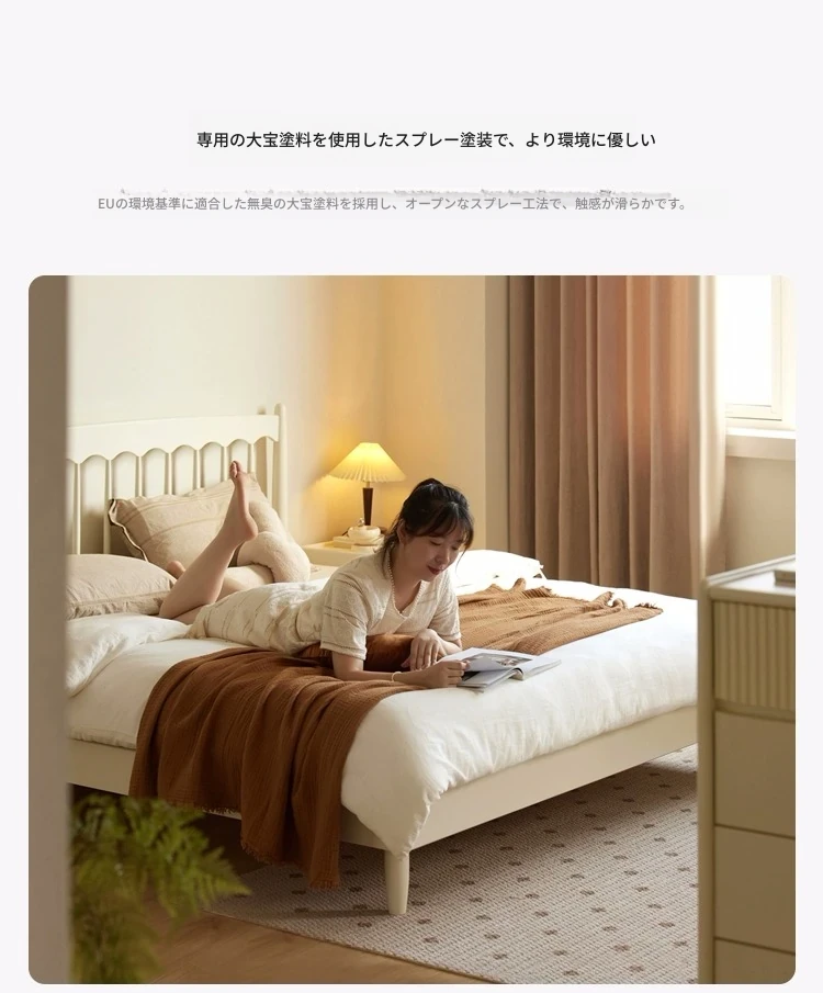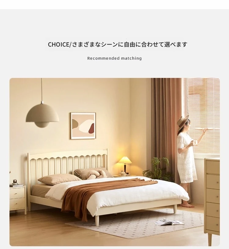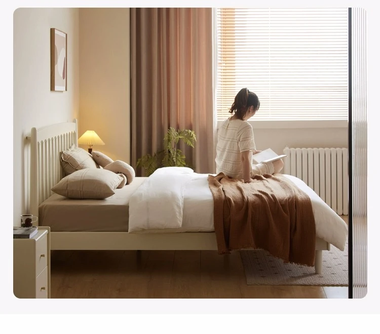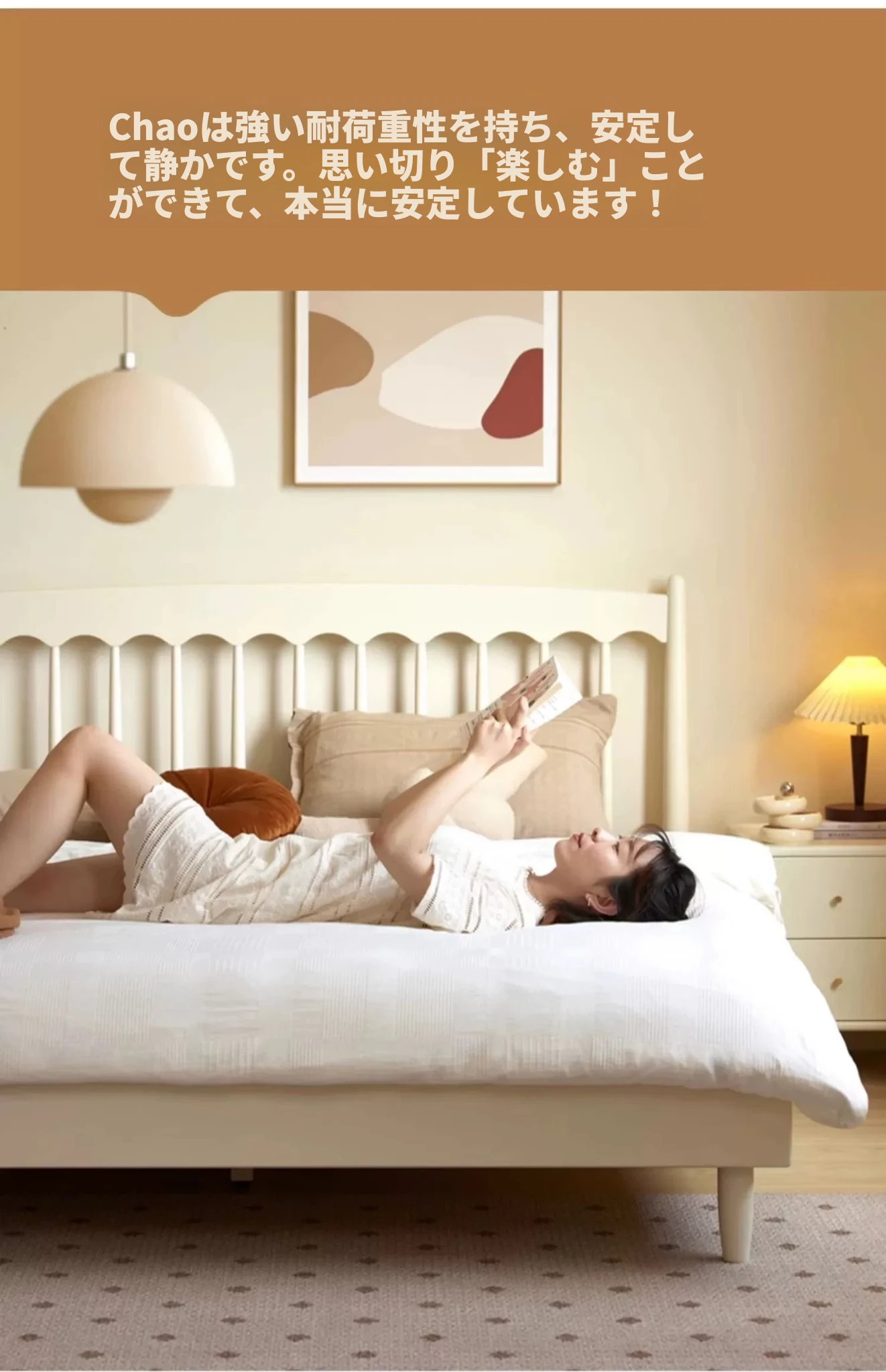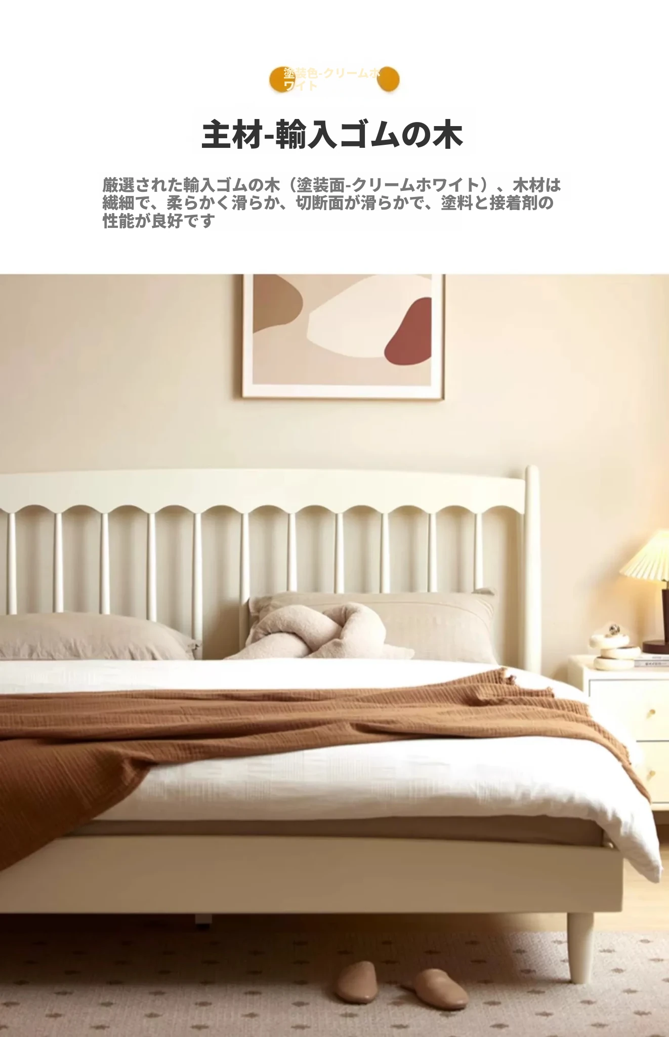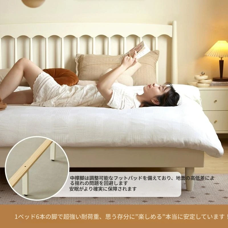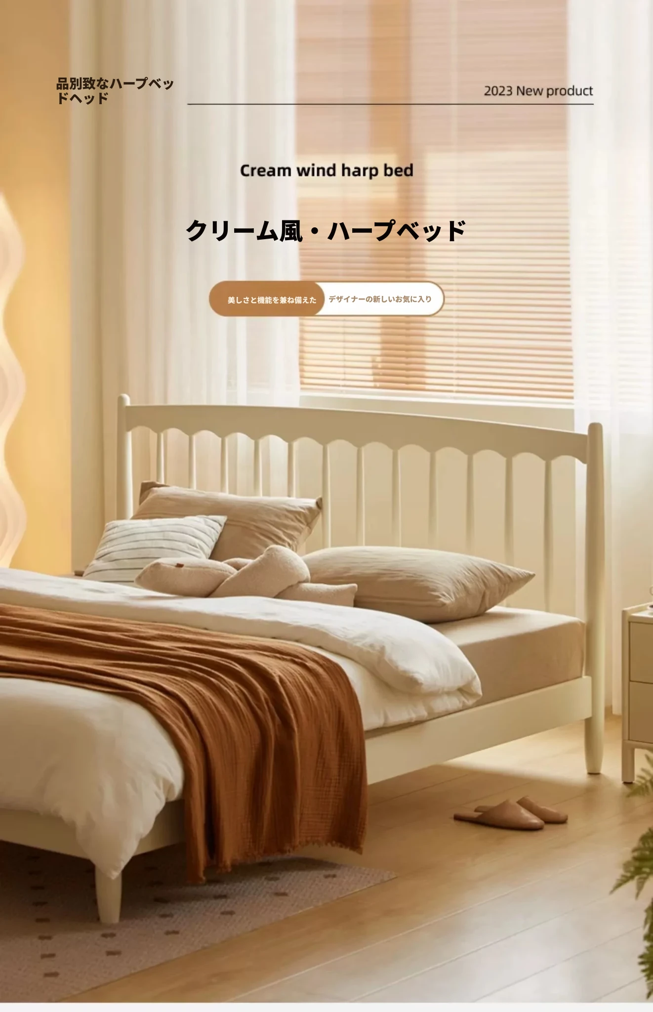 オーセンティックな無垢材のベッド - モダンでシンプルなクリーム風デザイン、ホワイトのハープ・ウィンザースタイル。小型住宅にもぴったりのダブルベッドで、快適な眠りを提供します。