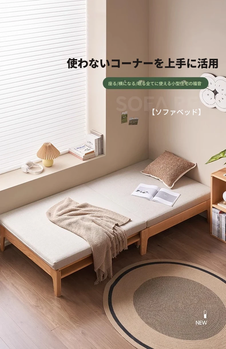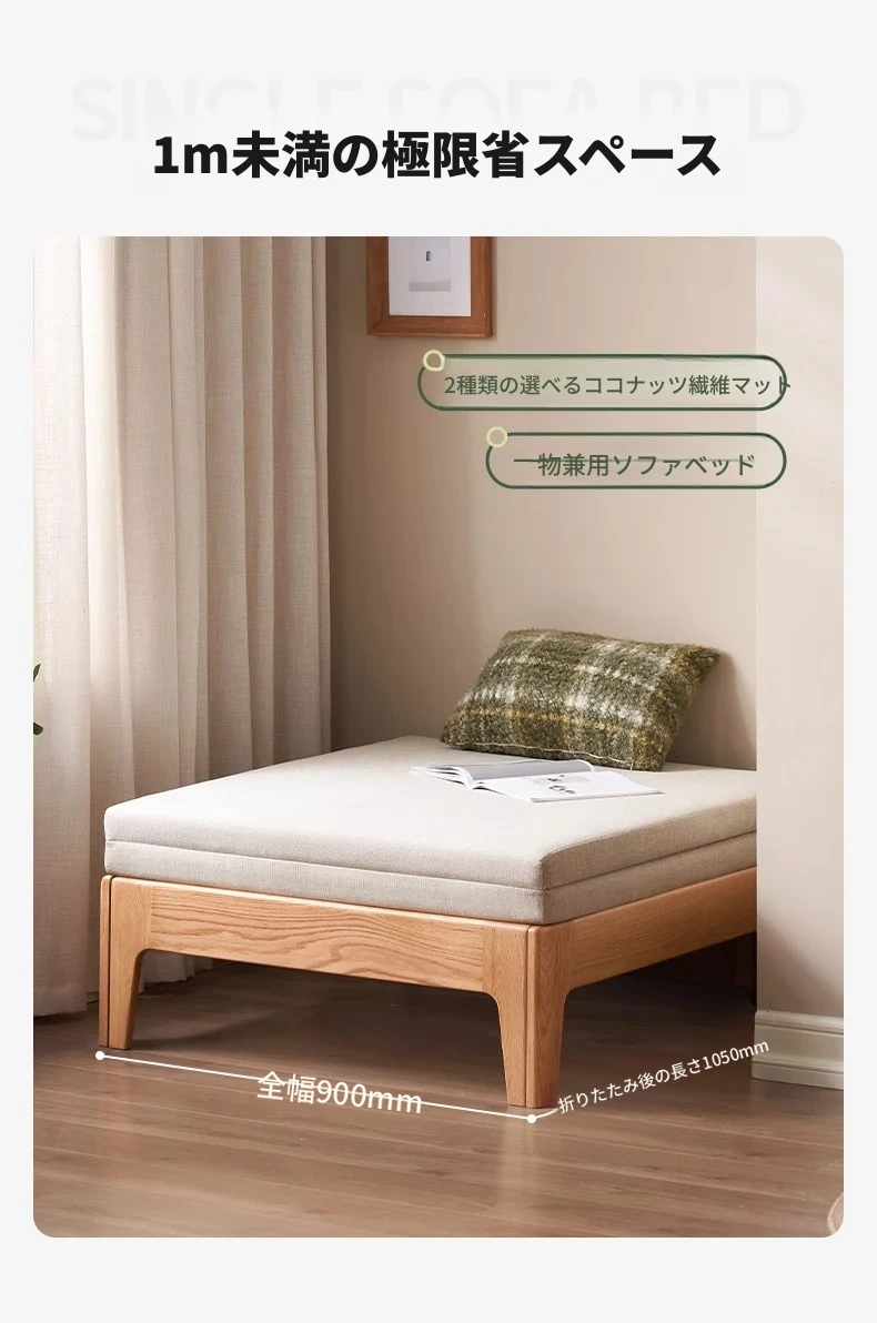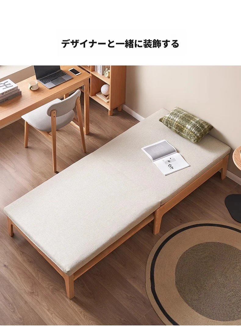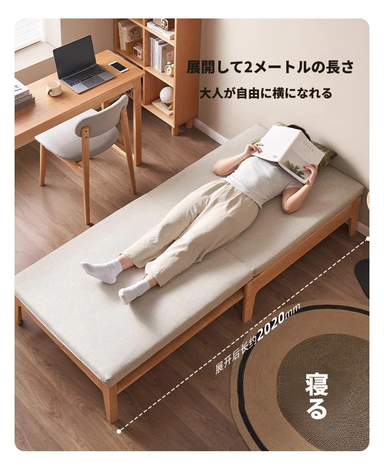 オリジナル素材の全木製折りたたみソファベッド|伸縮可能なオーク材の一人用ベッド|小型住宅に最適なソファ一体型デザイン!快適な睡眠とリラックス空間を実現!