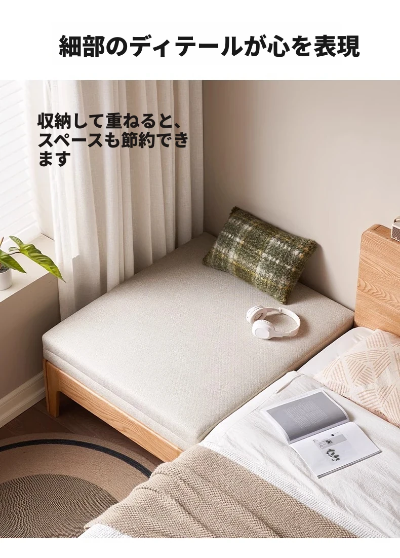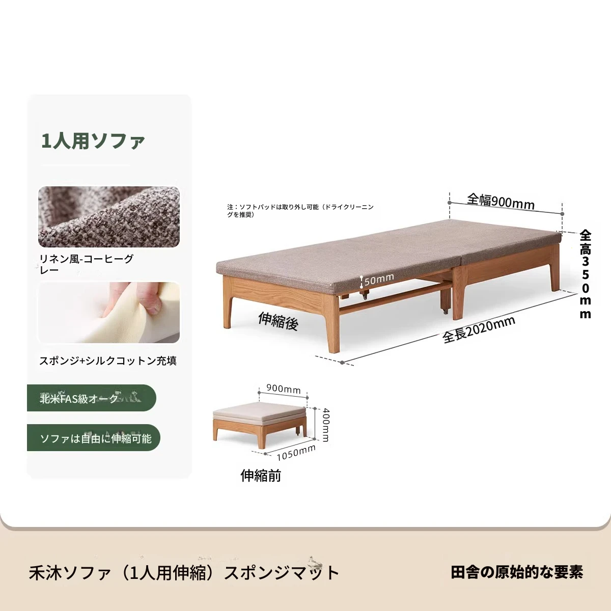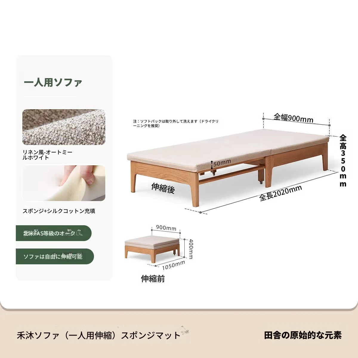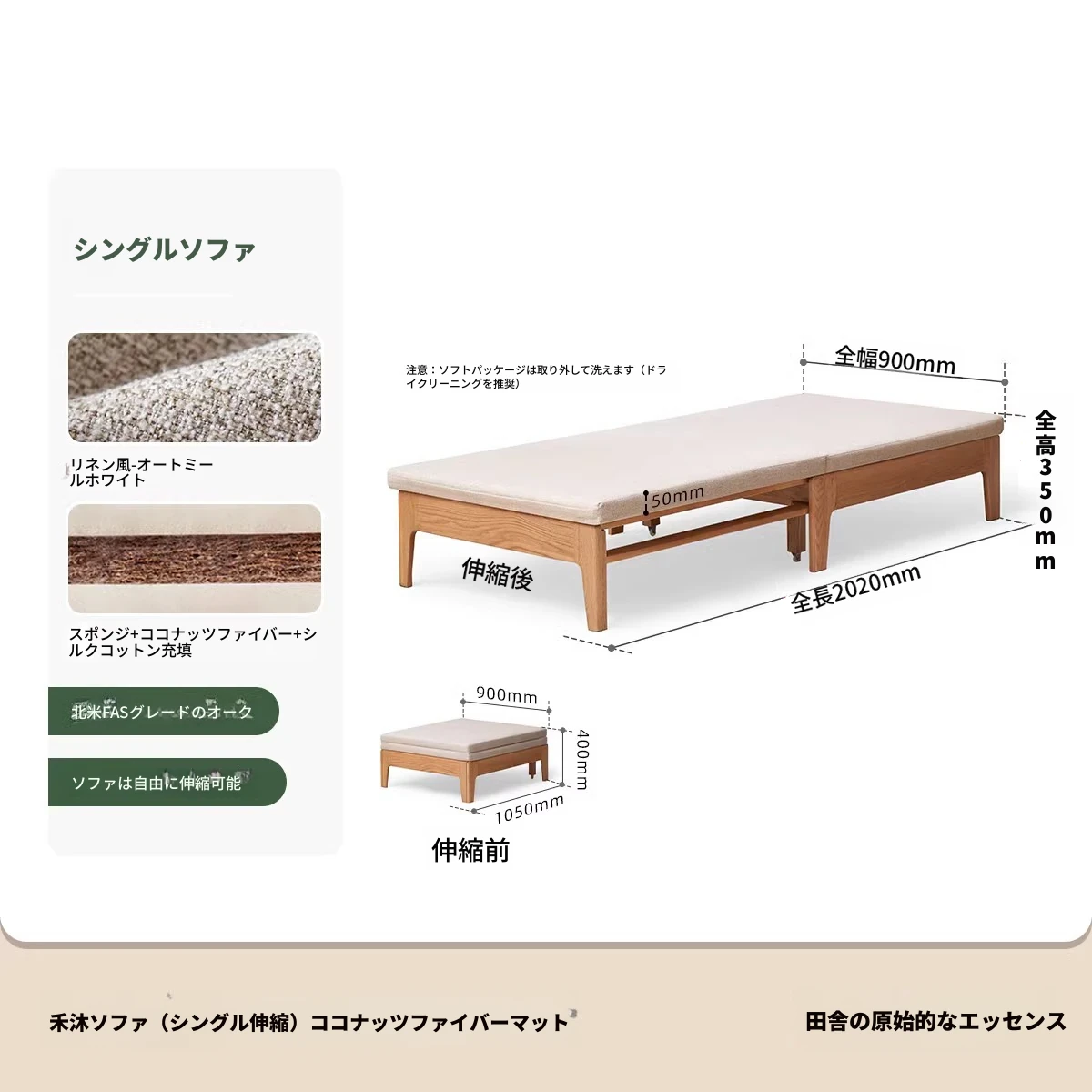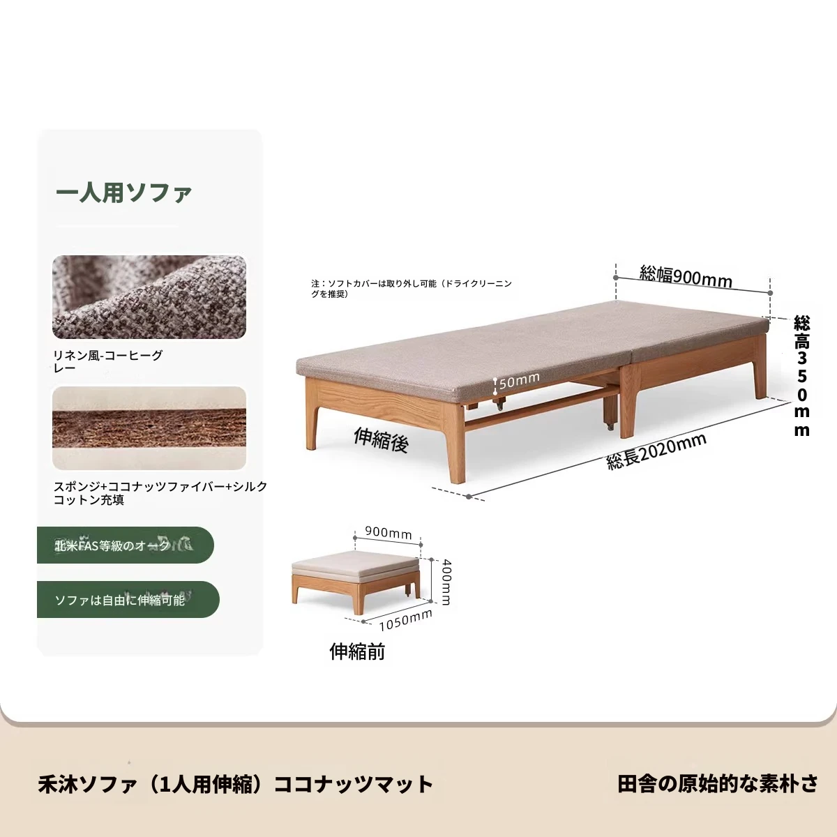 【ナチュラルウッド-オートミールホワイト】シングル伸縮ソファ(ココナッツファイバークッション付き)900*1050*300mm
