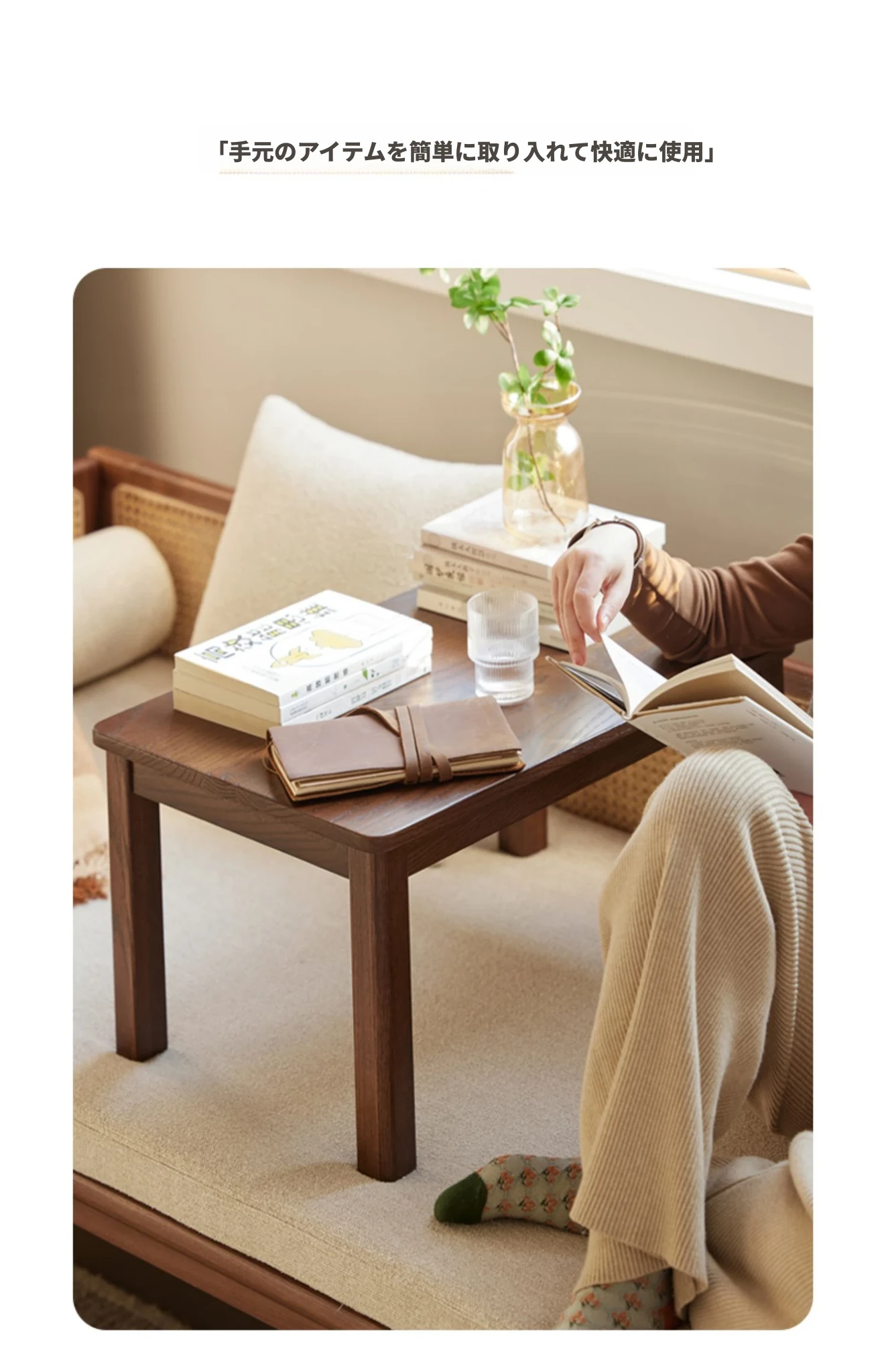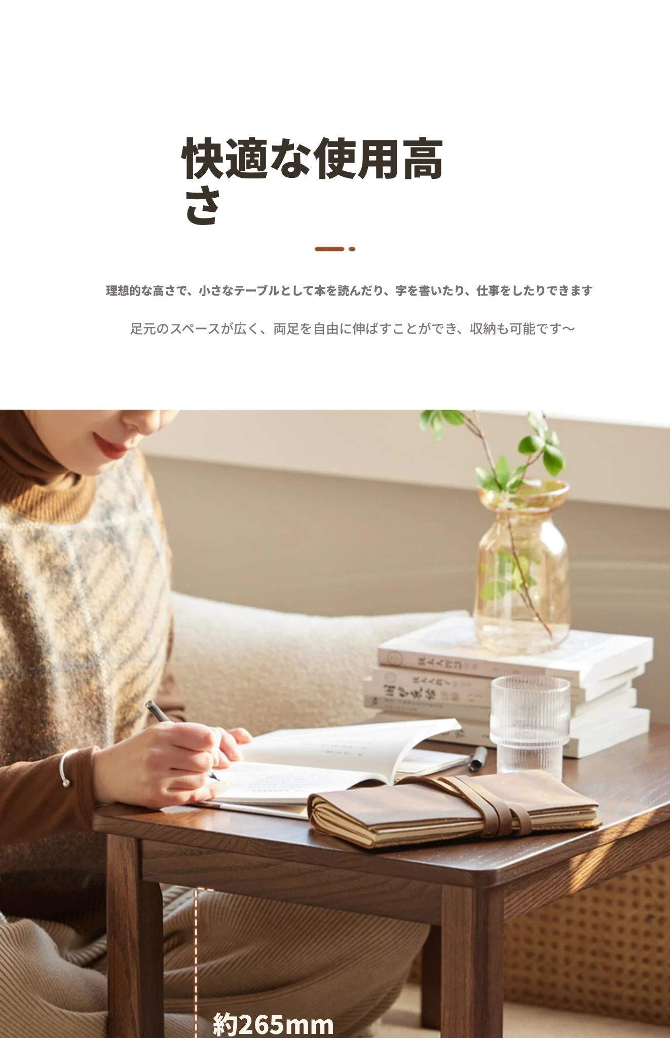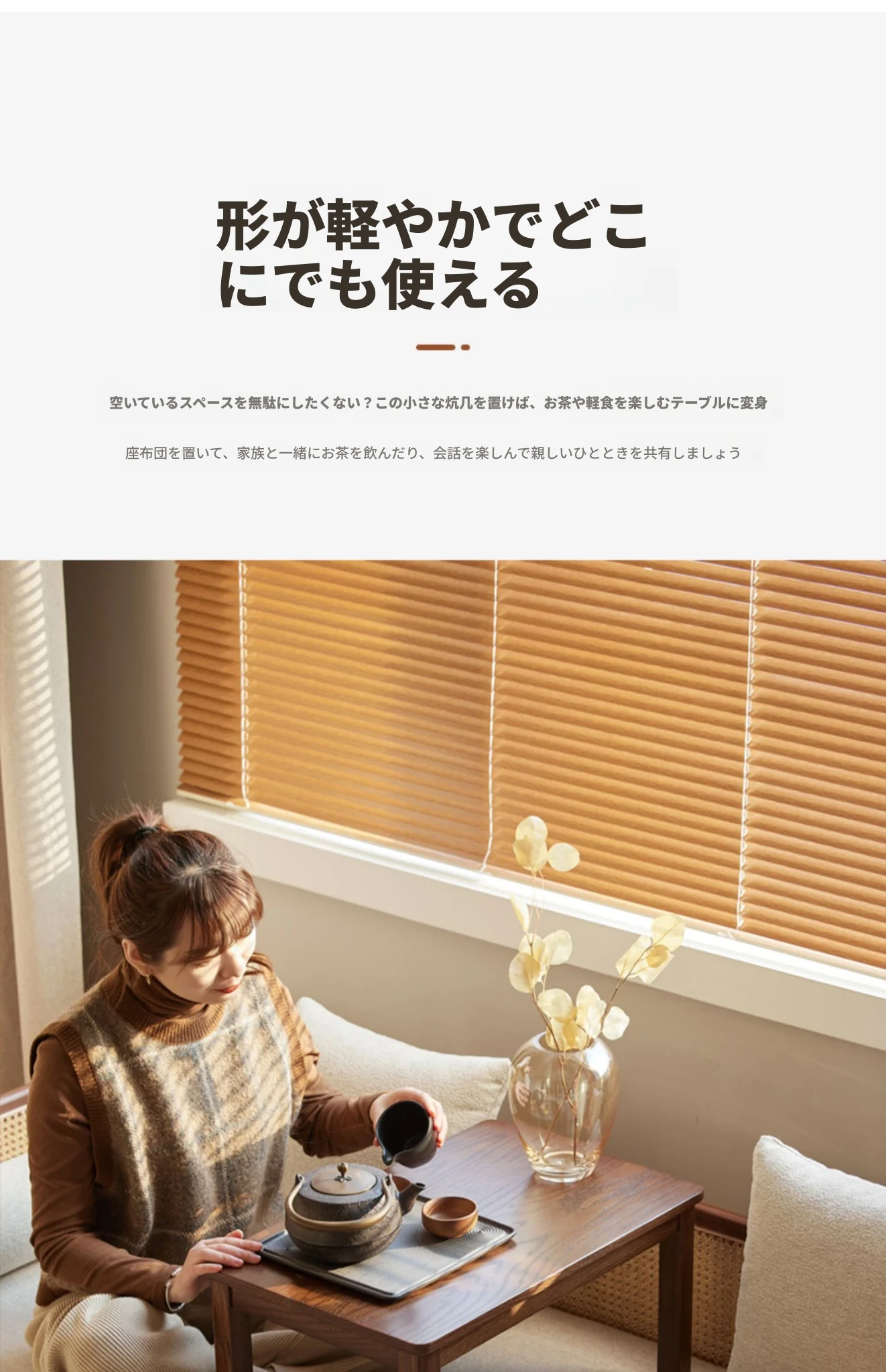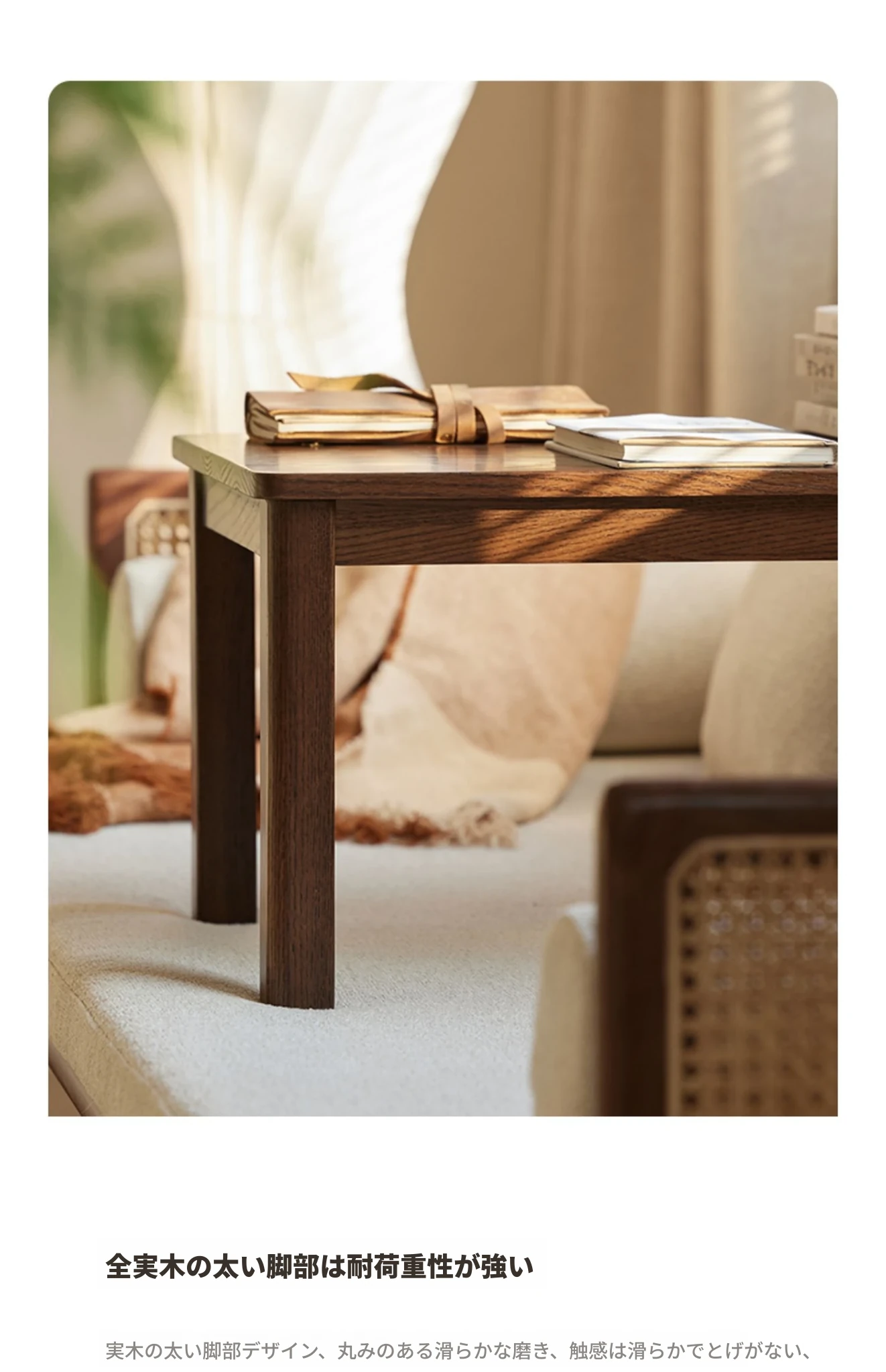 原木の魅力を活かした全実木のロースタイルテーブル!モダンでシンプルなデザイン、狭い部屋にもぴったり。榻榻米やフロアに最適なオーク材の低い茶卓、窓際に置いても美しい!
