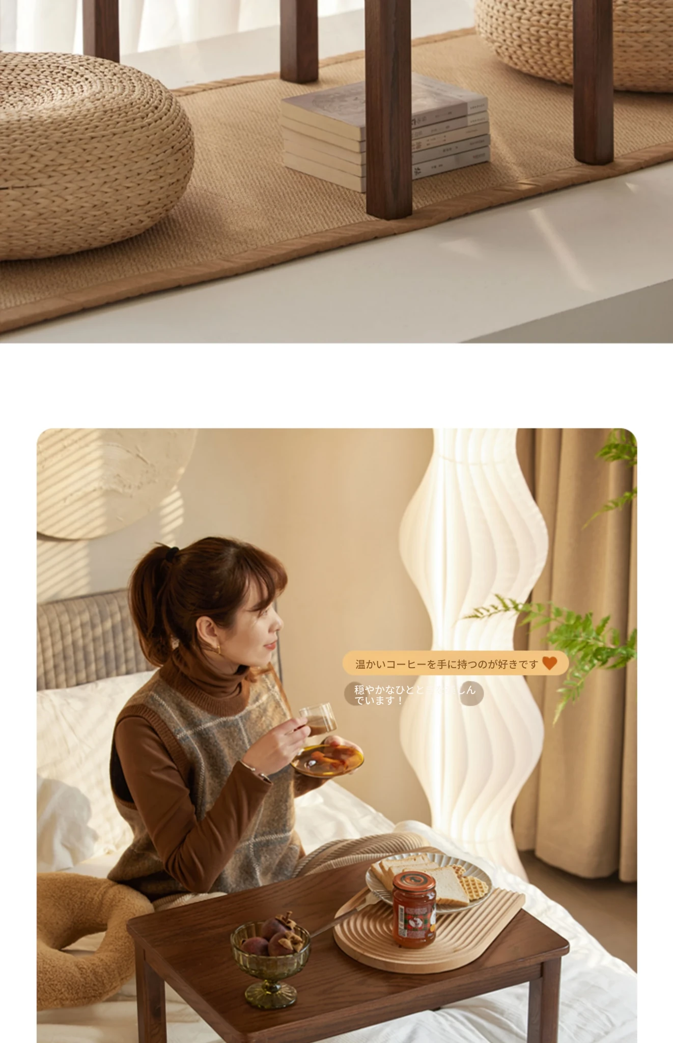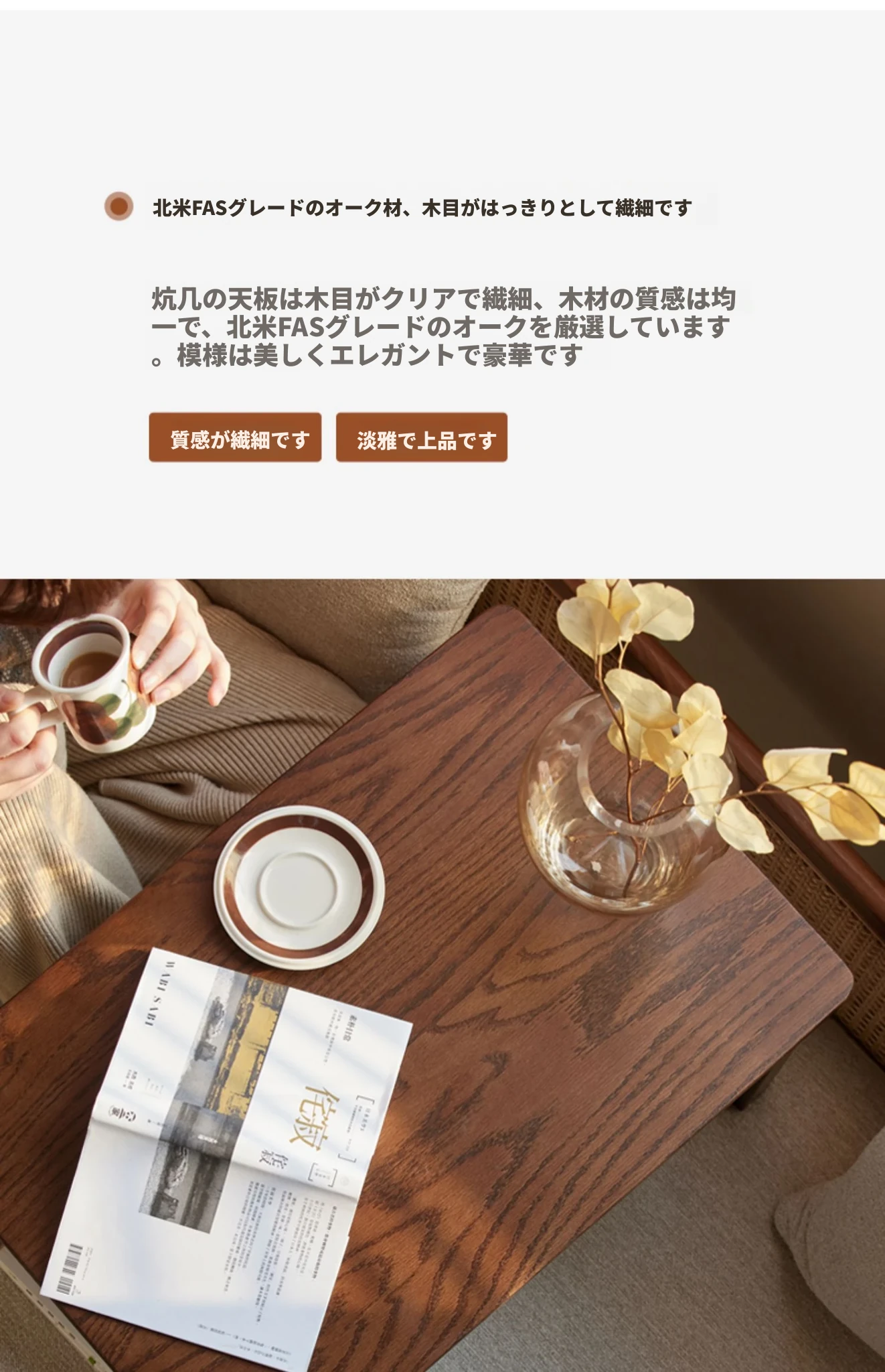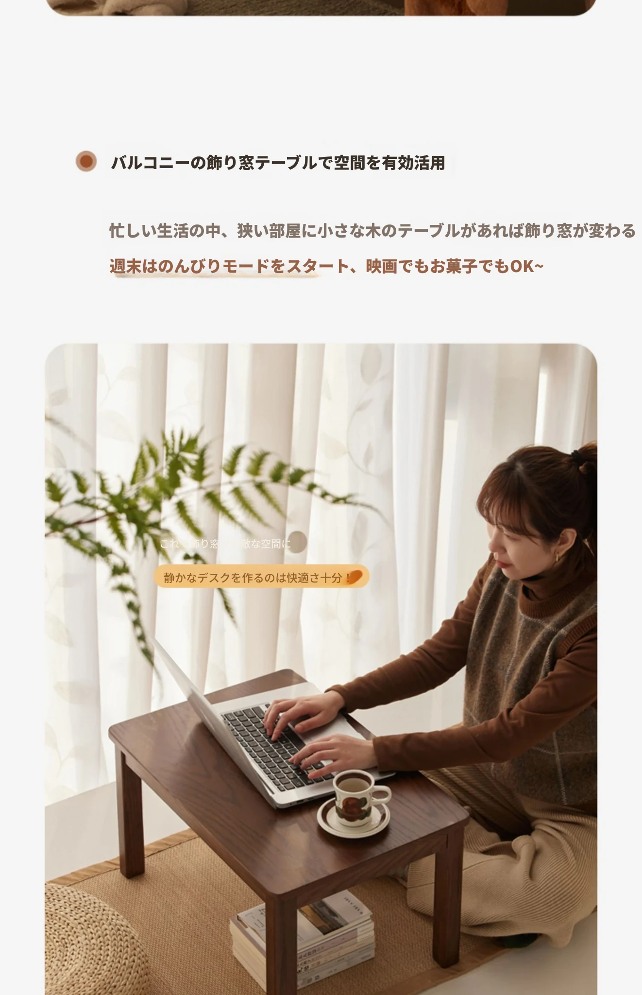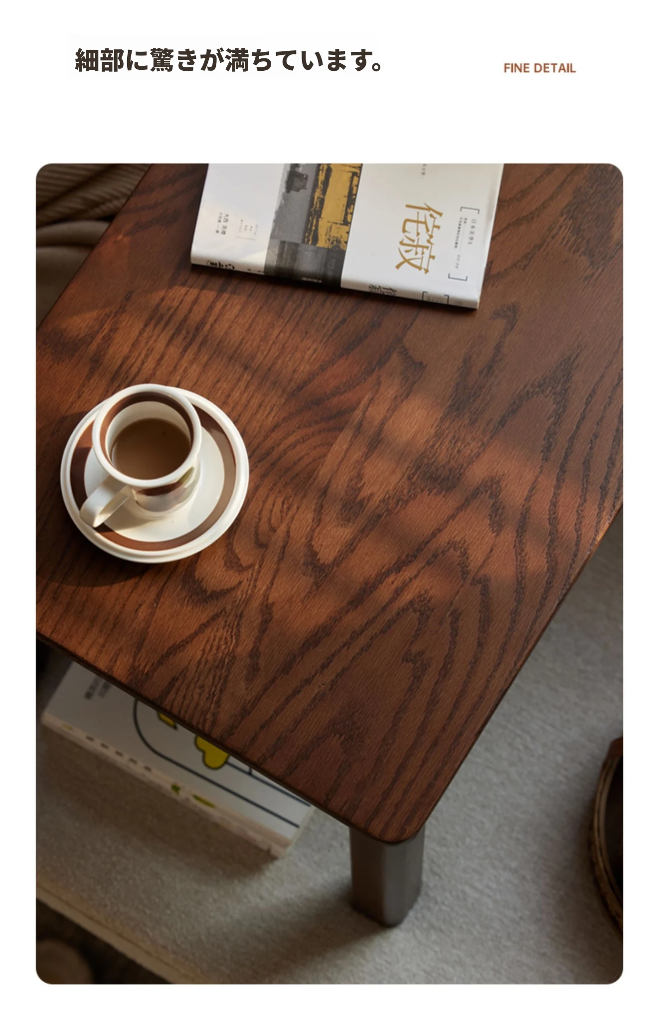 原木の魅力を活かした全実木のロースタイルテーブル!モダンでシンプルなデザイン、狭い部屋にもぴったり。榻榻米やフロアに最適なオーク材の低い茶卓、窓際に置いても美しい!