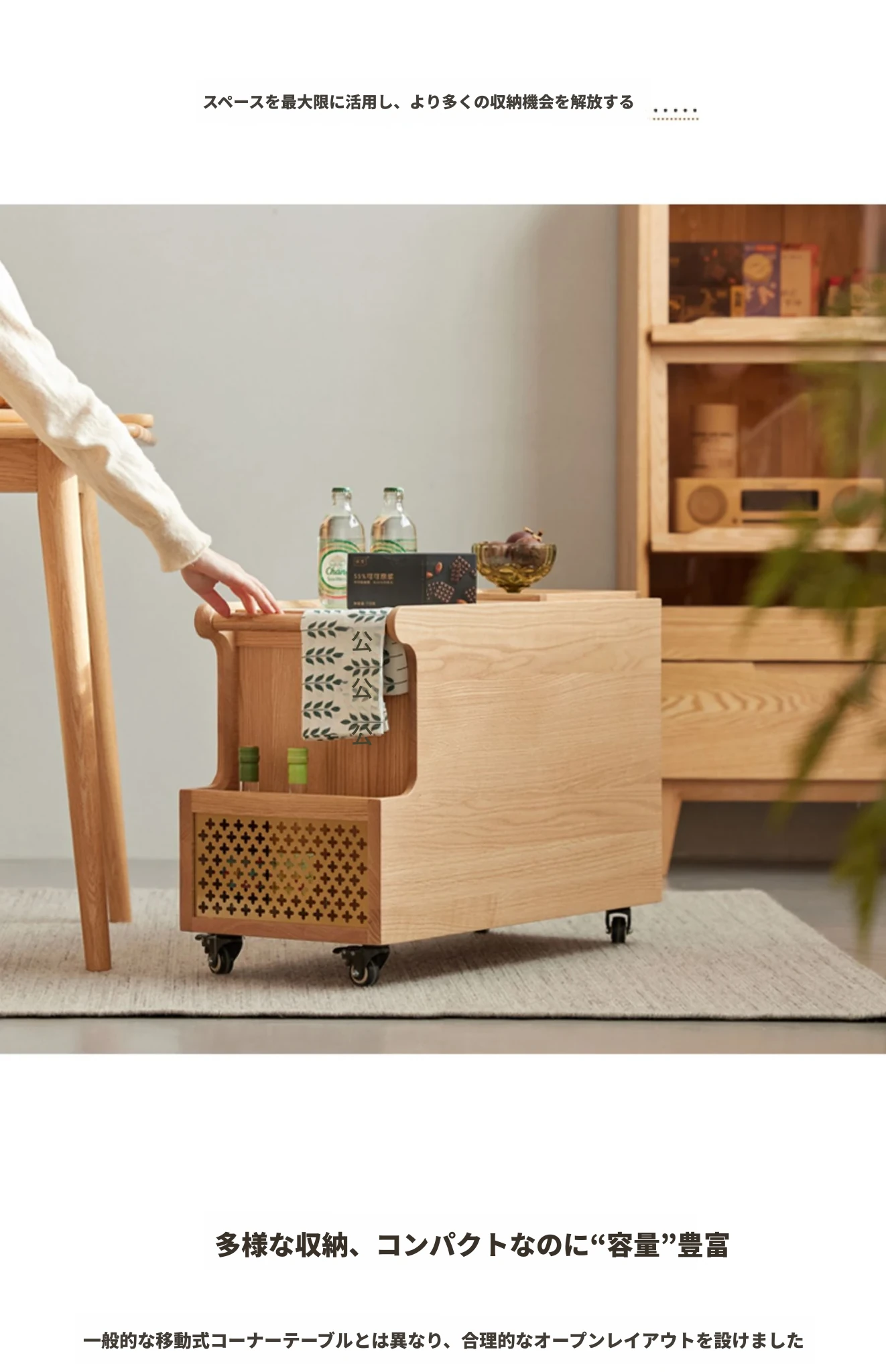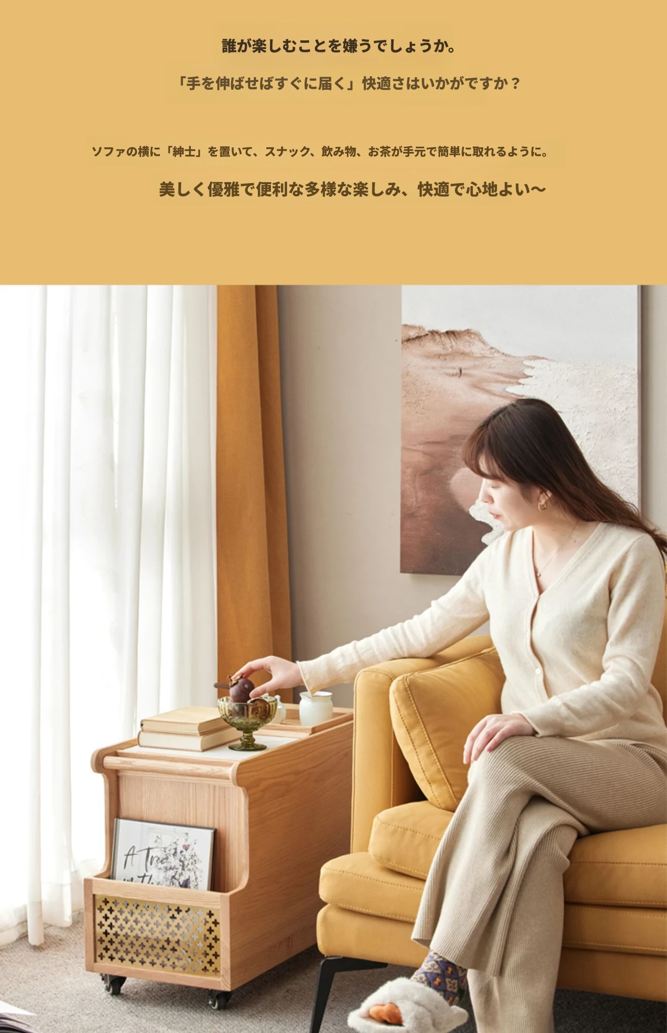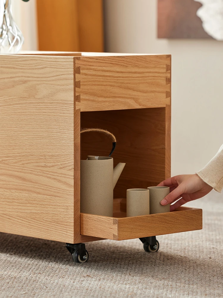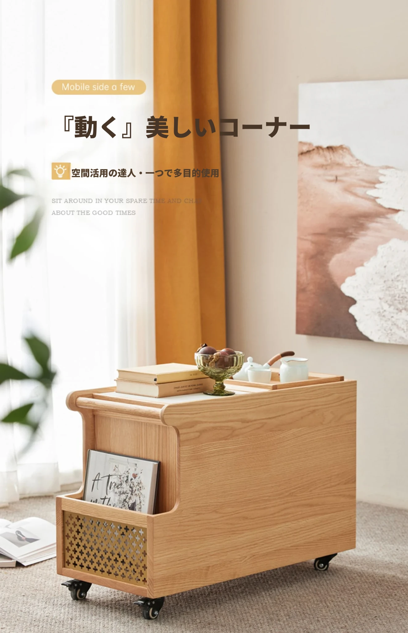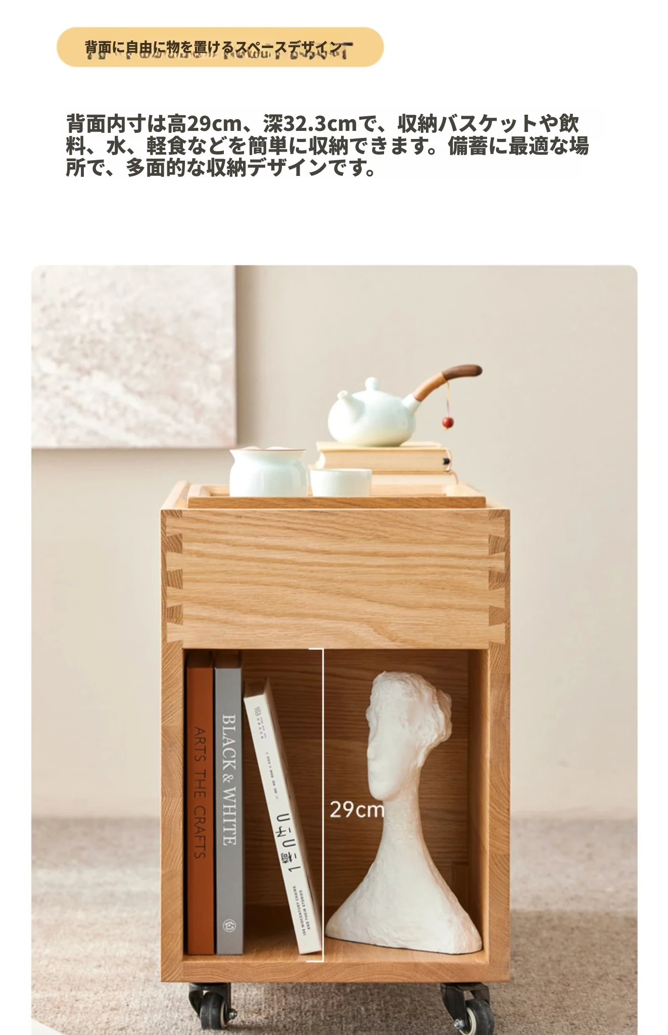 オリジナルエレメント無垢材サイドテーブル モダンミニマリスト 多機能ストレージキャビネット オーク製 キャスター付き 移動可能なソファサイドキャビネット - スタイリッシュな収納を実現!