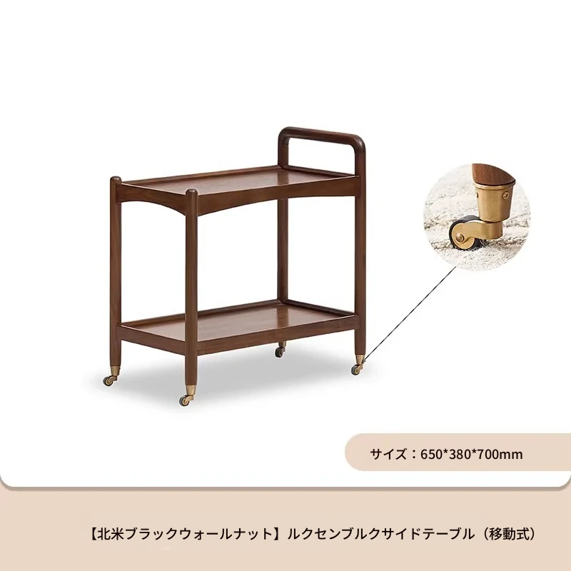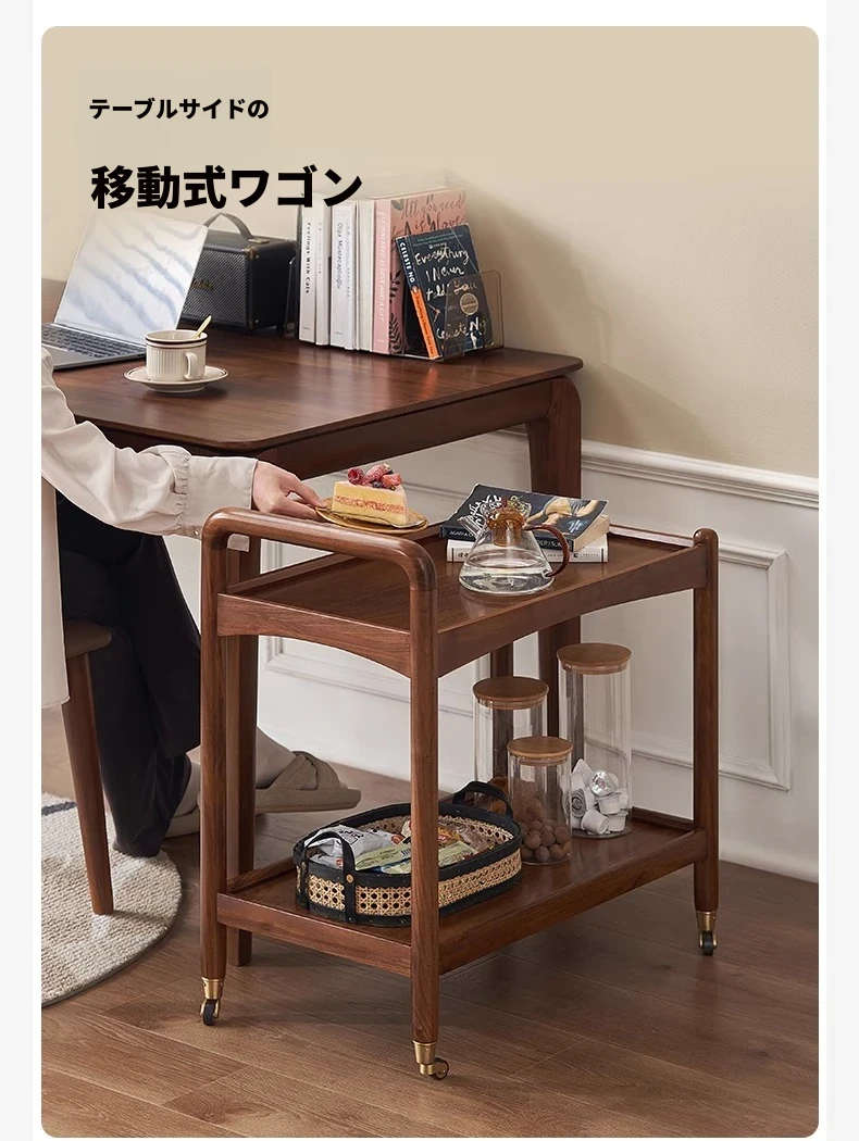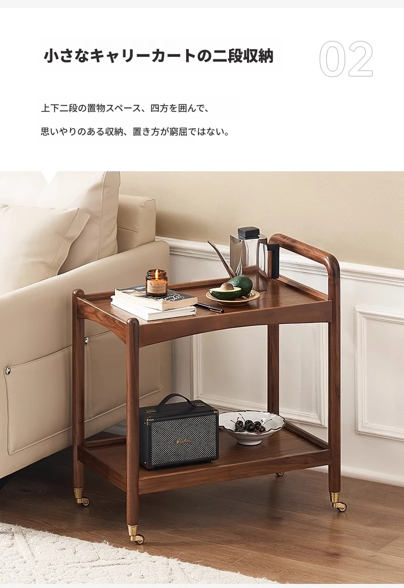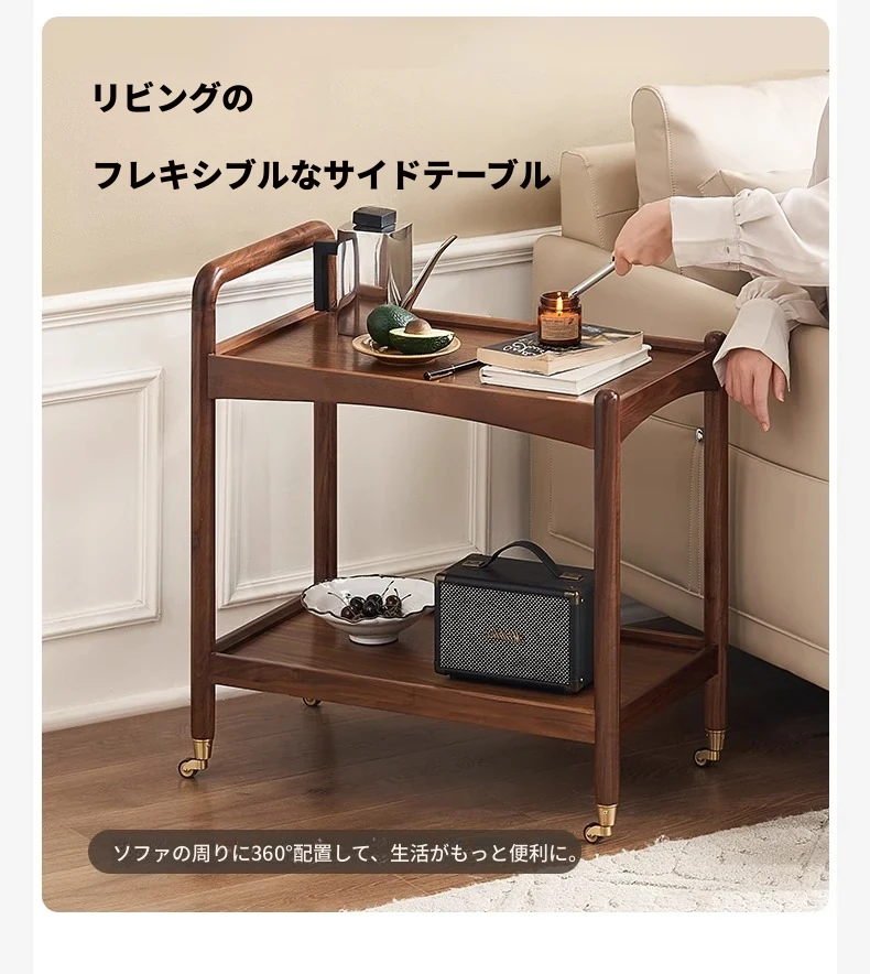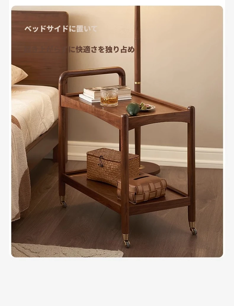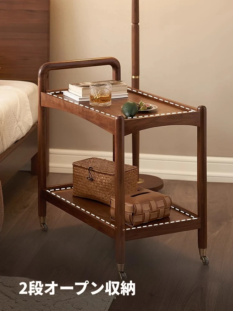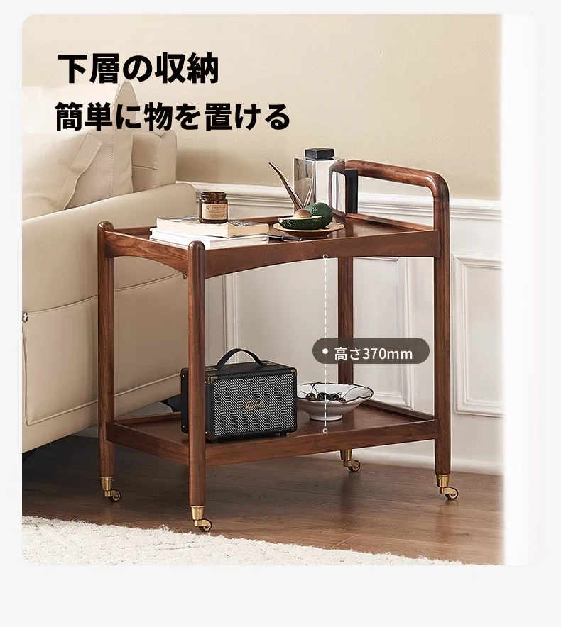 原木の北欧スタイル、ブラックウォルナット製の収納サイドテーブル。キャスター付きで移動も簡単!二段式デザインで、ソファの横にぴったりの実用的な小型ワゴン。おしゃれな空間を演出します!