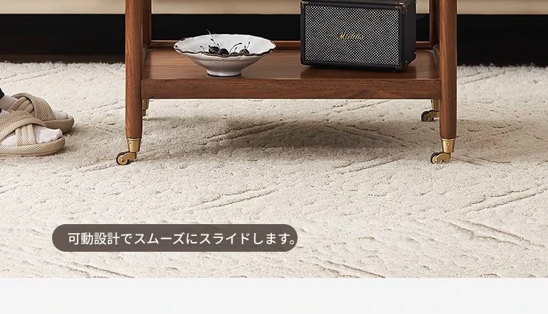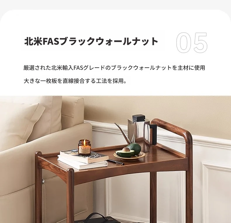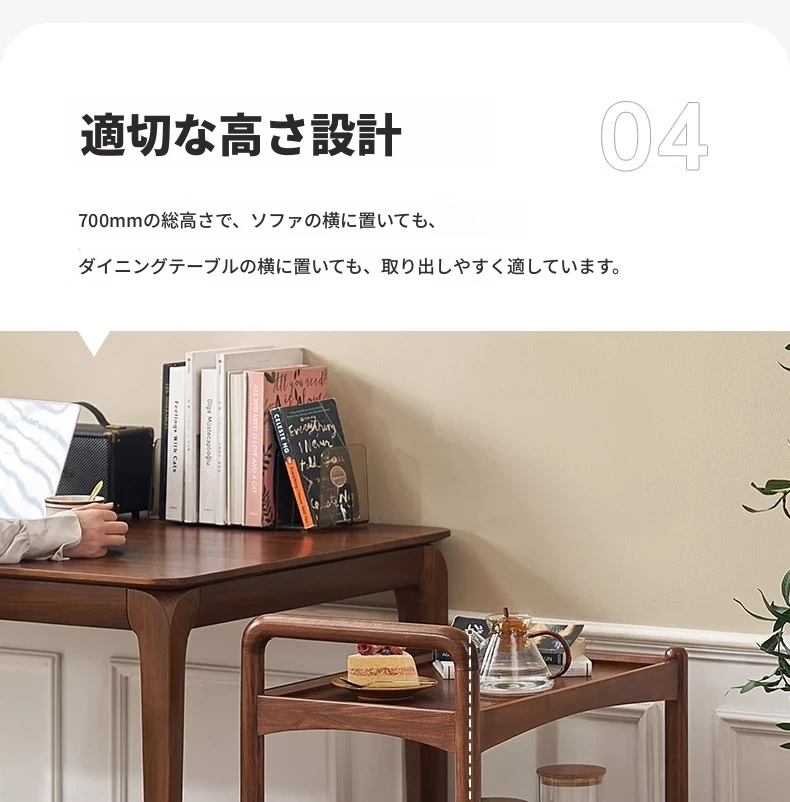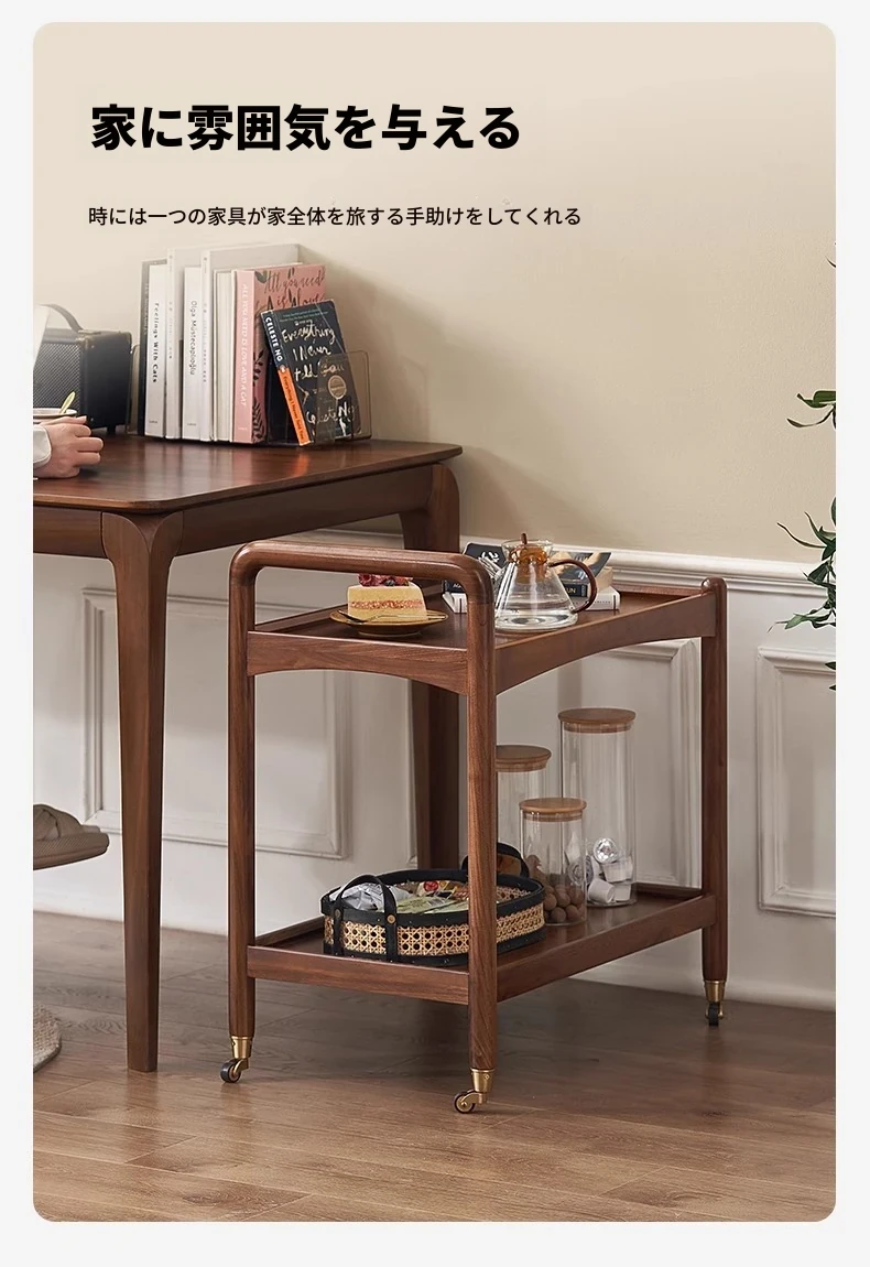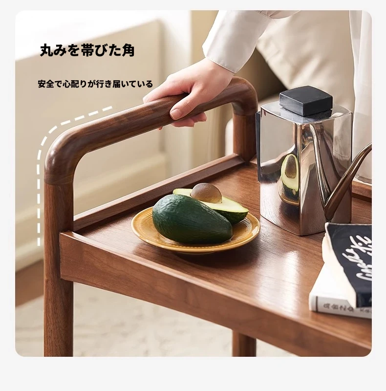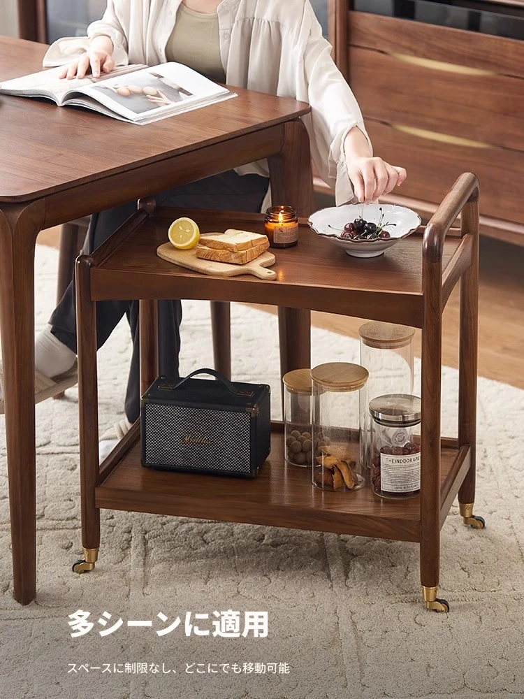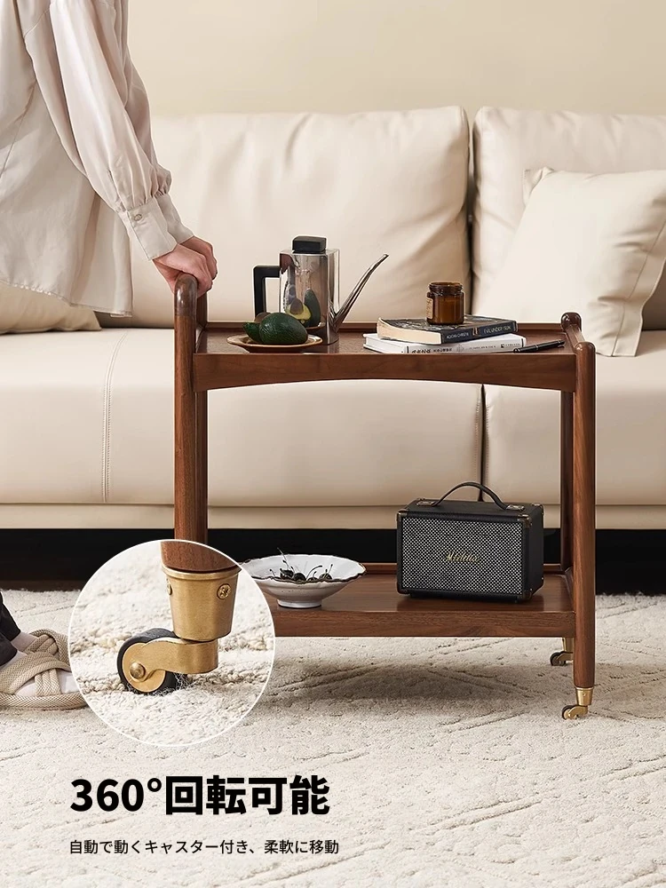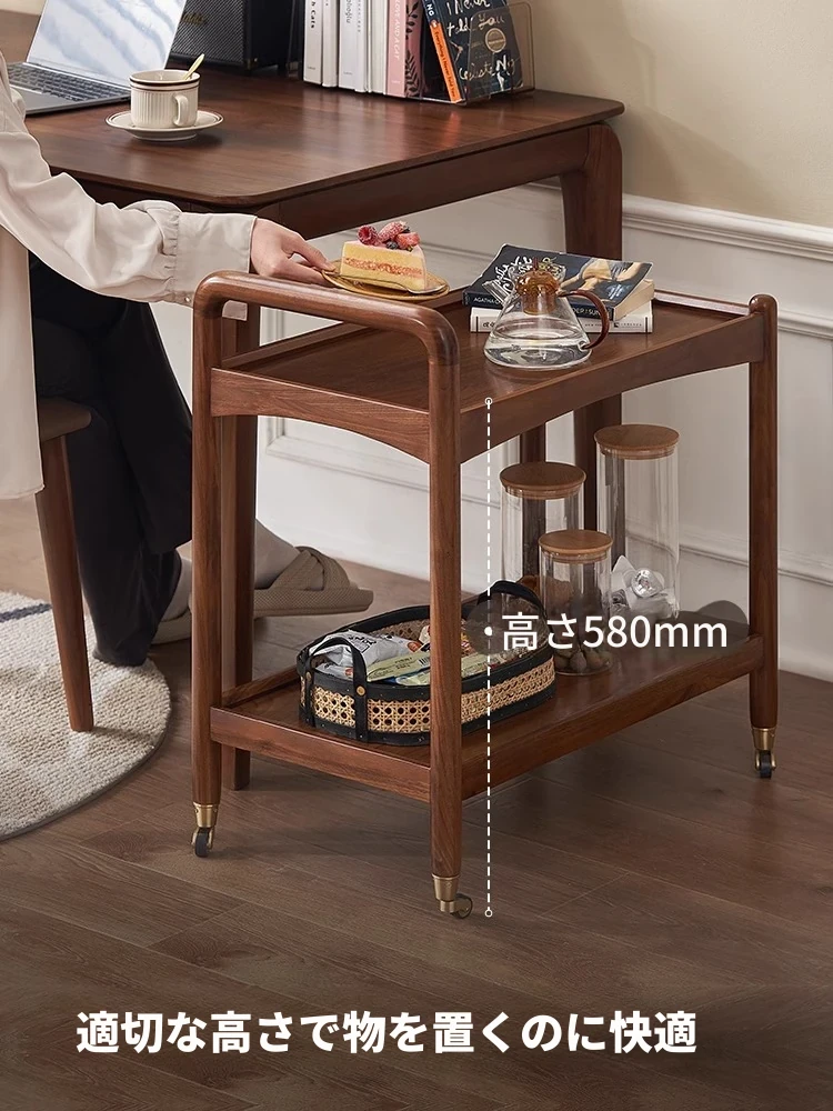 原木の北欧スタイル、ブラックウォルナット製の収納サイドテーブル。キャスター付きで移動も簡単!二段式デザインで、ソファの横にぴったりの実用的な小型ワゴン。おしゃれな空間を演出します!