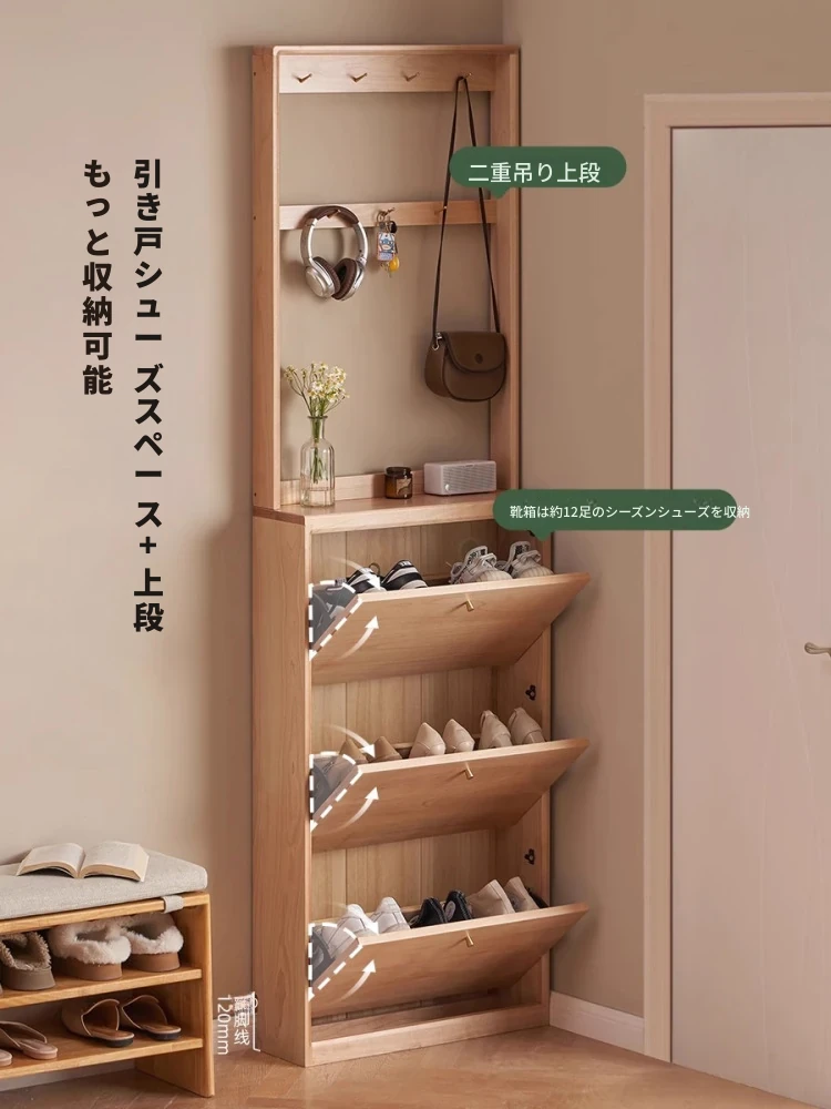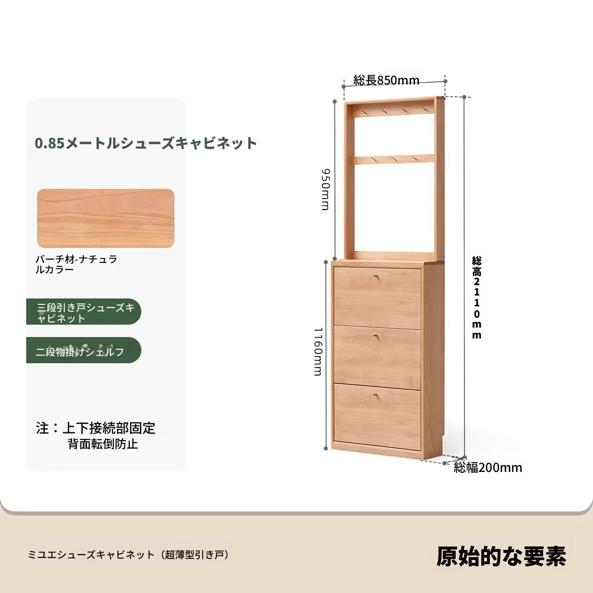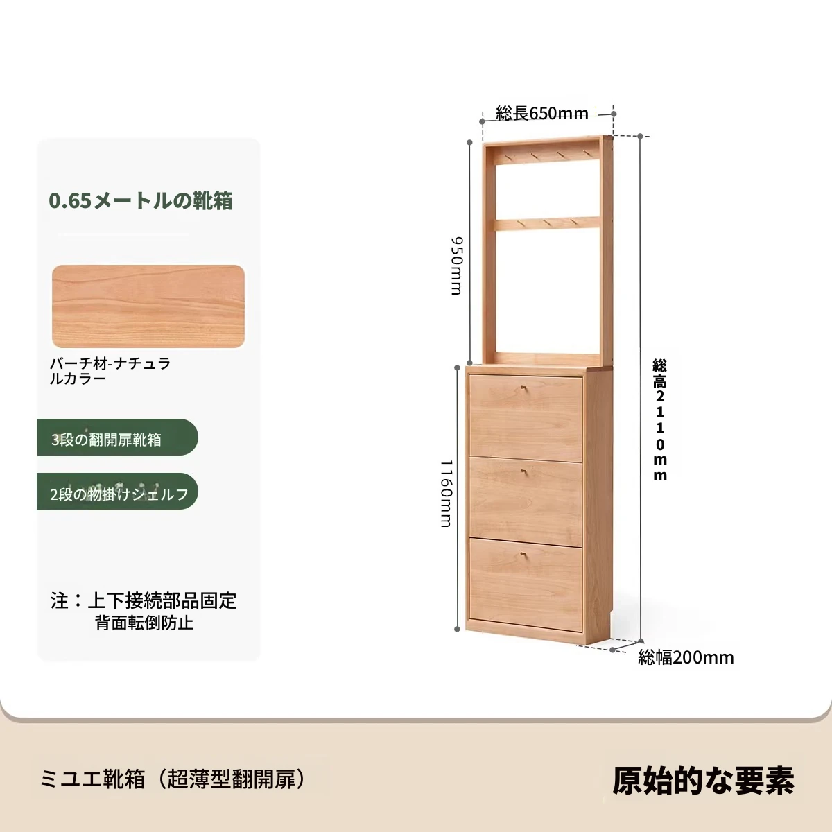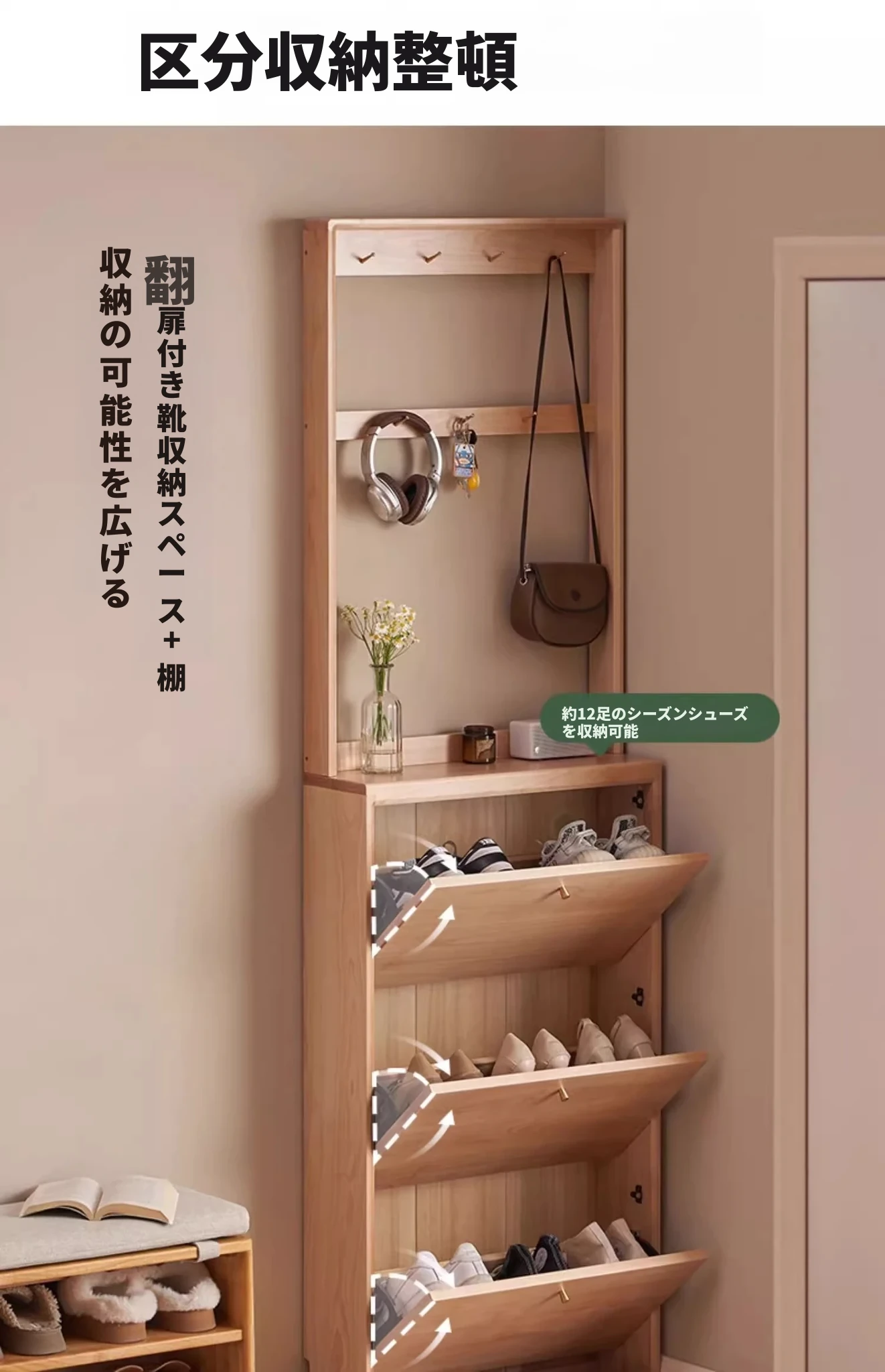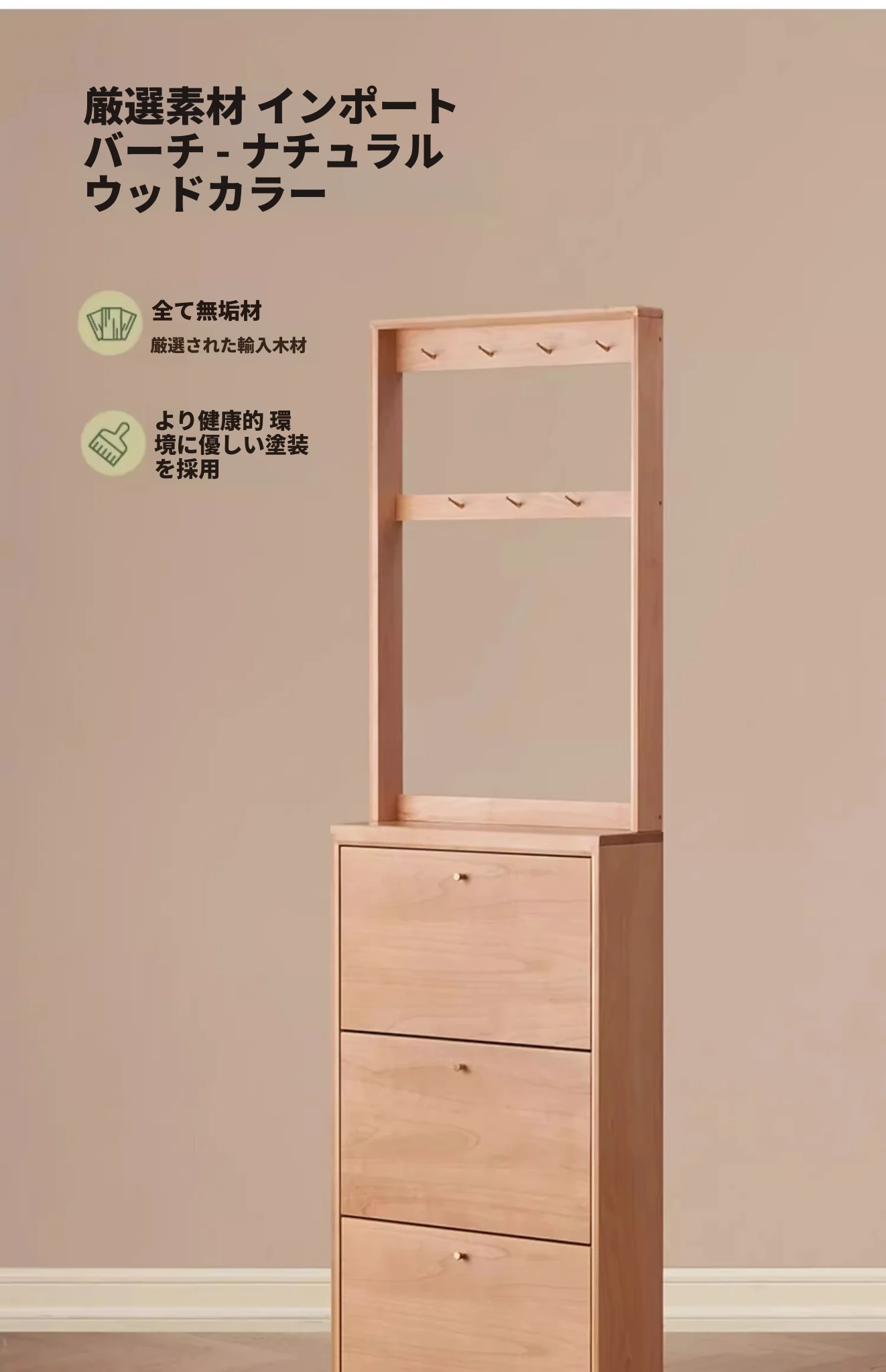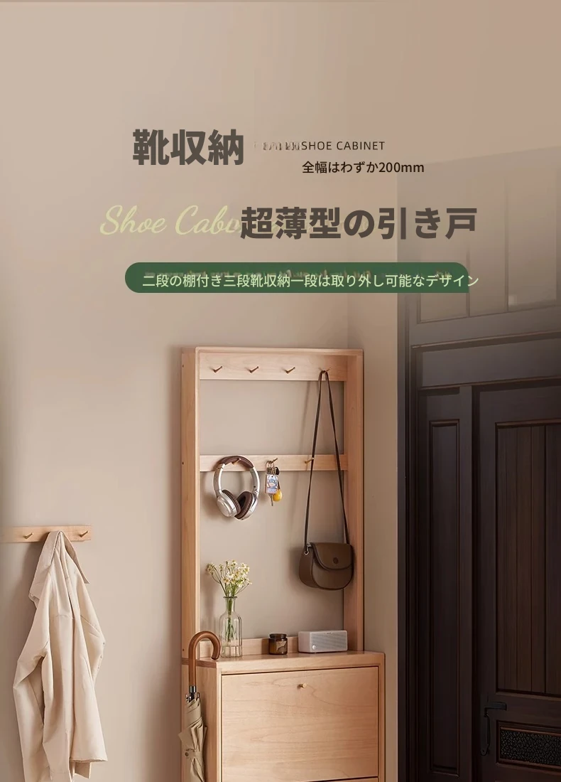オリジナルエレメンツ無垢材スリムシューズキャビネット、翻転ドアで多層収納!玄関や入居時に最適なコートハンガーも兼ね備えたおしゃれなシューズラック。狭いスペースにもぴったりフィット!