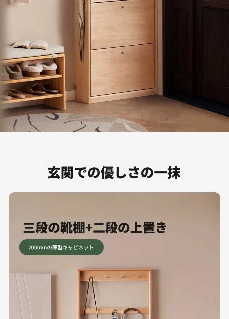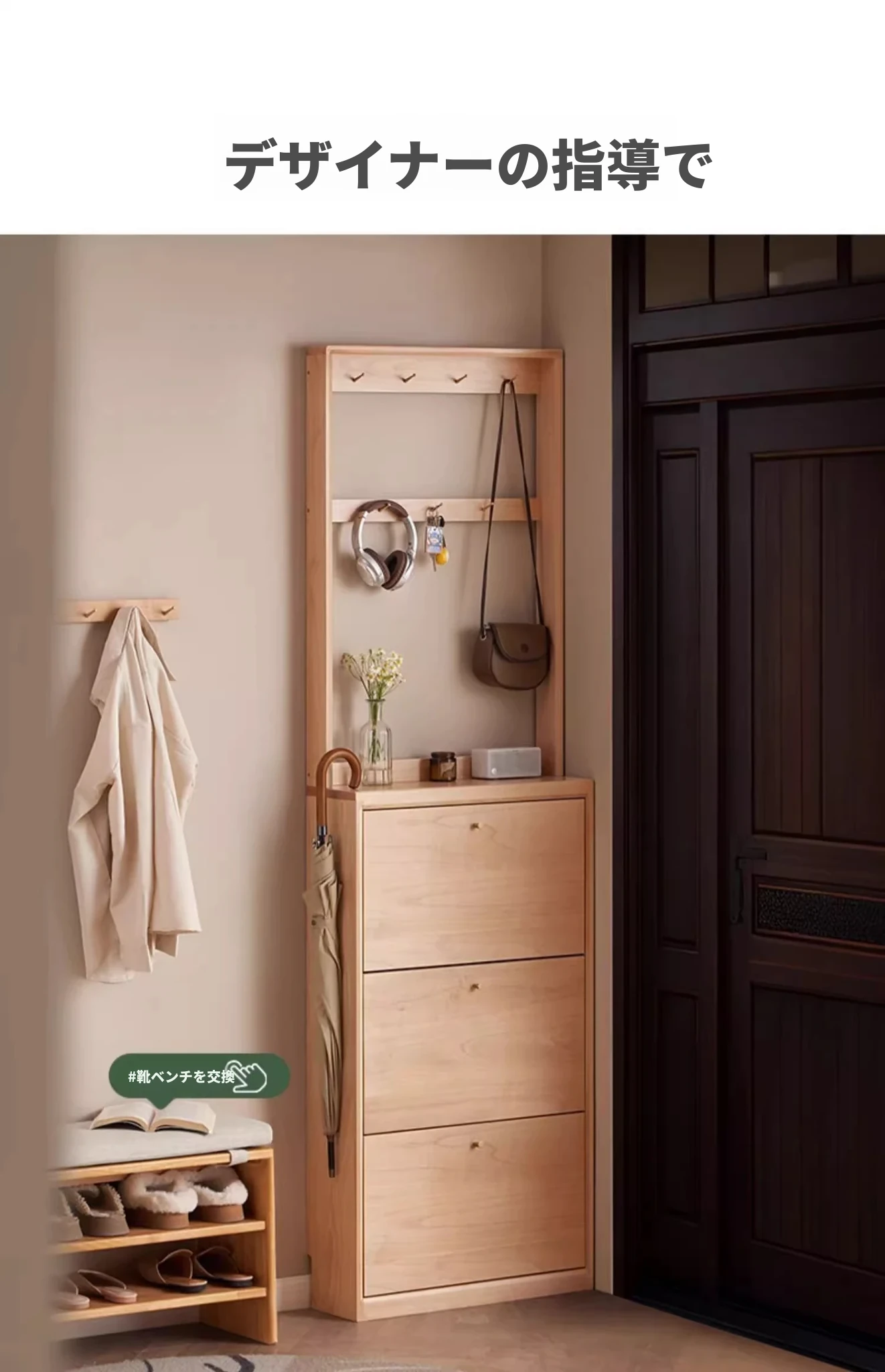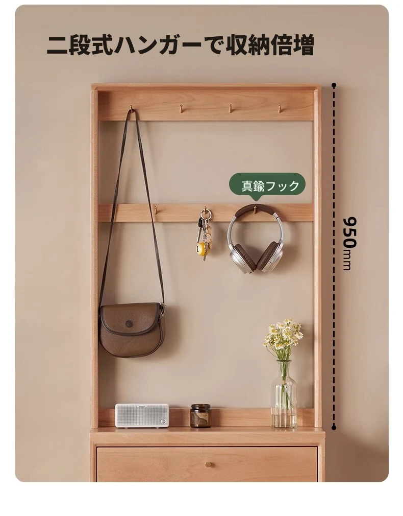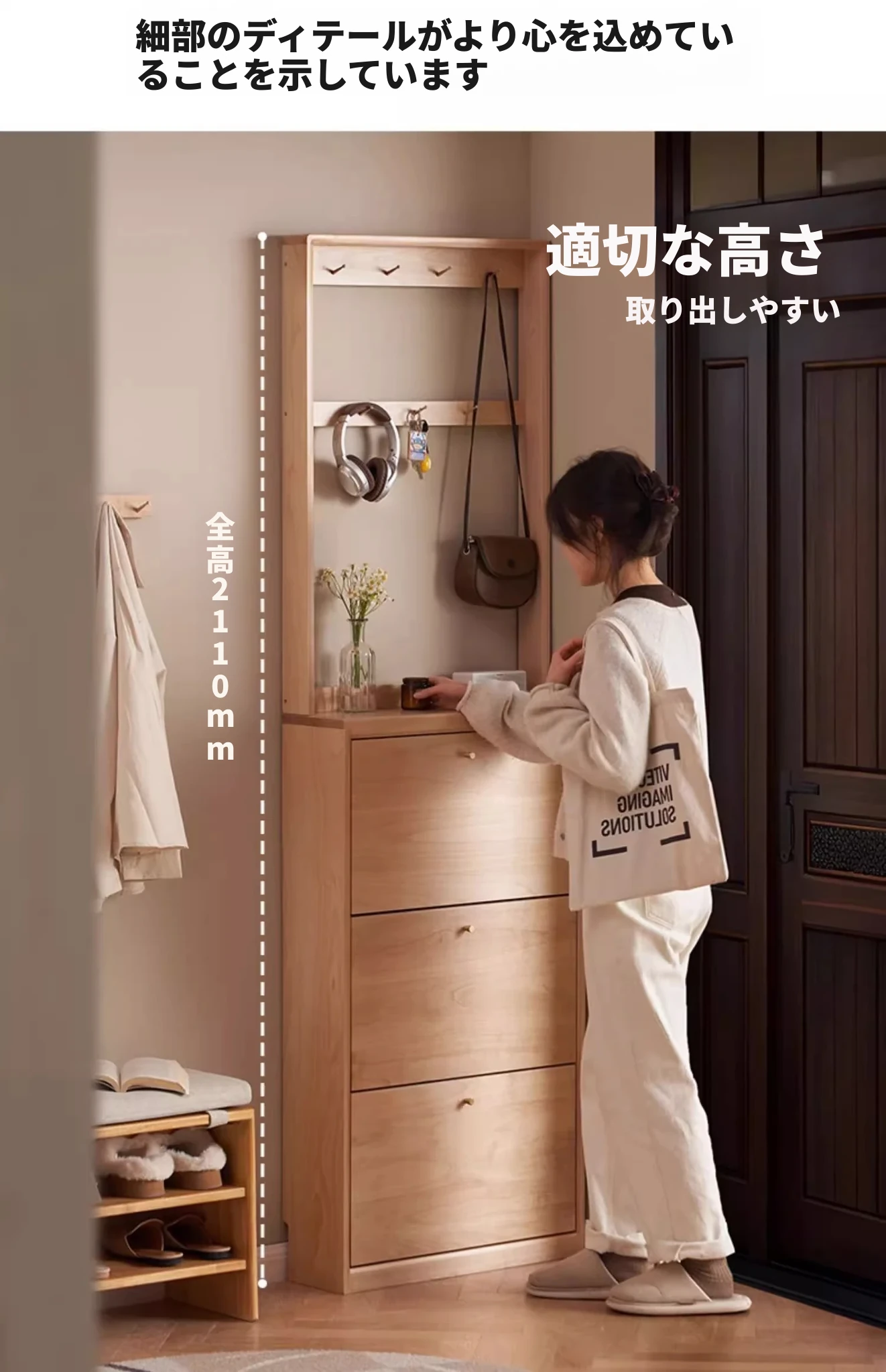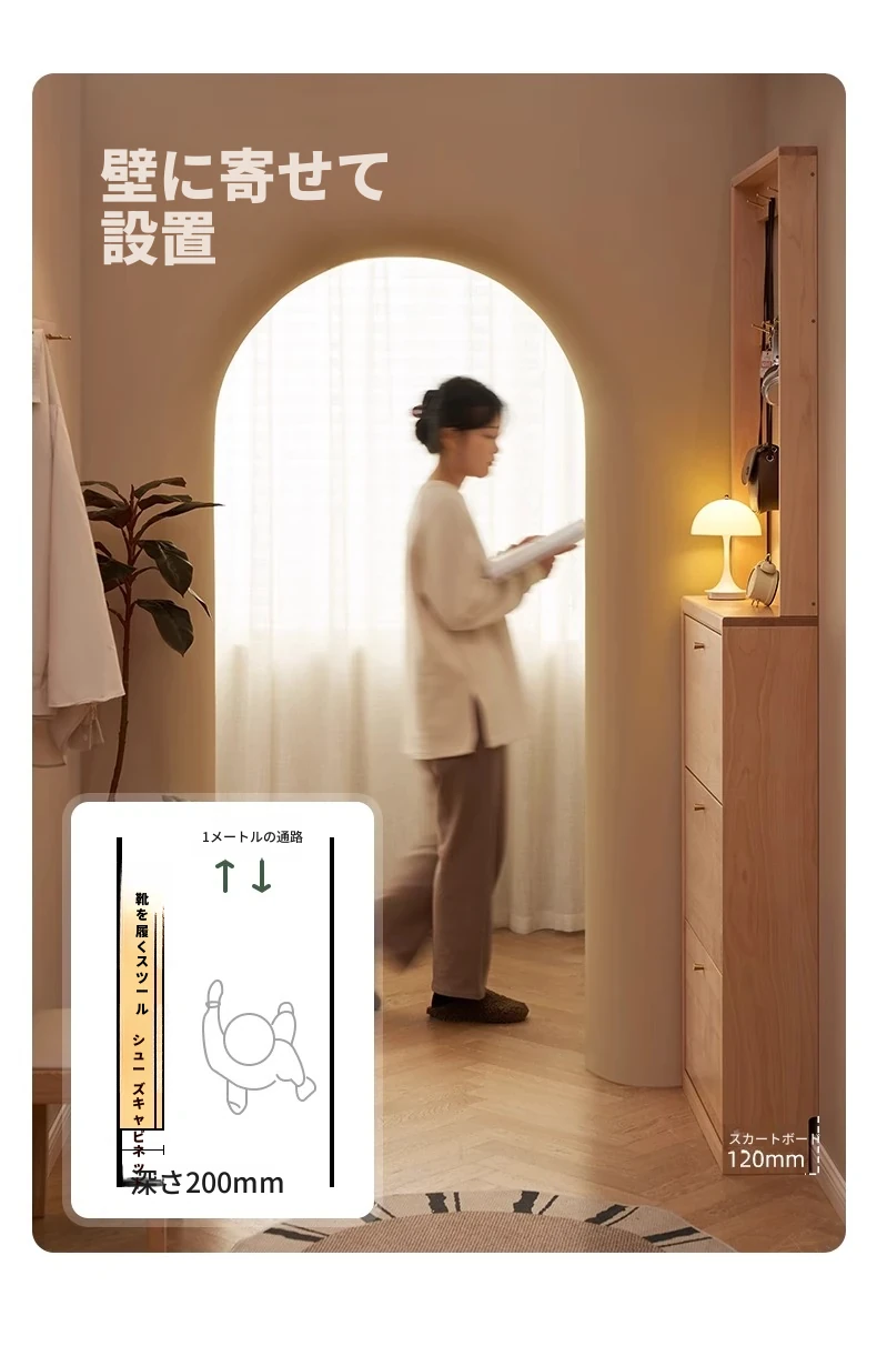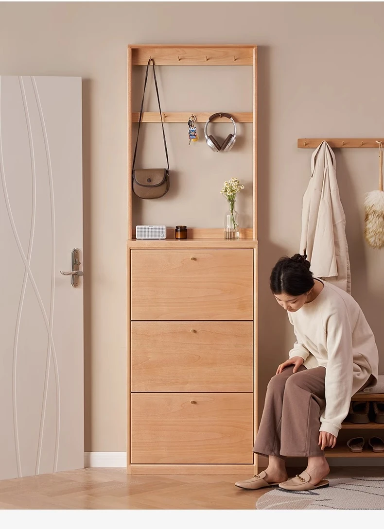 オリジナルエレメンツ無垢材スリムシューズキャビネット、翻転ドアで多層収納!玄関や入居時に最適なコートハンガーも兼ね備えたおしゃれなシューズラック。狭いスペースにもぴったりフィット!