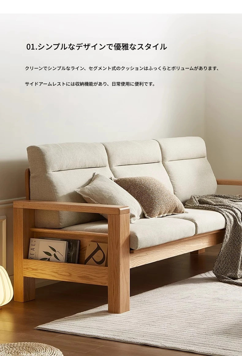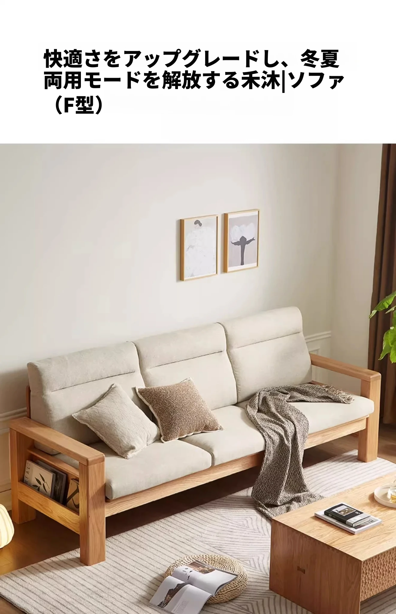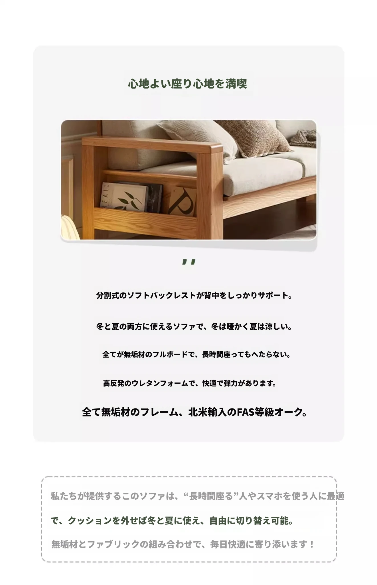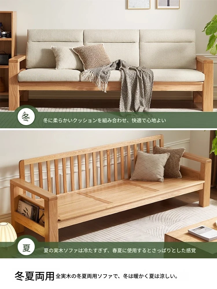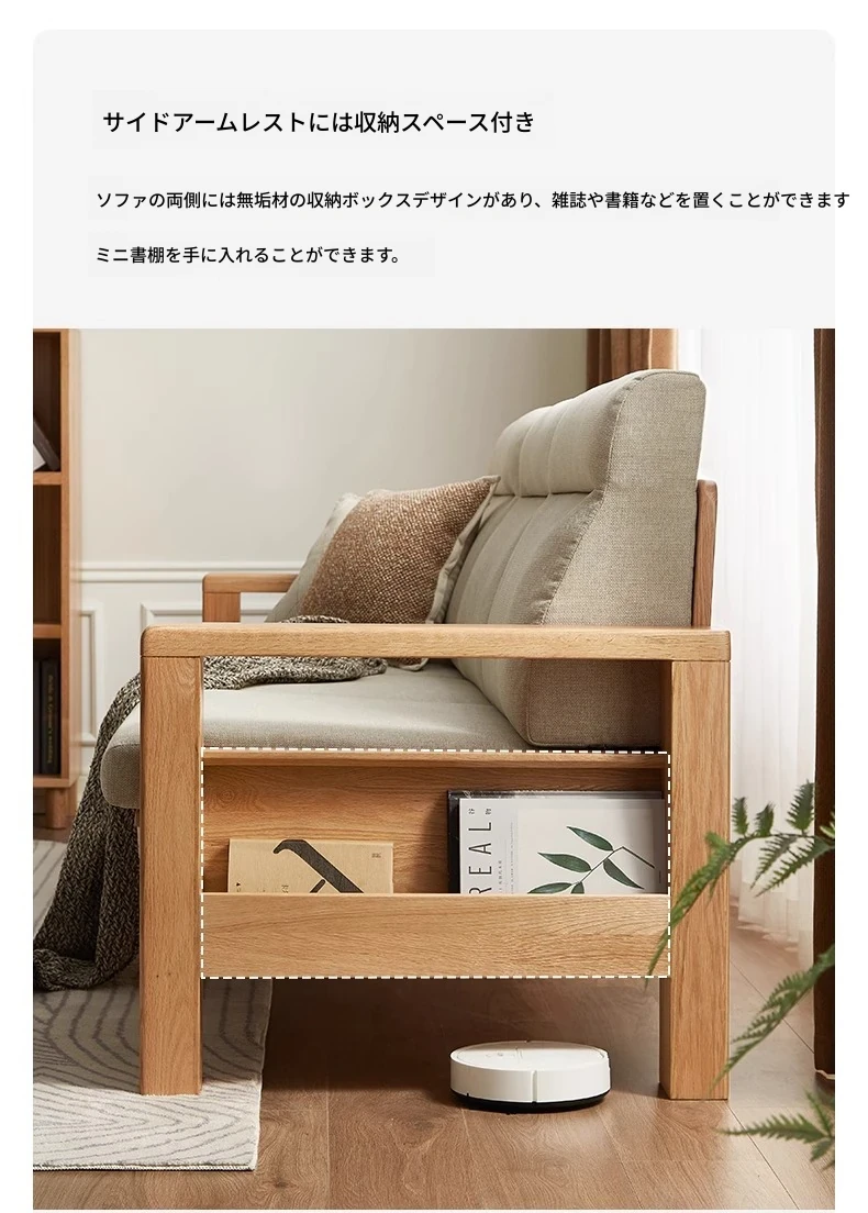 原木無垢材使用!収納付き3人掛けソファ - オーク材製、小型リビングに最適!冬も夏も快適に過ごせる実用的なソファ。高品質な無垢家具で、心地よい空間を演出します。