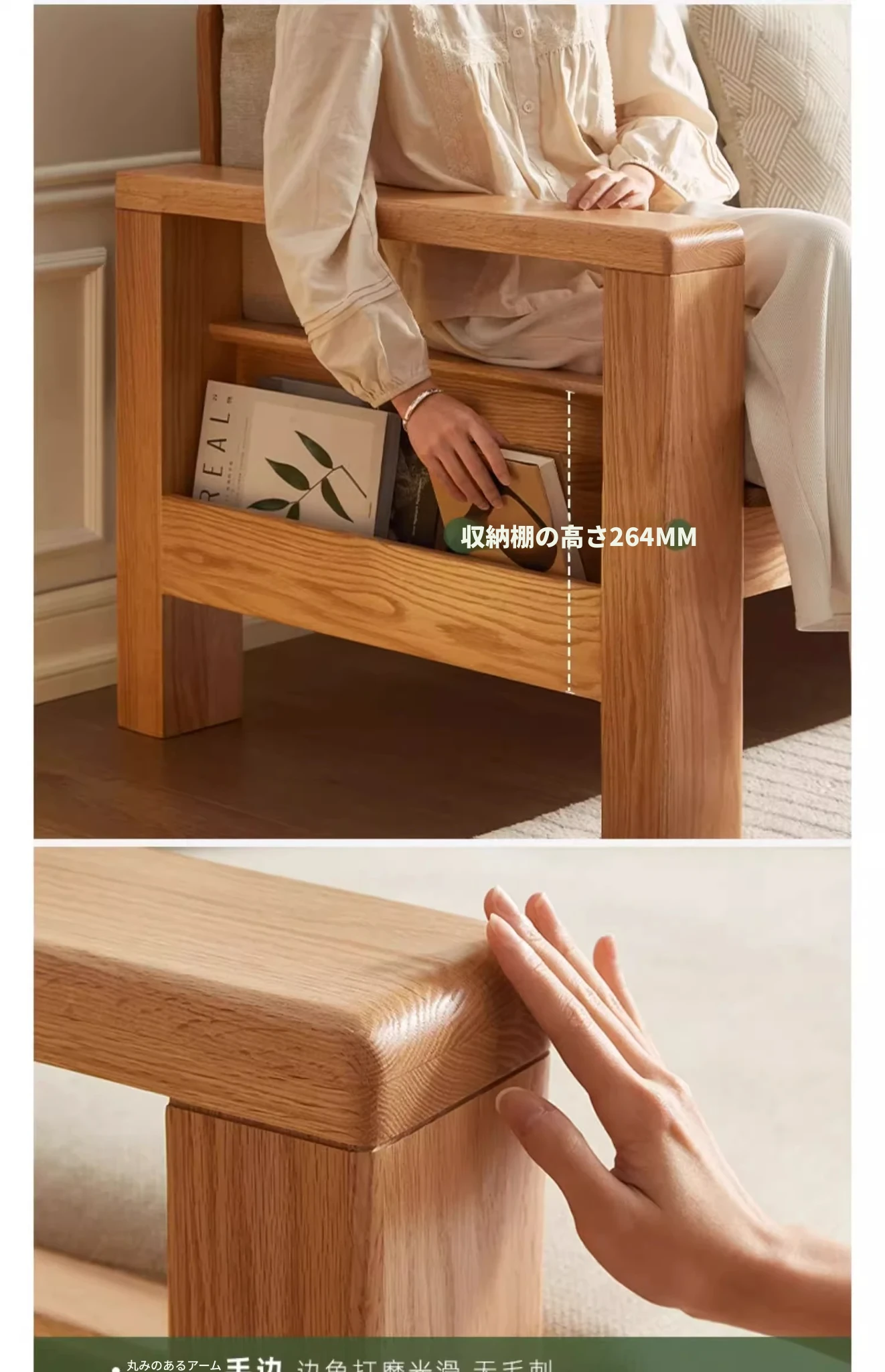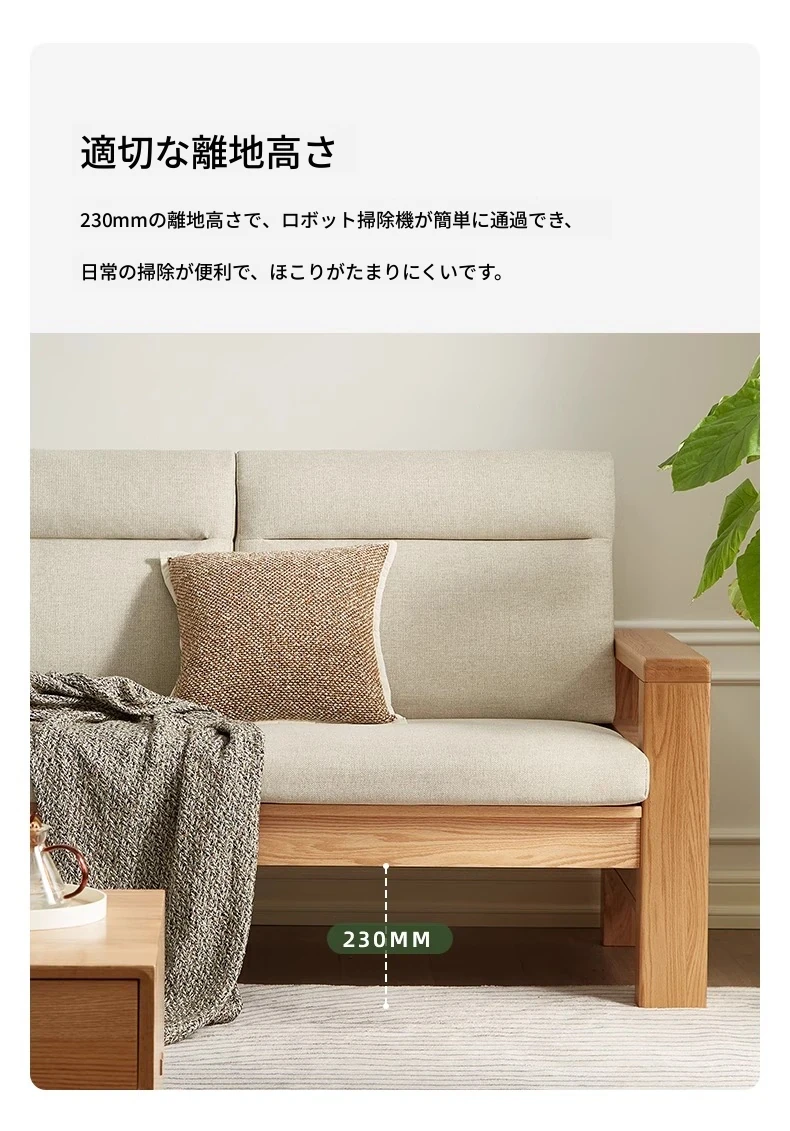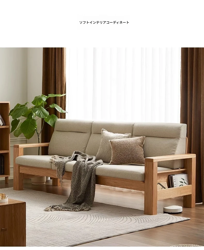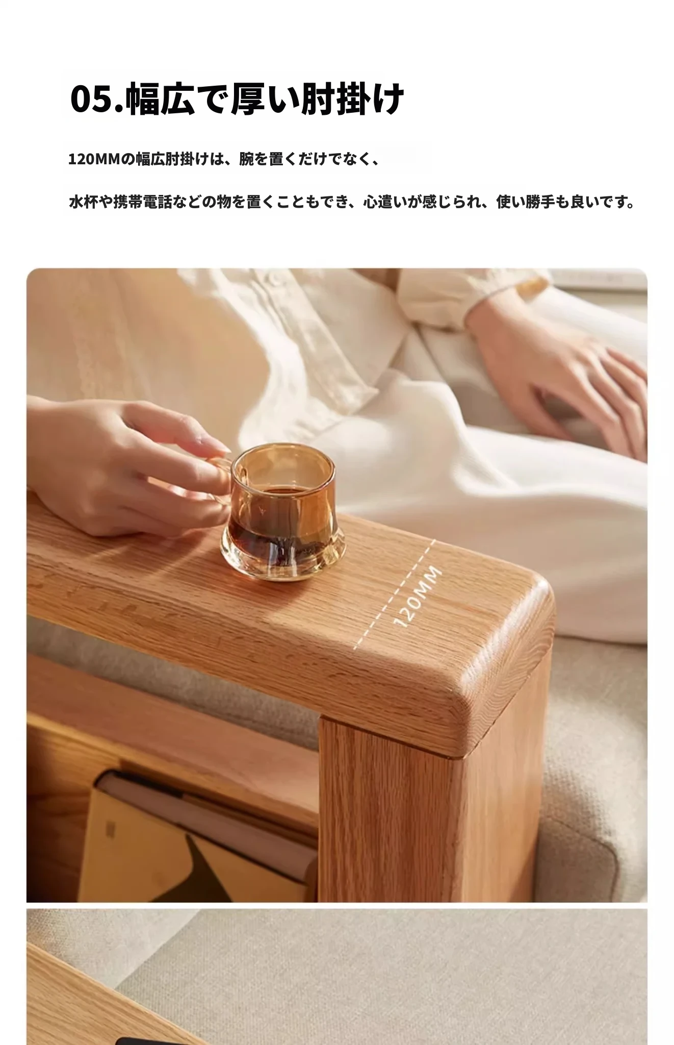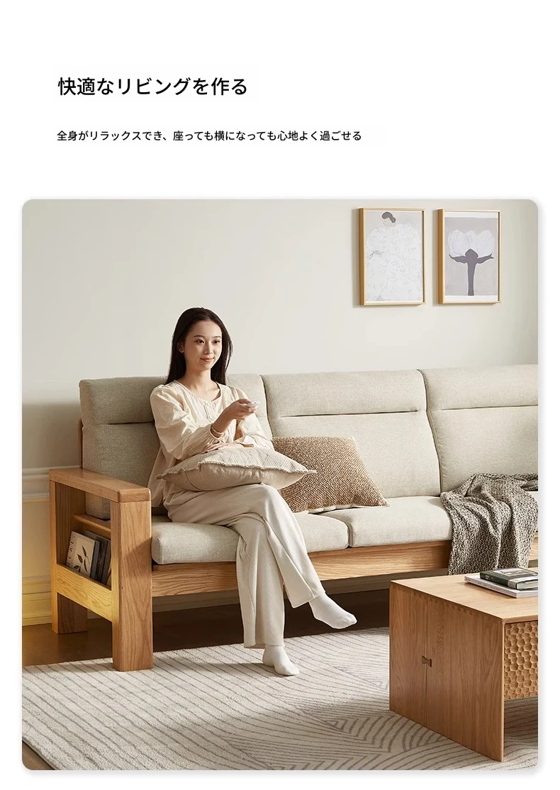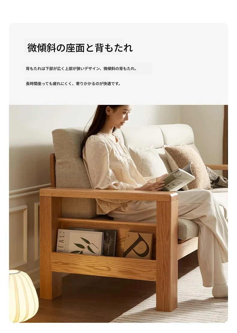 原木無垢材使用!収納付き3人掛けソファ - オーク材製、小型リビングに最適!冬も夏も快適に過ごせる実用的なソファ。高品質な無垢家具で、心地よい空間を演出します。