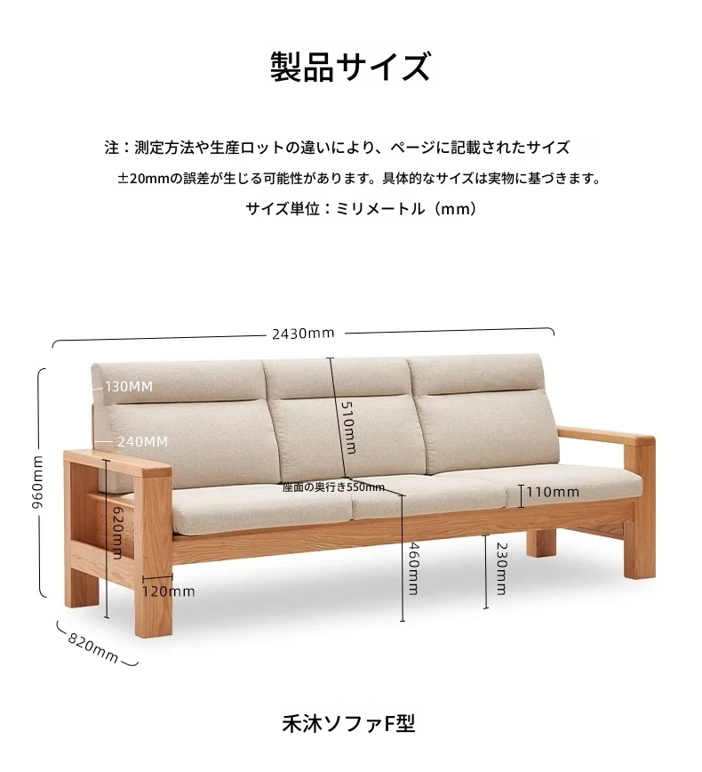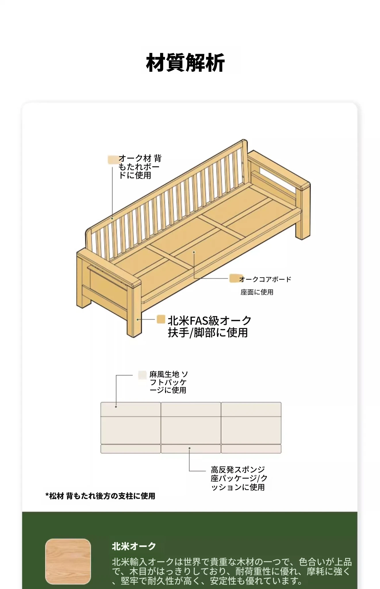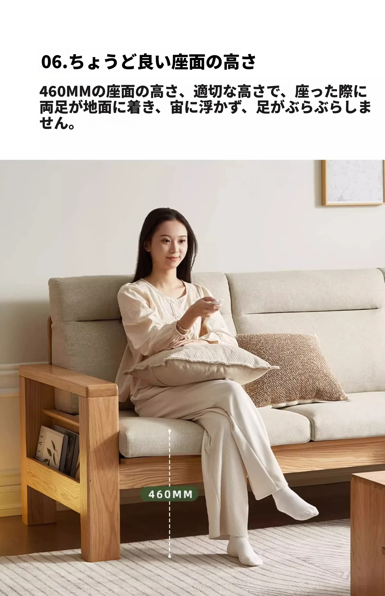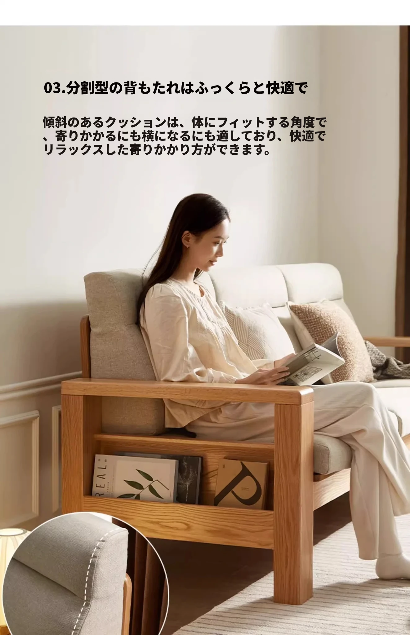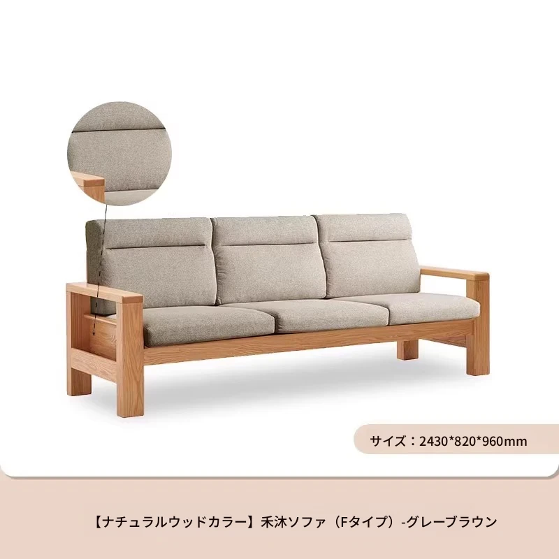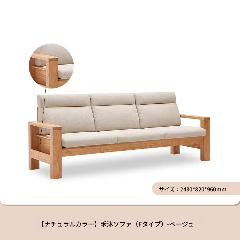 原木無垢材使用!収納付き3人掛けソファ - オーク材製、小型リビングに最適!冬も夏も快適に過ごせる実用的なソファ。高品質な無垢家具で、心地よい空間を演出します。