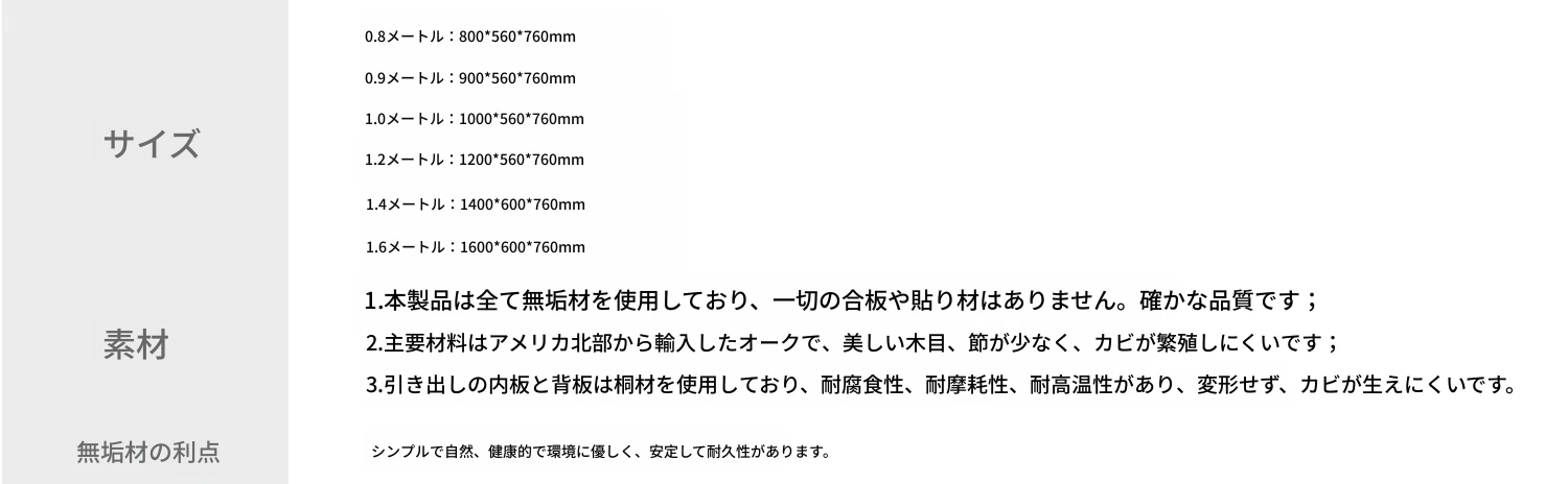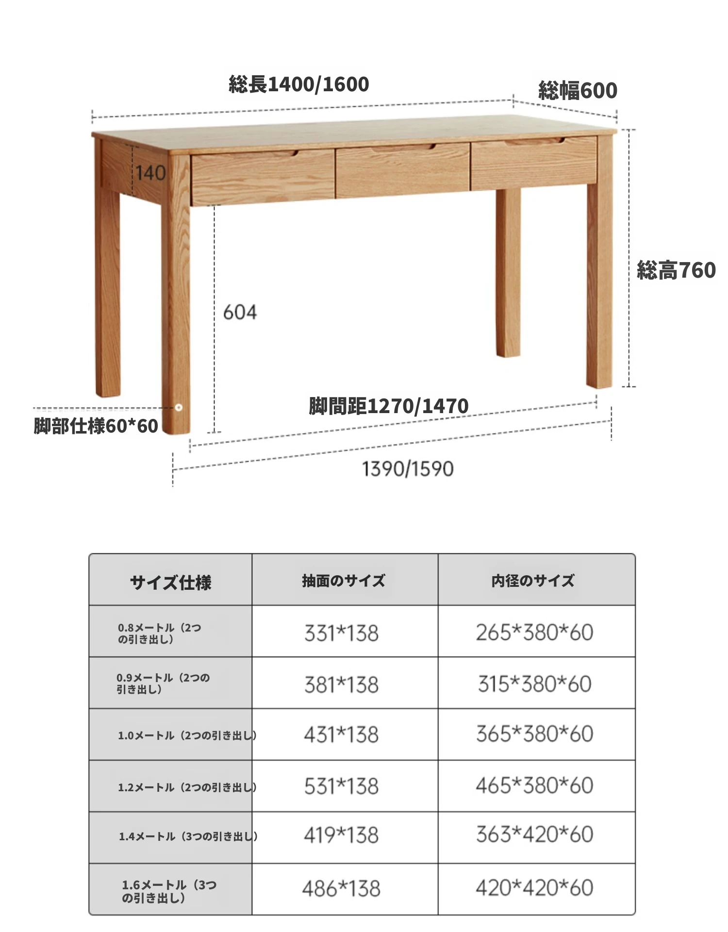1.6m引き出し3つ-アップグレードA版【ナチュラルカラー】 1600*600*760mm
