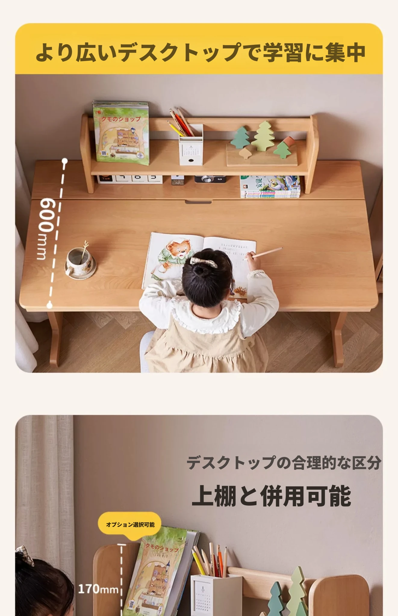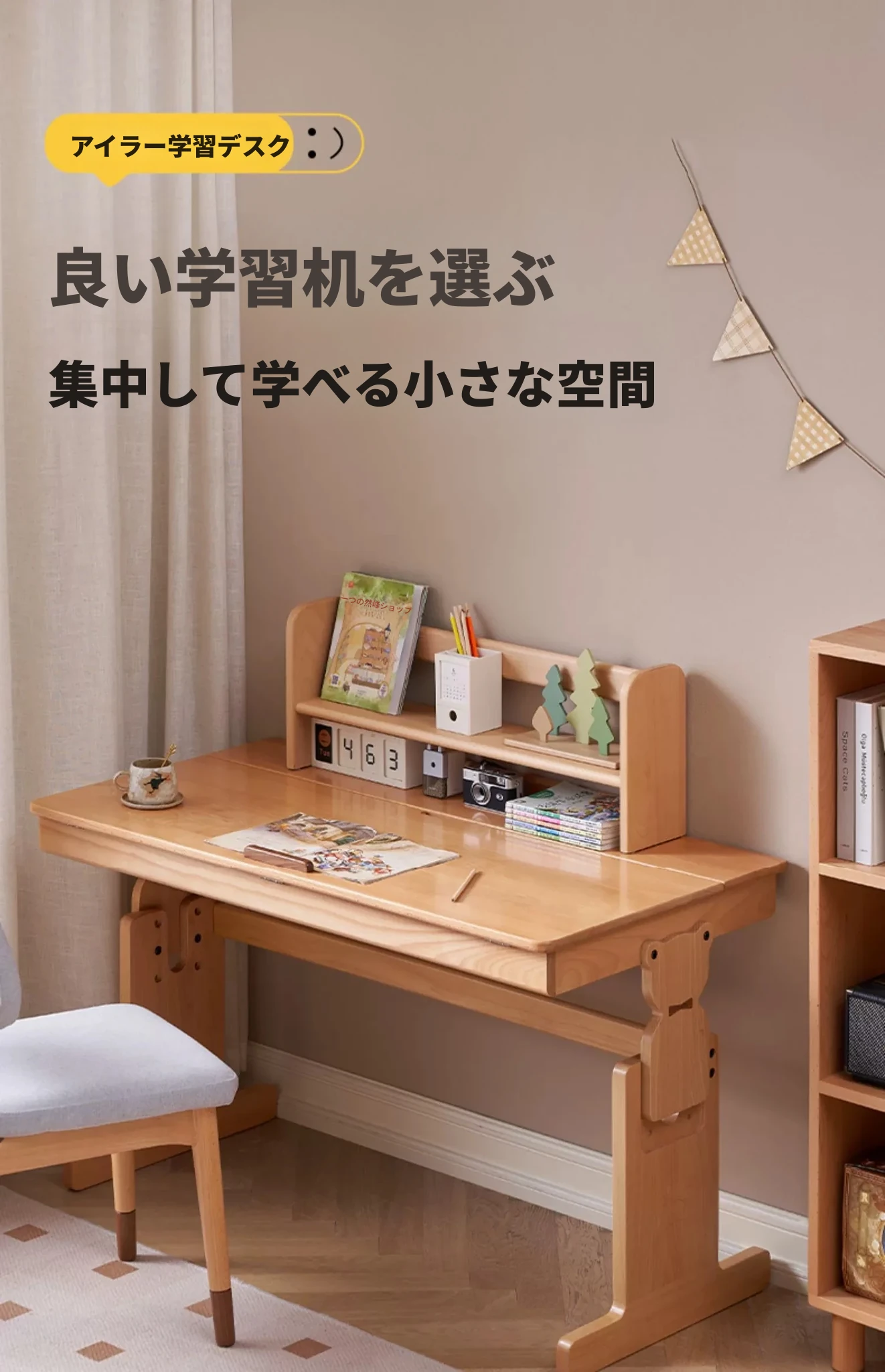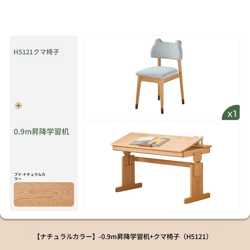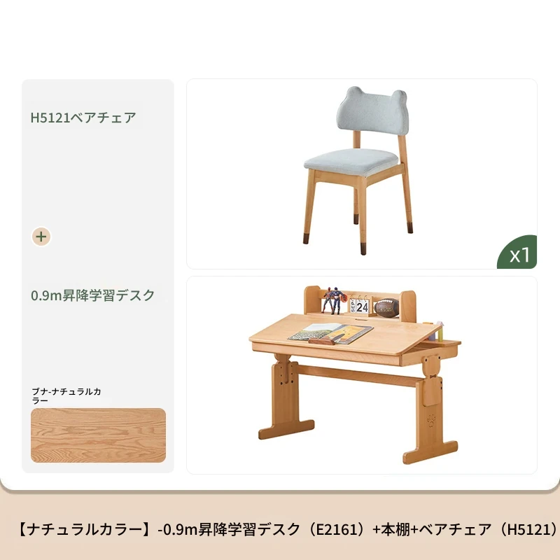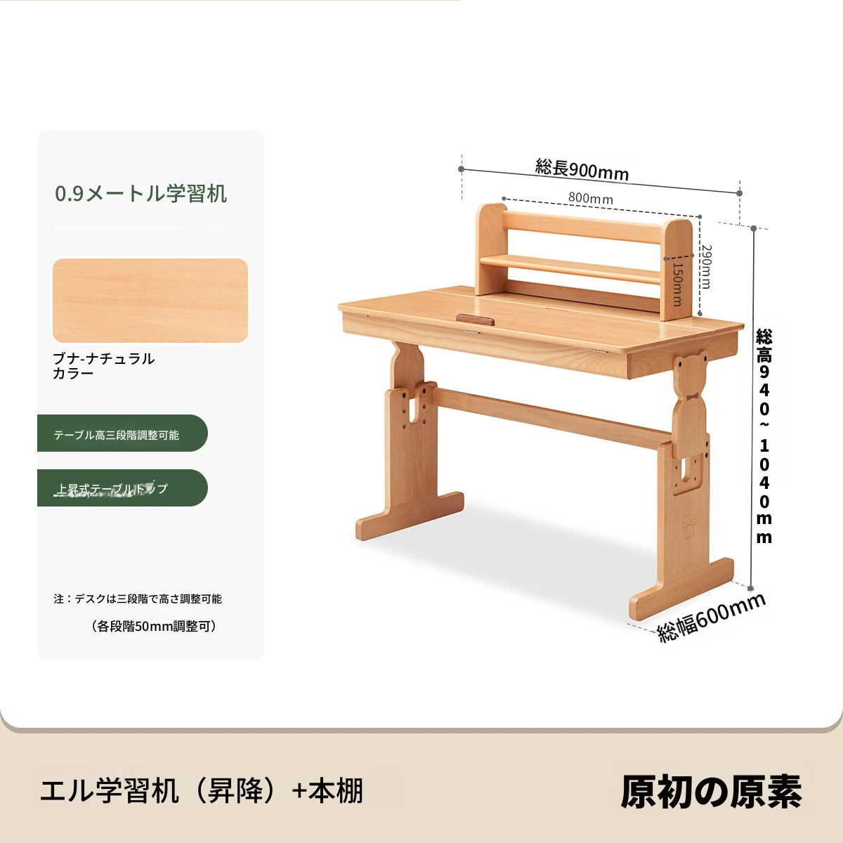 原木色0.9m昇降学習机+小さな本棚